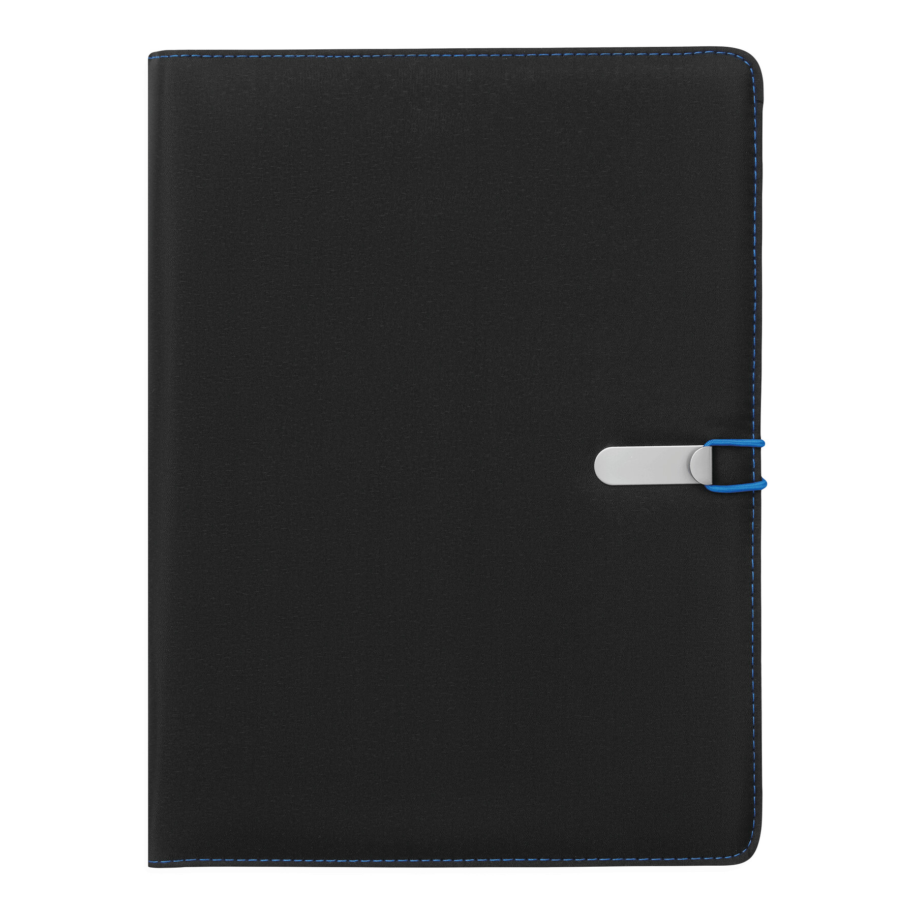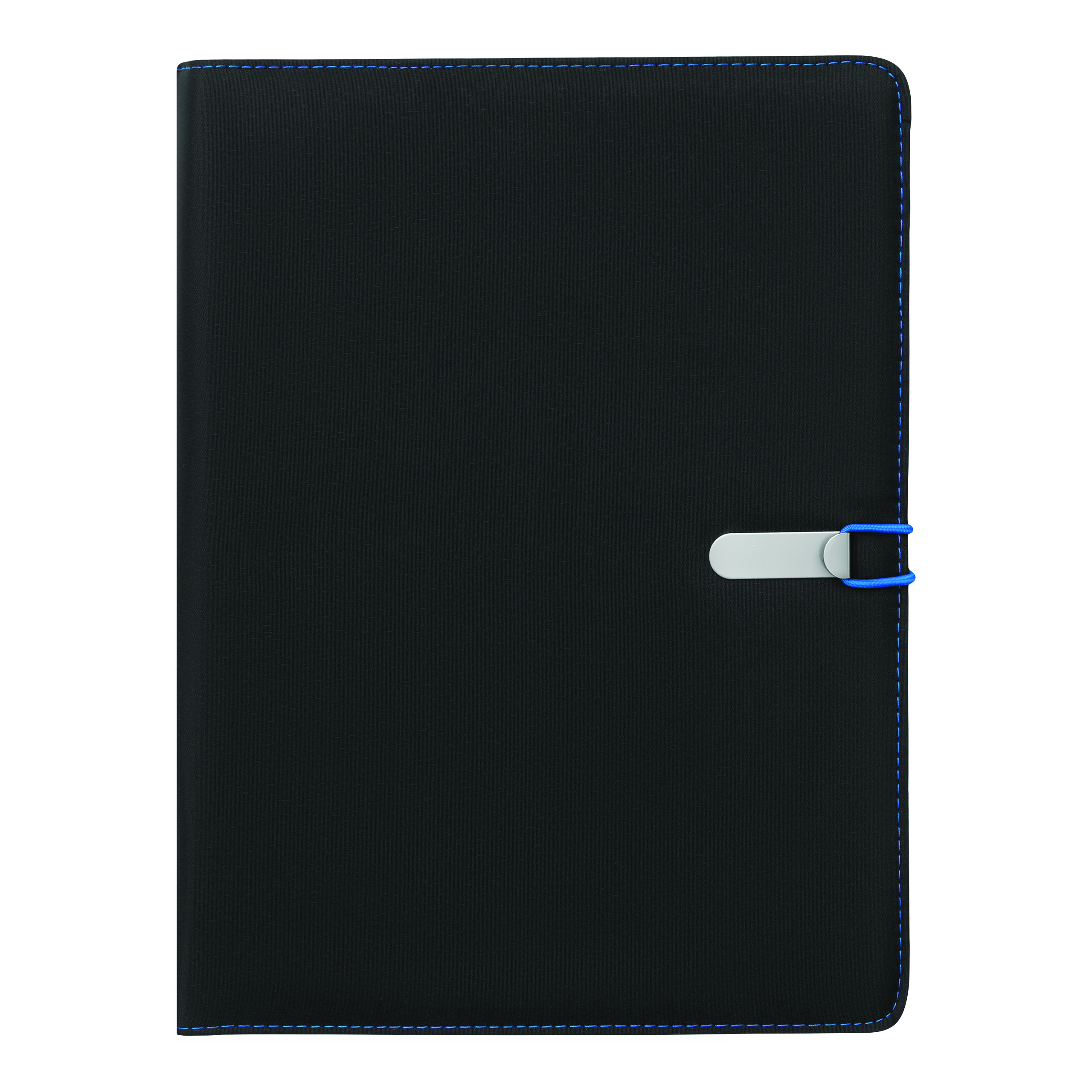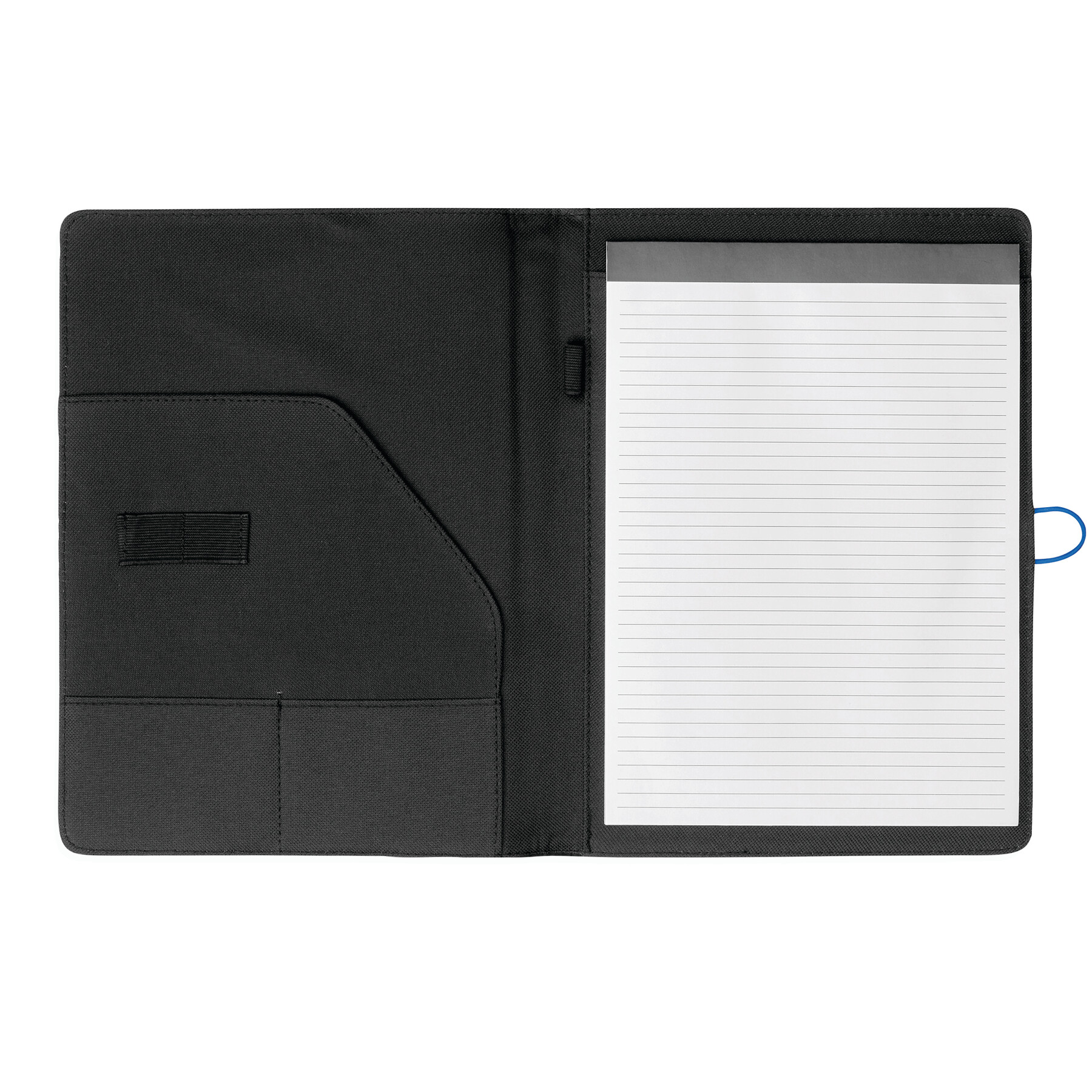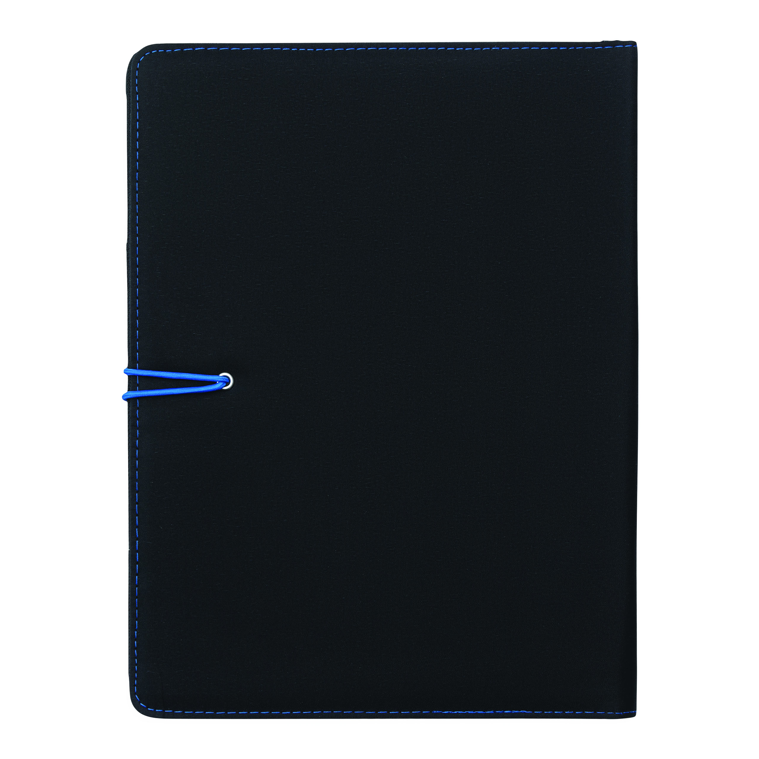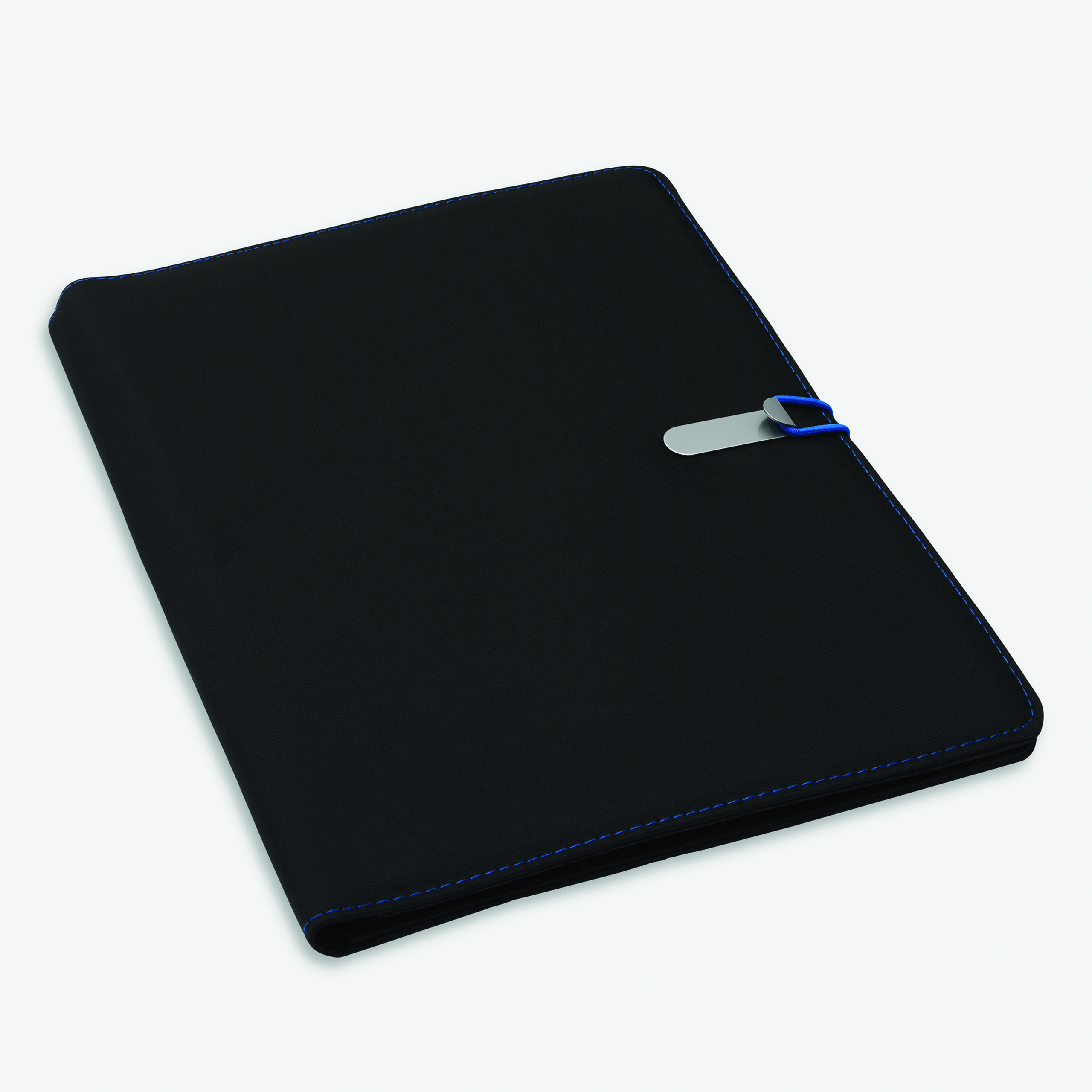Portfolio SESSION w formacie A4, zawiera notes, pętelkę na przybory do pisania, różne wsuwane kieszenie, metalowy haczyk z kolorową gumką do zamknięcia.