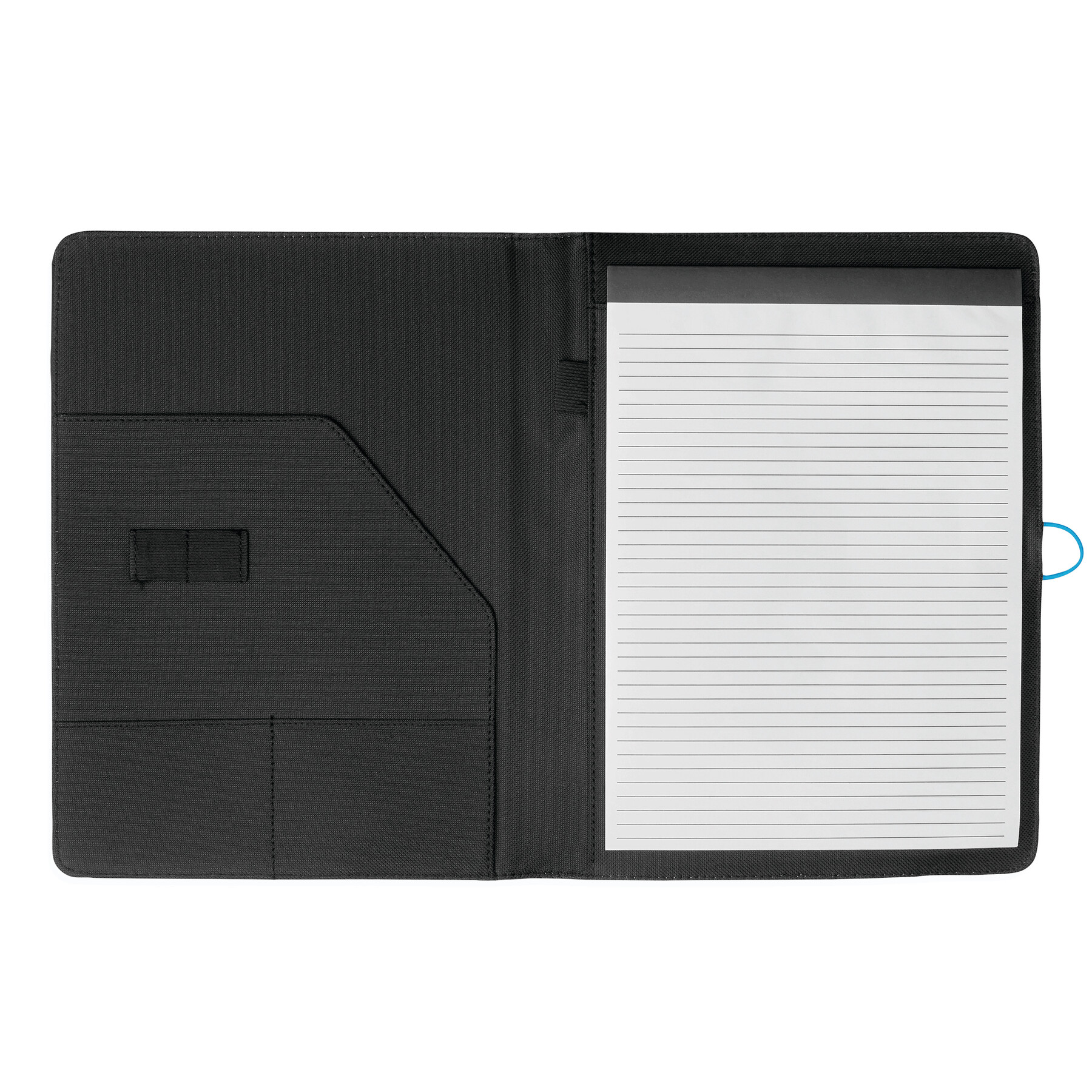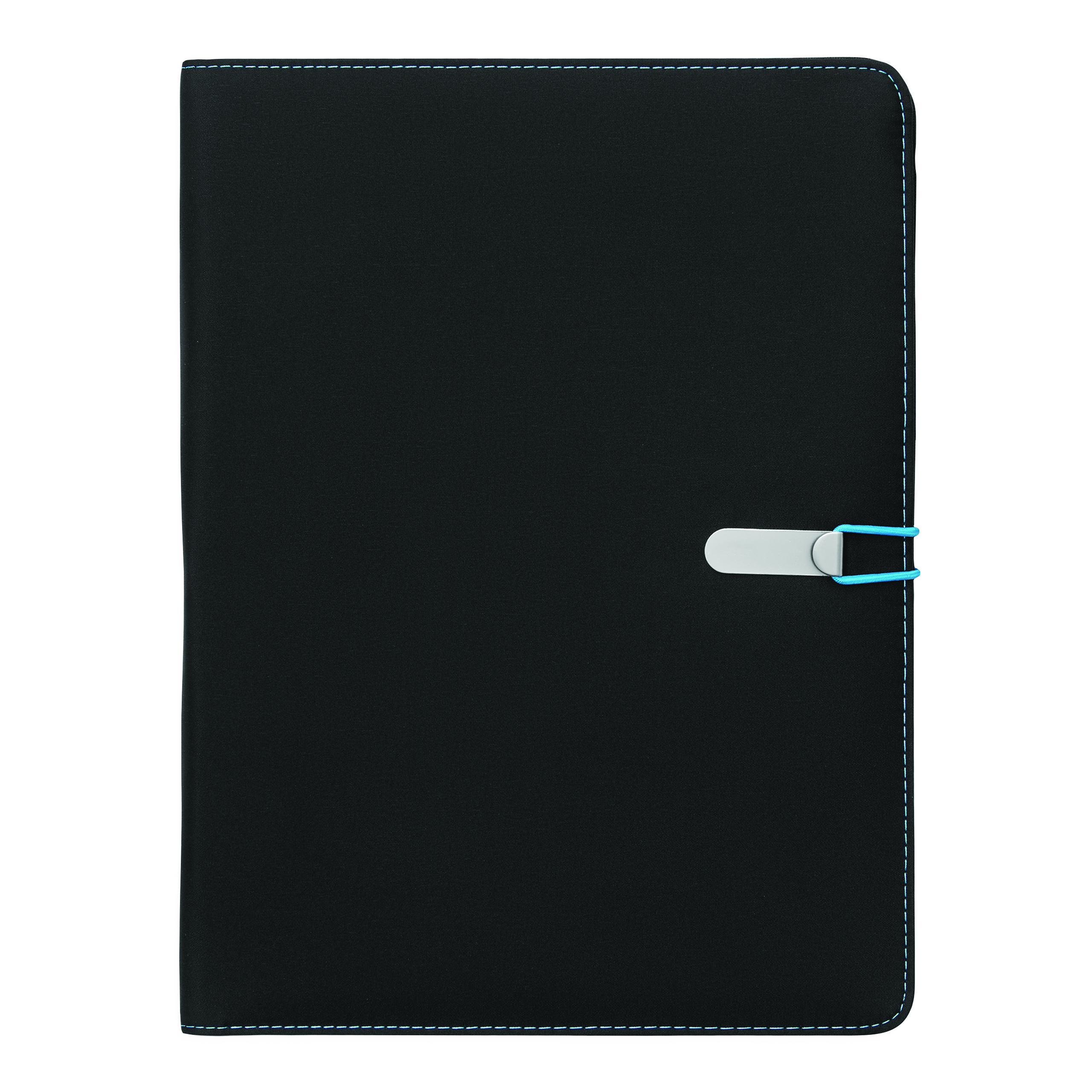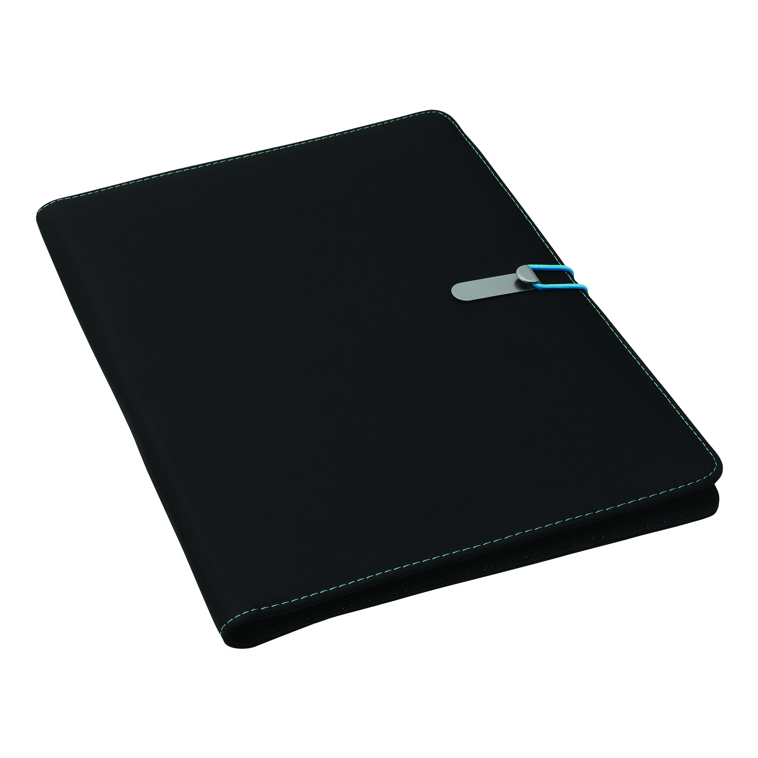 Portfolio SESSION w formacie A4, zawiera notes, pętelkę na przybory do pisania, różne wsuwane kieszenie, metalowy haczyk z kolorową gumką do zamknięcia.