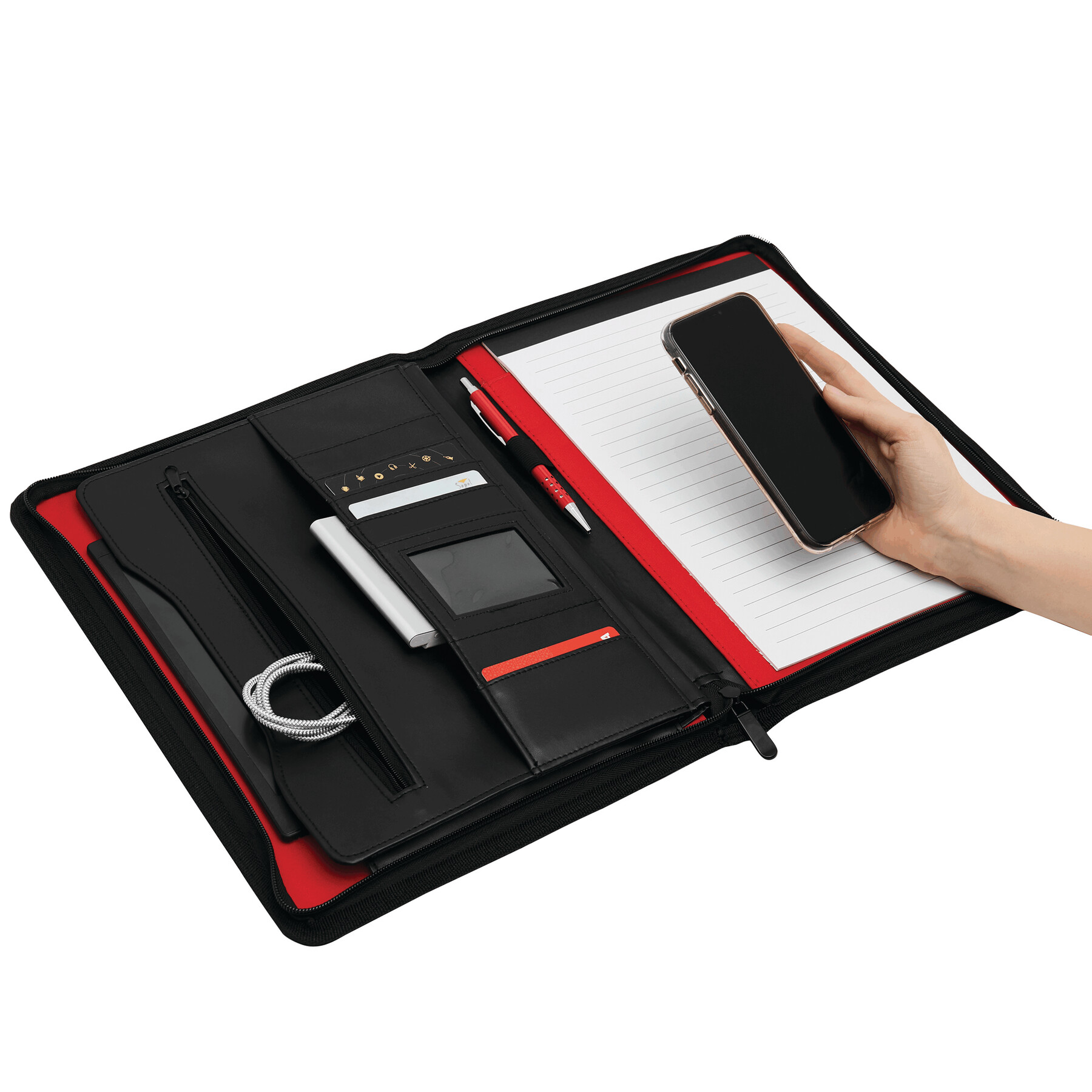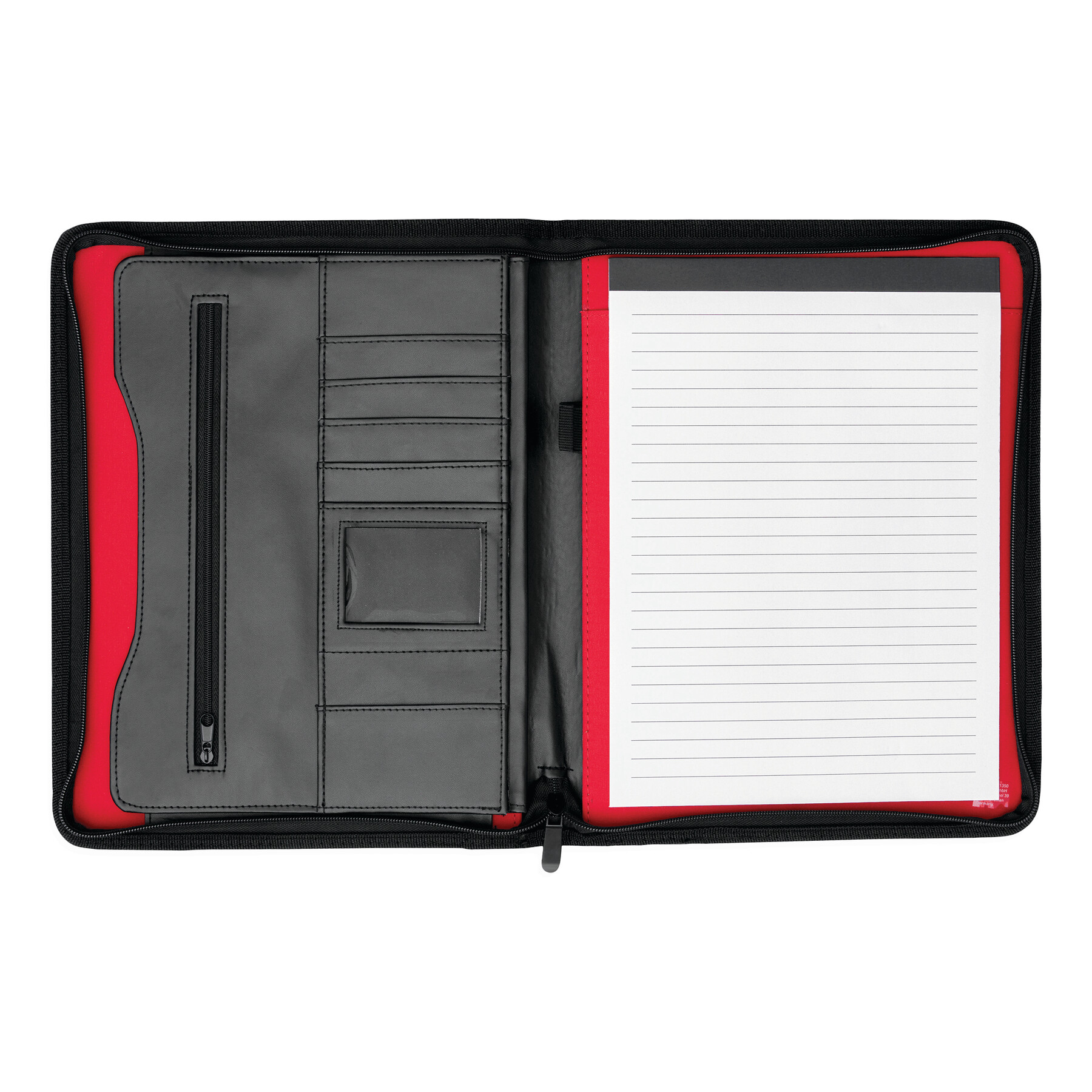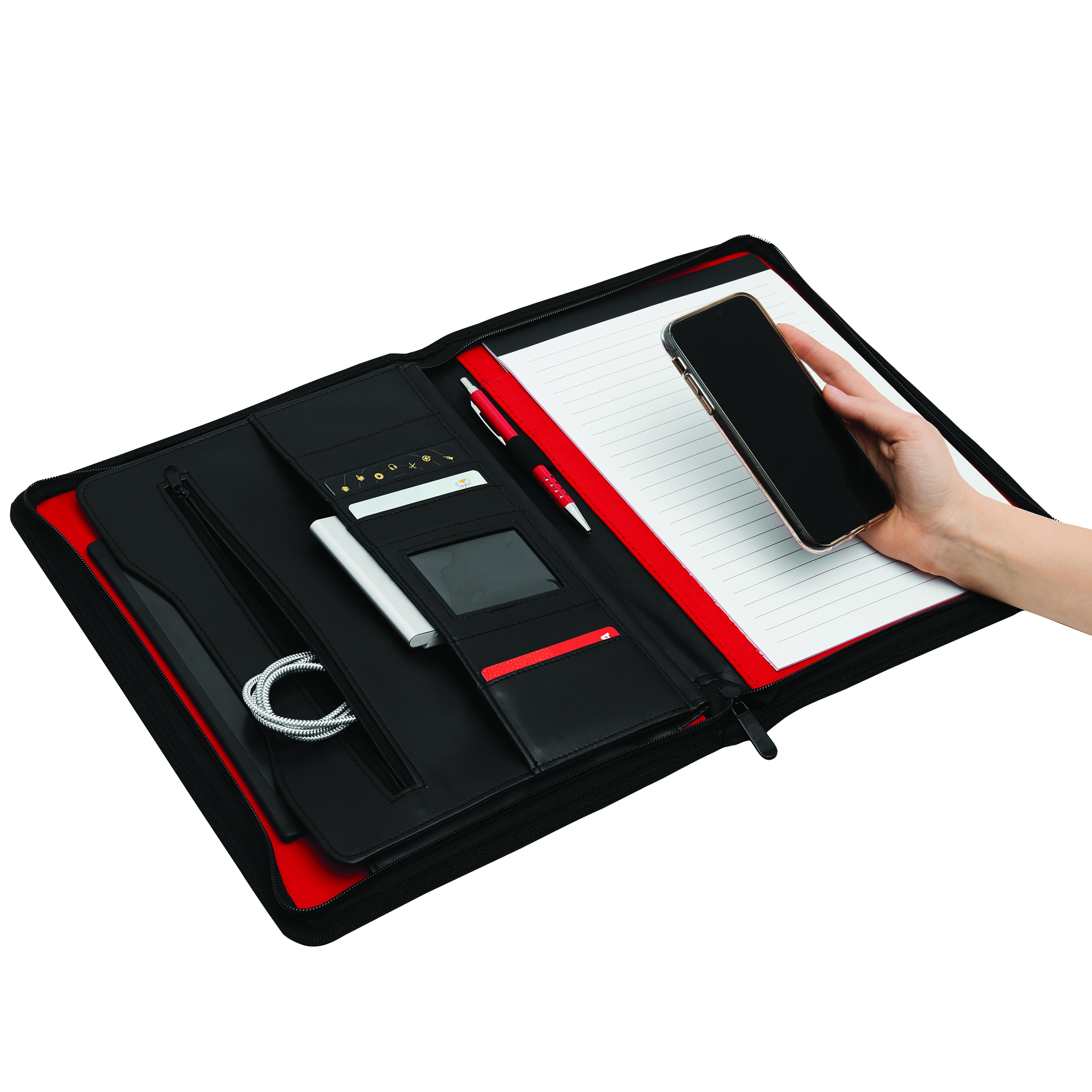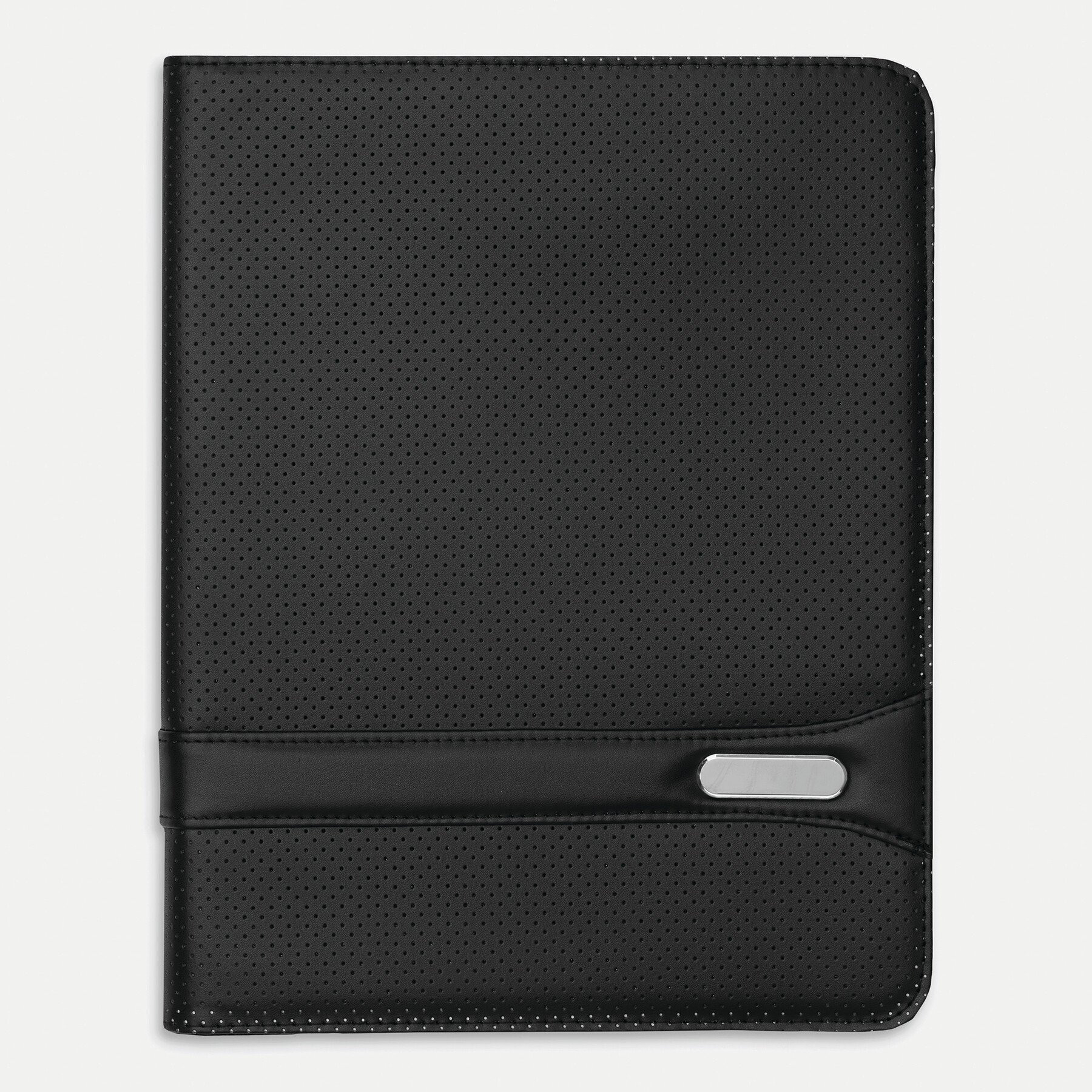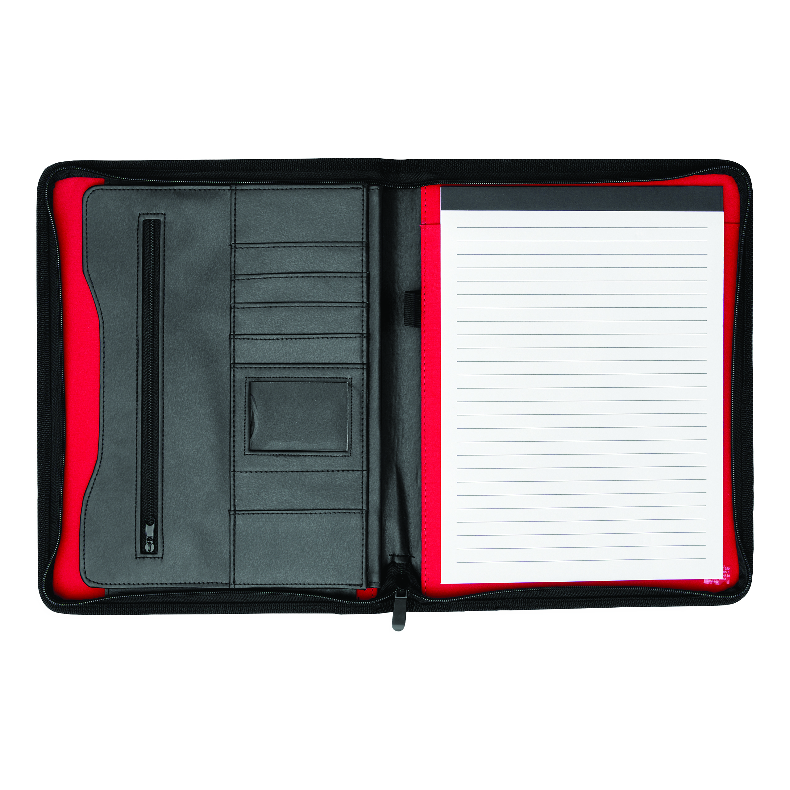 Portfolio MANHATTAN w formacie A4, zapięcie na suwak, wewnątrz wsuwane kieszonki, 1 przezroczysta kieszeń, kieszeń na suwak, z notesem, oczkiem na długopis, metalowa płytka na reklamę.