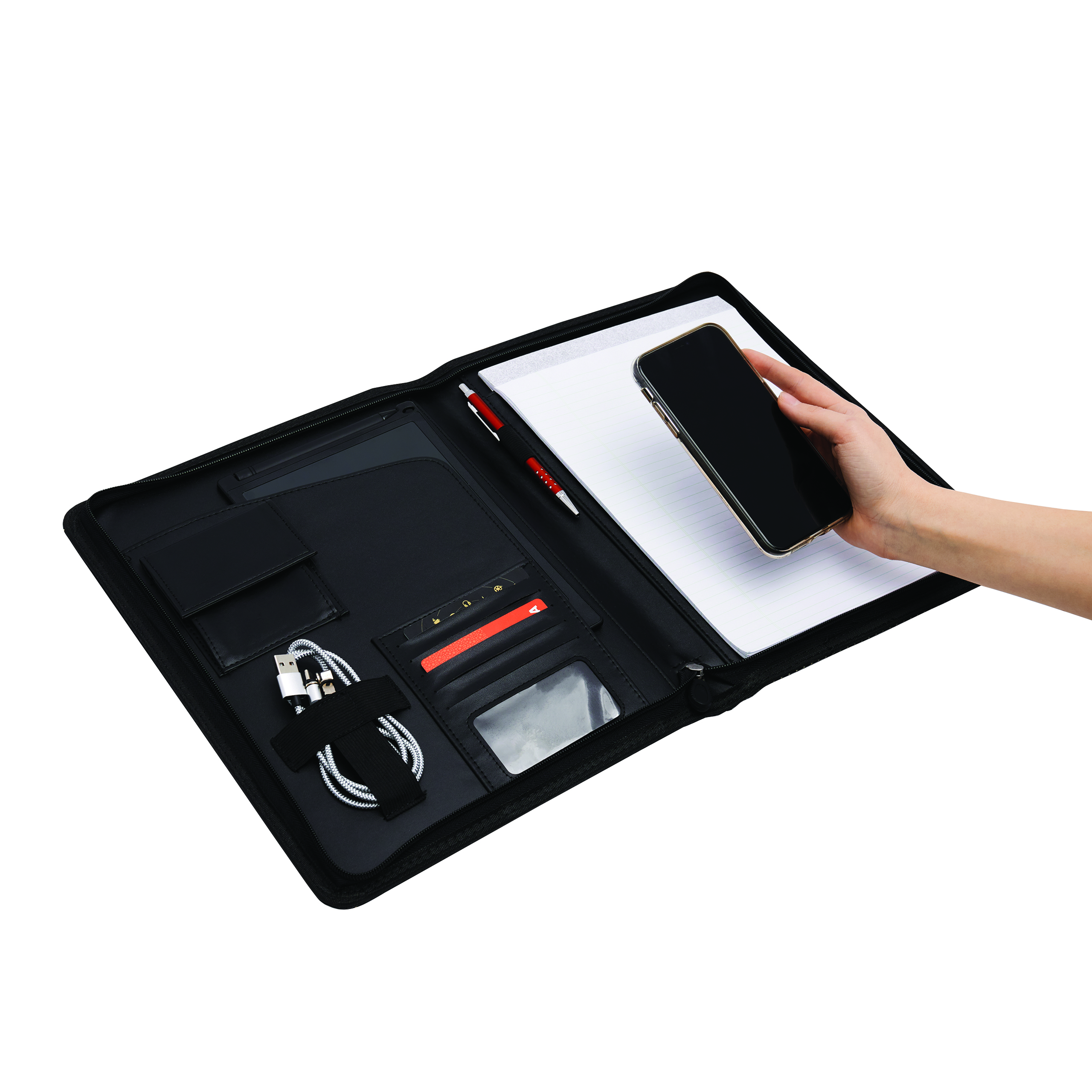 Portfolio HILL DALE ZIP w formacie A4, wewnątrz różne wsuwane kieszonki, 1 mała kieszonka zapinana na zatrzask, elastyczna opaska na powerbank itp., zawiera notes w linie, pętelkę na długopis – na zewnątrz perforowany wzór, z metalową płytką na Twoje logo.