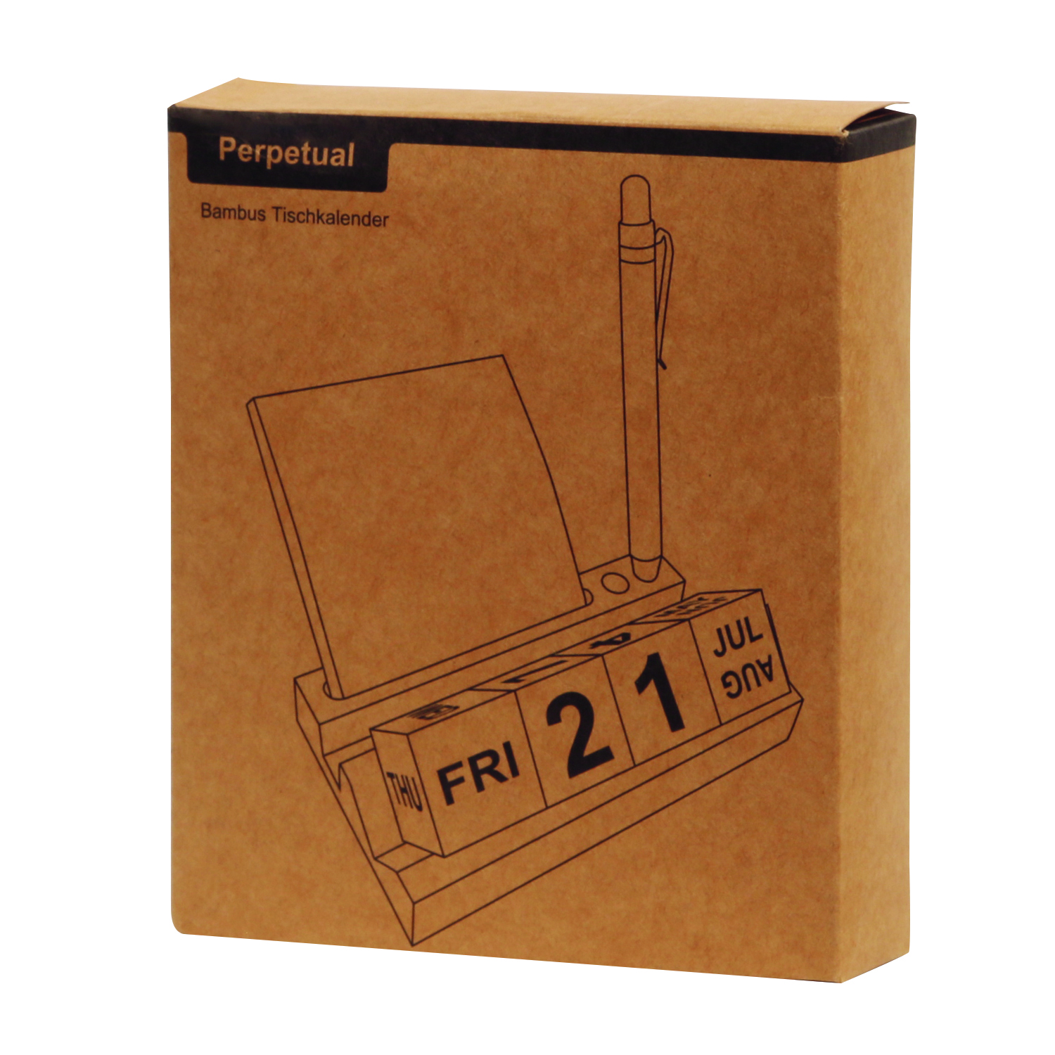 Bambusowy notatnik PERPETUAL z bezterminowym kalendarzem. Składa się z 4 drewnianych kostek z wygrawerowanymi elementami daty (dni tygodnia, dni miesiąca i nazwy miesięcy) w języku angielskim, uchwytu na telefon, 50 karteczek na notatki (70 g/m²), bambusowego długopisu z metalowym klipsem (czarny tusz) i miejscem na 2 długopisy. Zapakowany jest w pudełko.