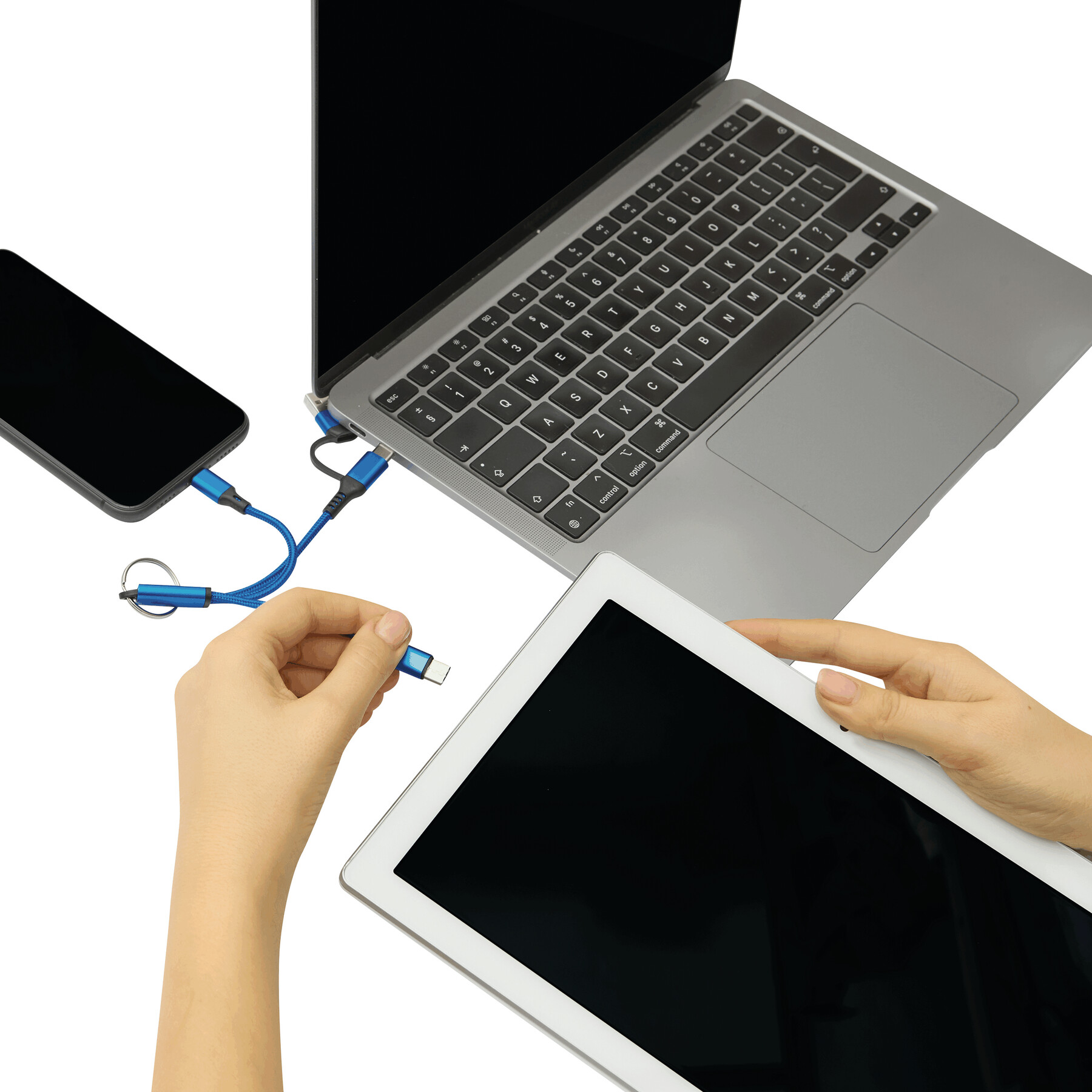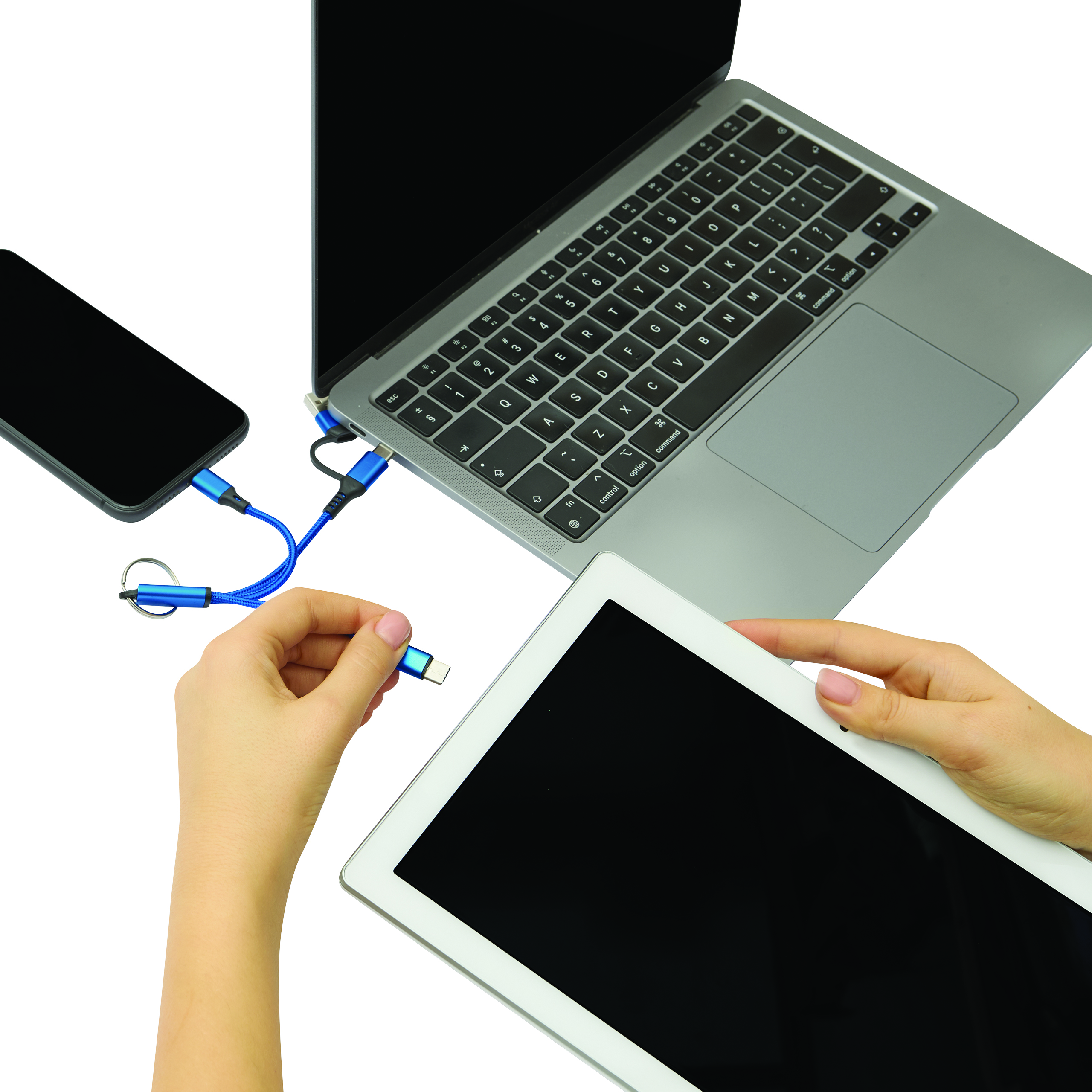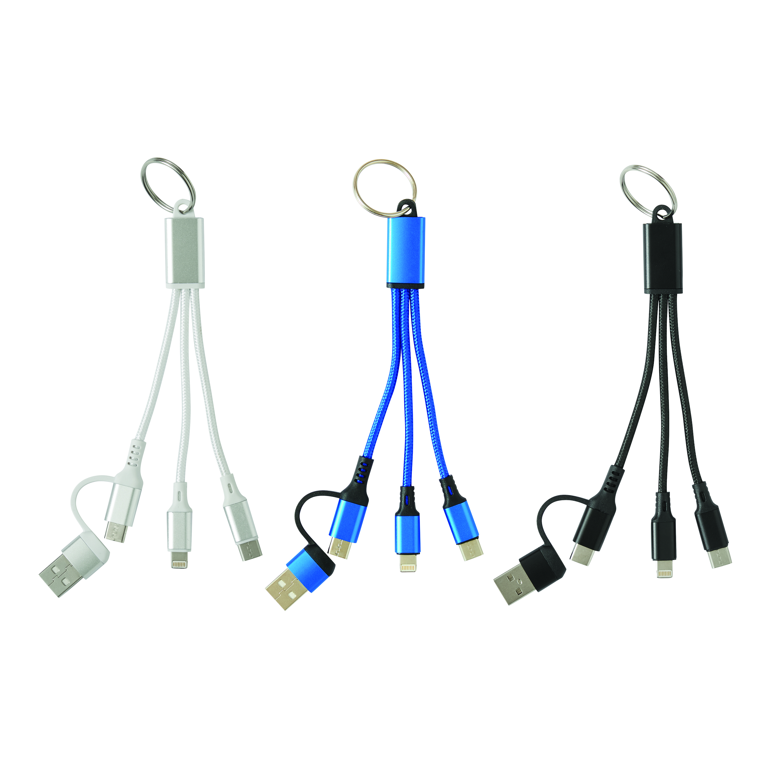 Kabel ładujący FANTAIL do ładowania urządzeń elektronicznych. Ma długość ok. 18 cm oraz breloczek na klucze. Zawiera wtyczkę wejściową USB-C, adapter do USB-A oraz 2 wtyczki do ładowania - USB-C iwtyczkę Micro-USB/Lightning®.