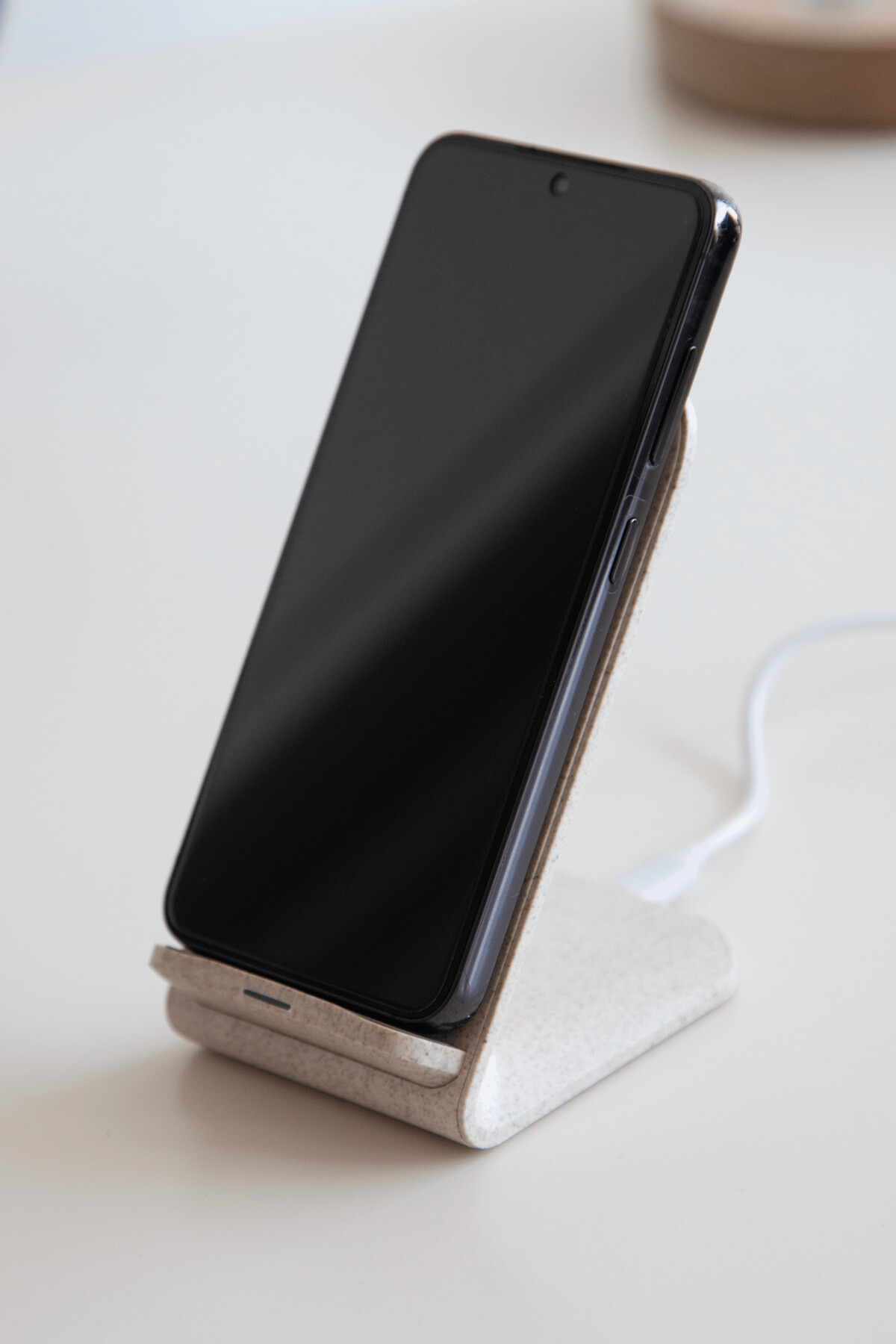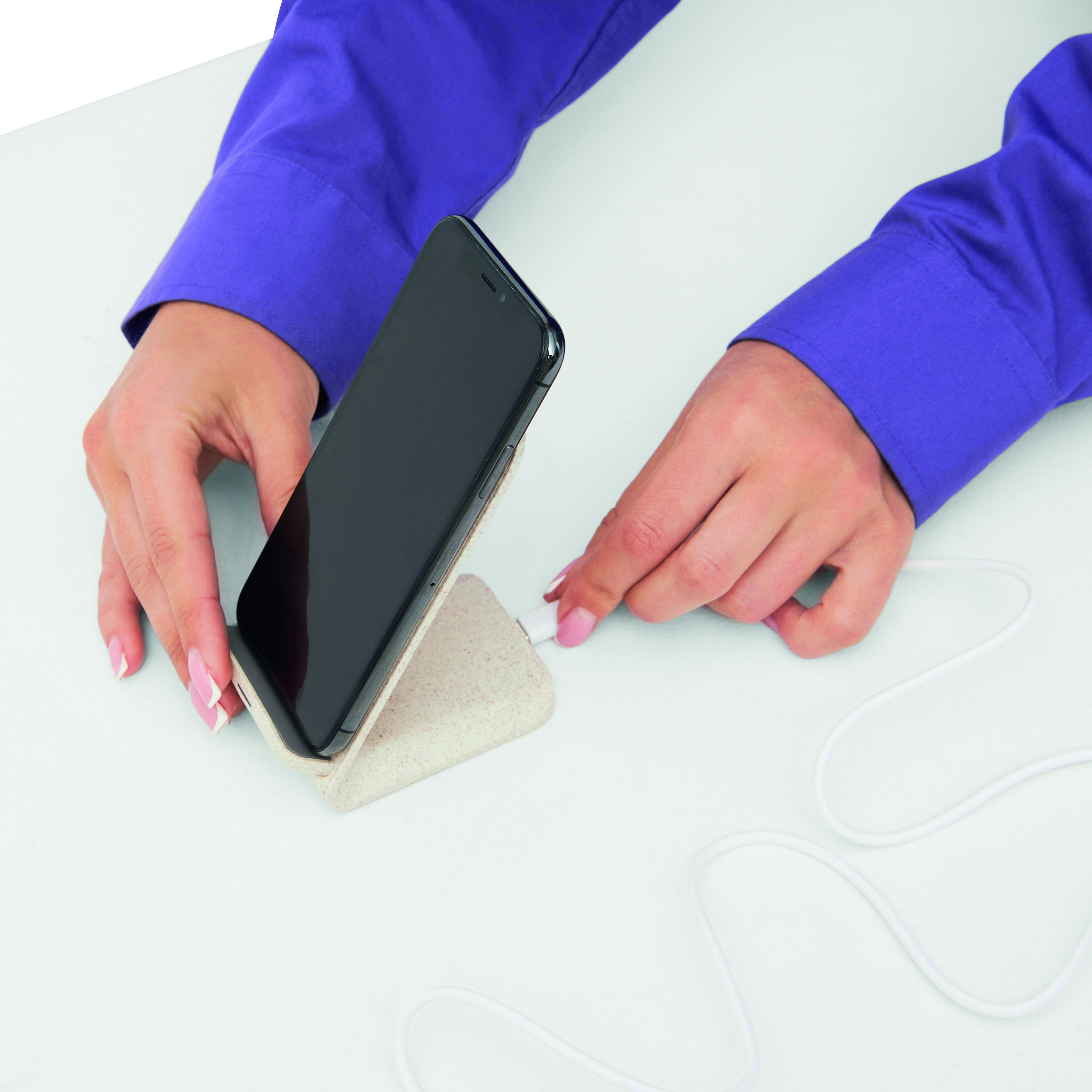 Bezprzewodowa stacja ładująca INDUCTIVE: podstawka wykonana w 35% ze słomy pszennej i w 65% z ABS, bezprzewodowe ładowanie urządzenia poprzez umieszczenie na powierzchni ładującej (urządzenie musi być przystosowane do ładowania indukcyjnego), kabel USB z wtyczką USB Type-C (długość ok. 102 cm), wskaźnik świeci na niebiesko podczas procesu ładowania i na zielono po jego zakończeniu, zasilanie wejściowe: 5 V/9 V, 2 A, moc wyjściowa: 15 W, 4 nóżki w podstawie, funkcja automatycznej kontroli temperatury i wykrywania niepożądanych obiektów zapobiega przegrzewaniu i marnotrawieniu energii.