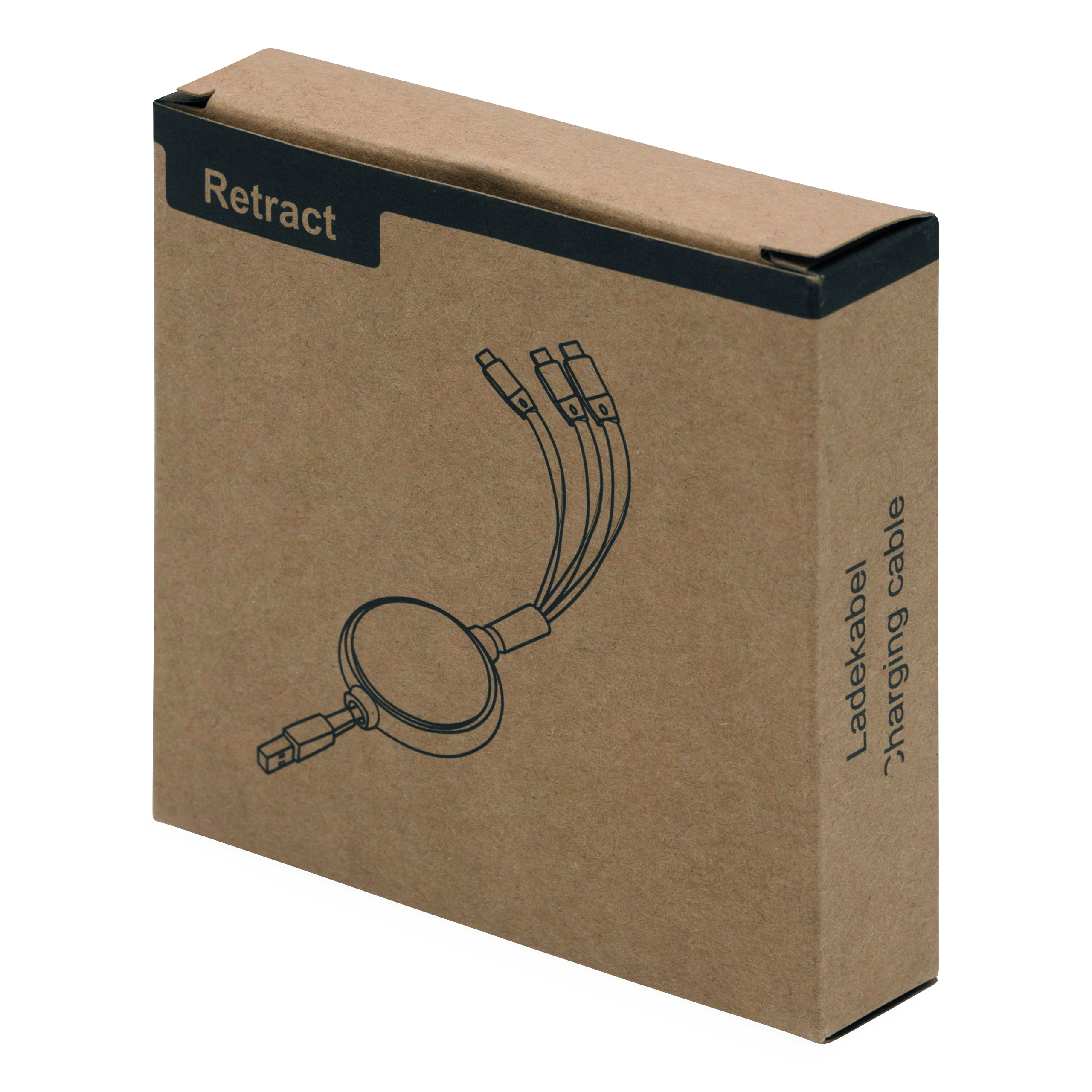 Kabel ładujący RETRACT o długości ok. 100 cm. Zwijany, z 3 złączami do ładowania popularnych urządzeń elektronicznych i smartfonów: USB Type-C, Micro-USB i Lightning®.