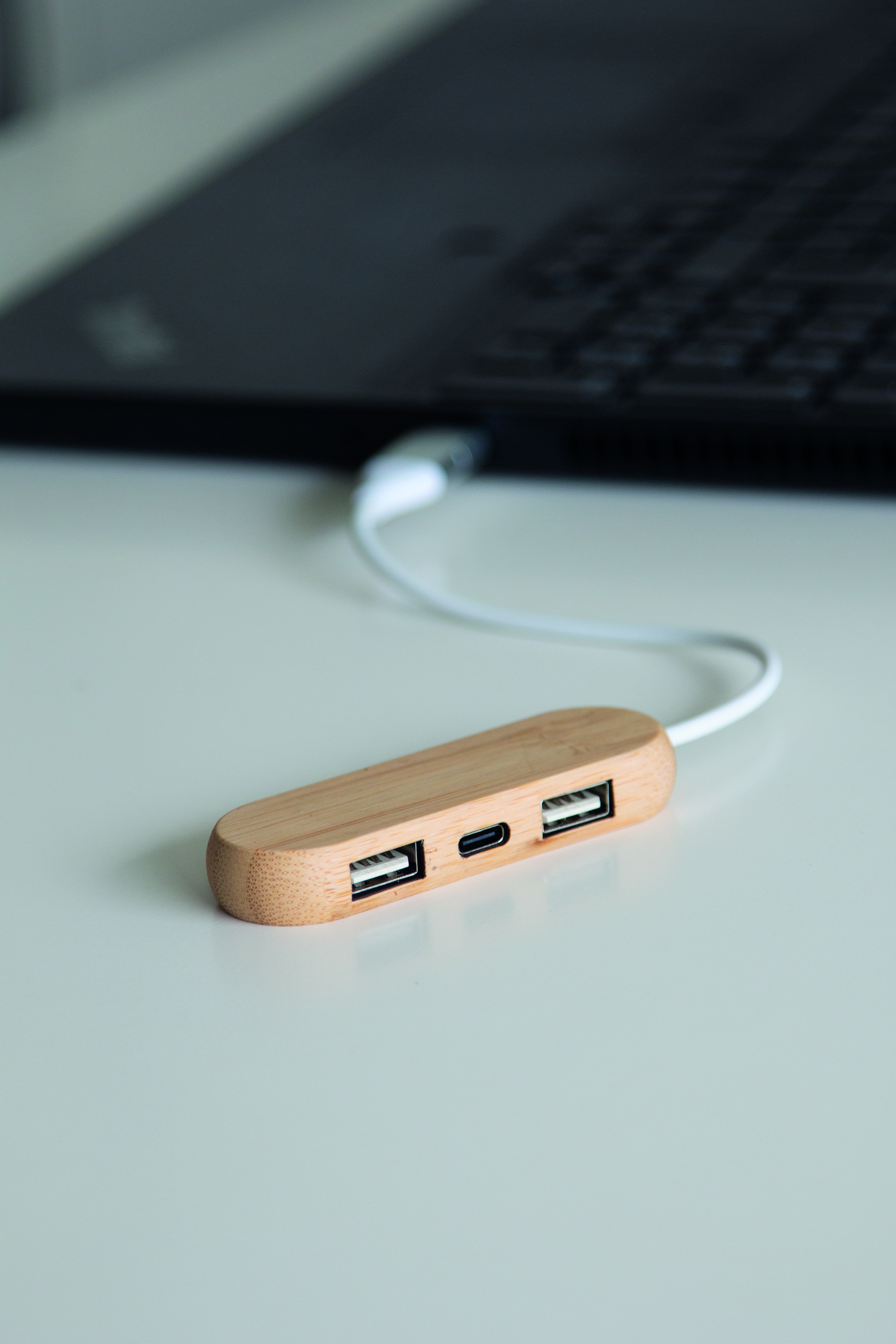 USB hub MULTIPLIER: w bambusowej obudowie, 2 porty USB 2.0 i 1 port USB Type-C, długość kabla ok. 21,5 cm, połączona wtyczka wejściowa USB A / USB C.
