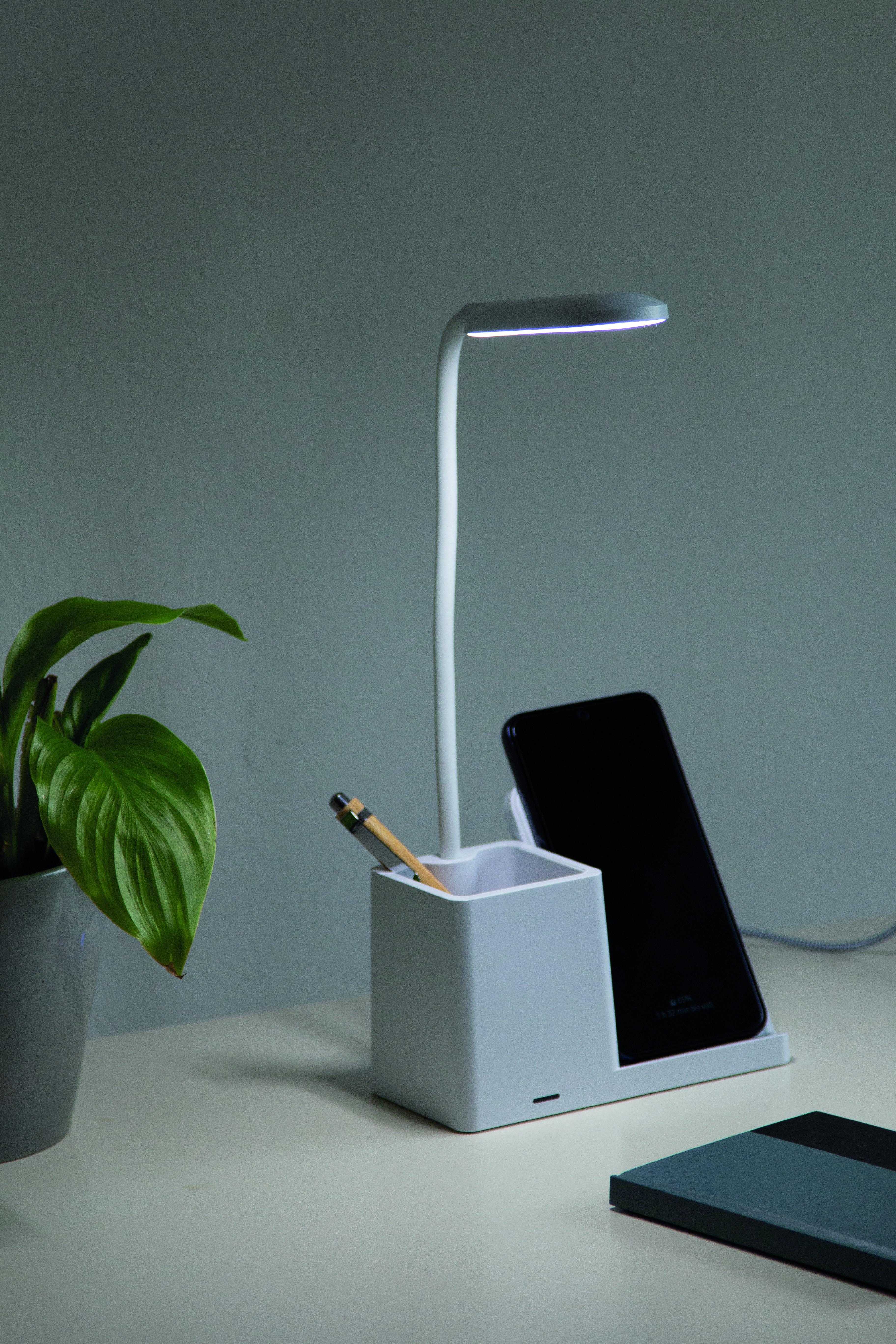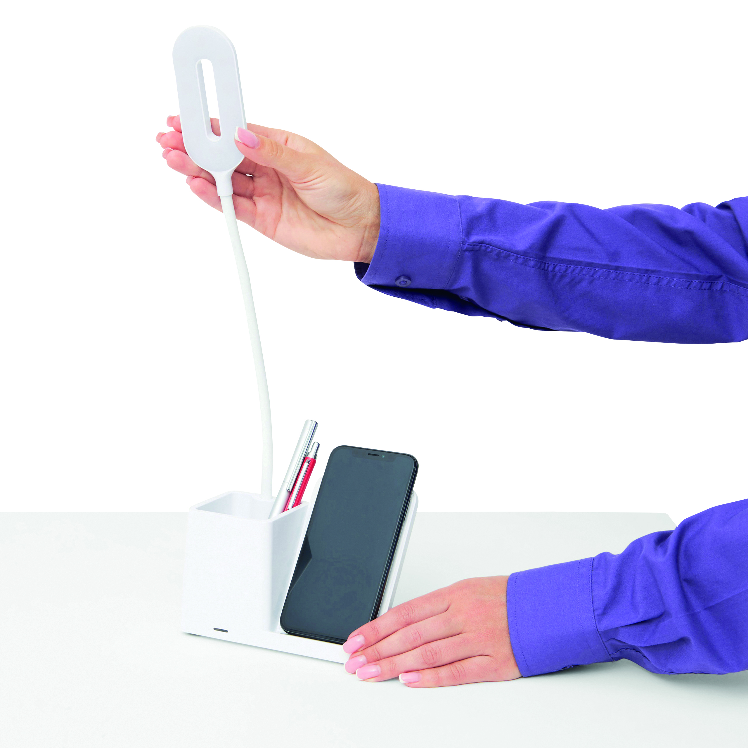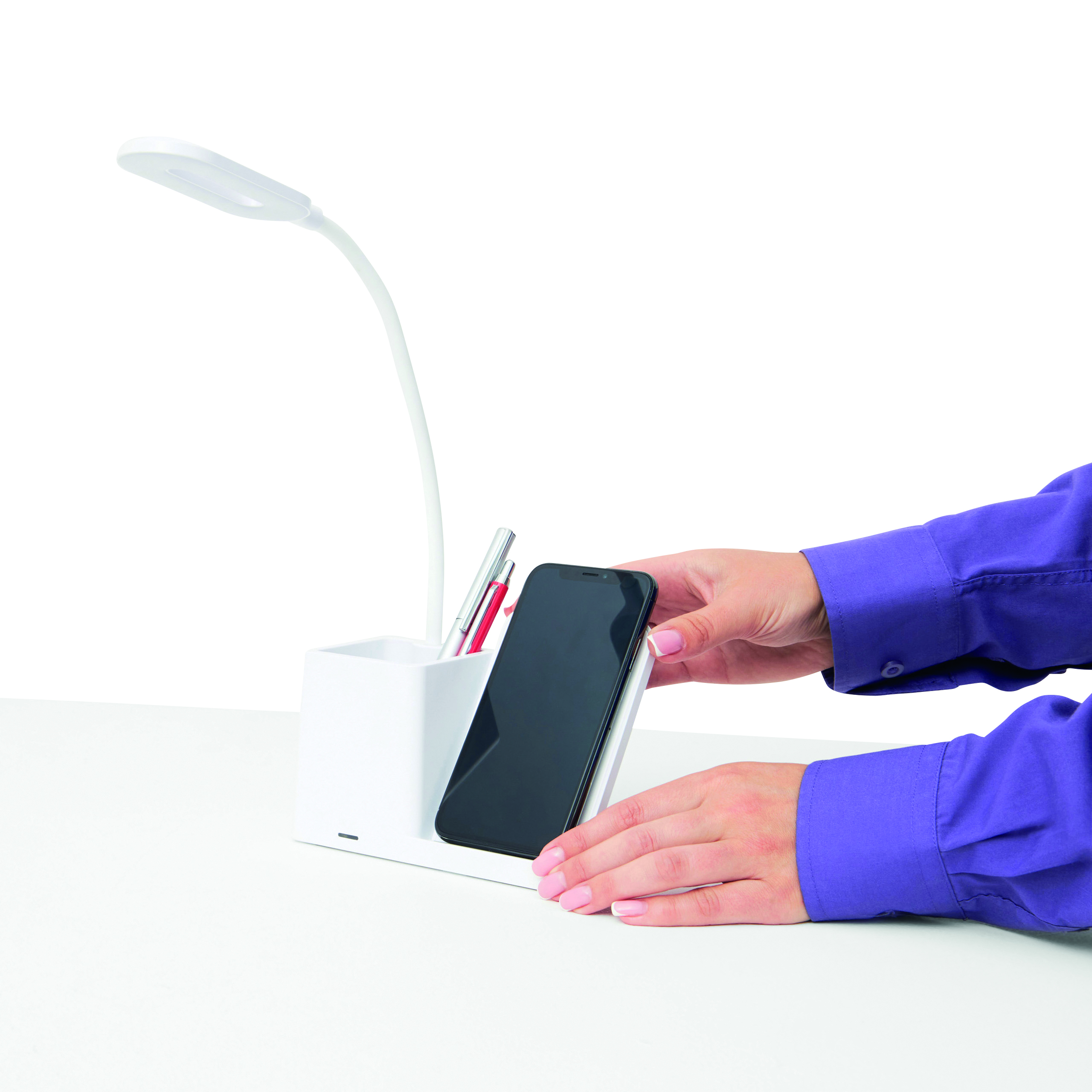 Lampa biurkowa ze stacją ładującą LIGHT & CHARGE: elastyczne obrotowe (360°) ramię lampy z 10 ciepłobiałymi i 10 chłodnobiałymi diodami LED, dotykowe włączanie/wyłączanie, uchwyt na długopis i bezprzewodowa stacja ładująca. Bezprzewodowe ładowanie urządzenia poprzez umieszczenie na powierzchni styku (urządzenie musi być przystosowane do ładowania indukcyjnego), kabel USB z wtyczką USB C (długość ok. 102 cm), wskaźnik pracy, moc wejściowa: 5 V/9 V, 2 A, moc wyjściowa: maks. 10 W, 4 antypoślizgowe nóżki w podstawie, funkcja automatycznej kontroli temperatury i wykrywania niepożądanych obiektów zapobiega przegrzewaniu i marnotrawieniu energii.