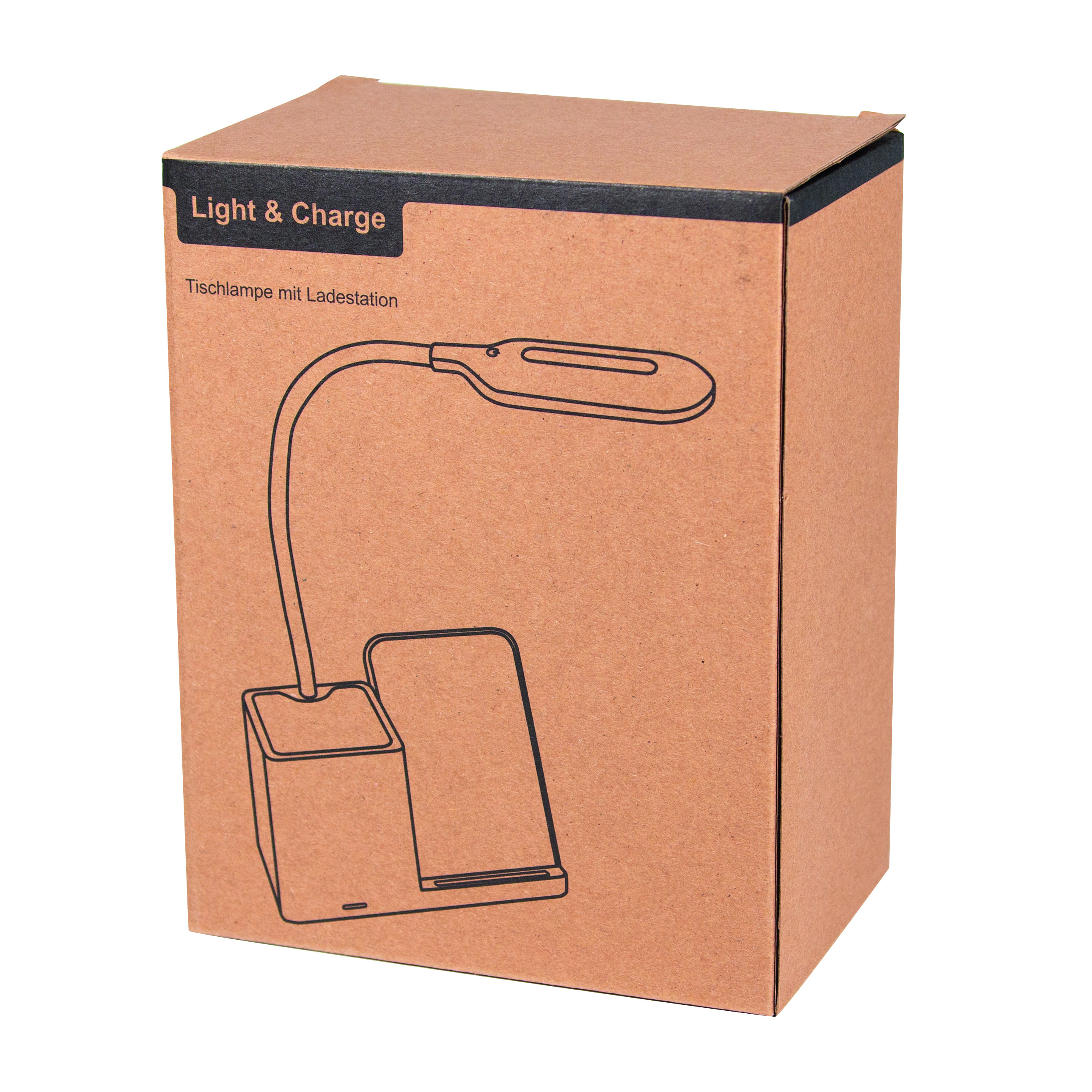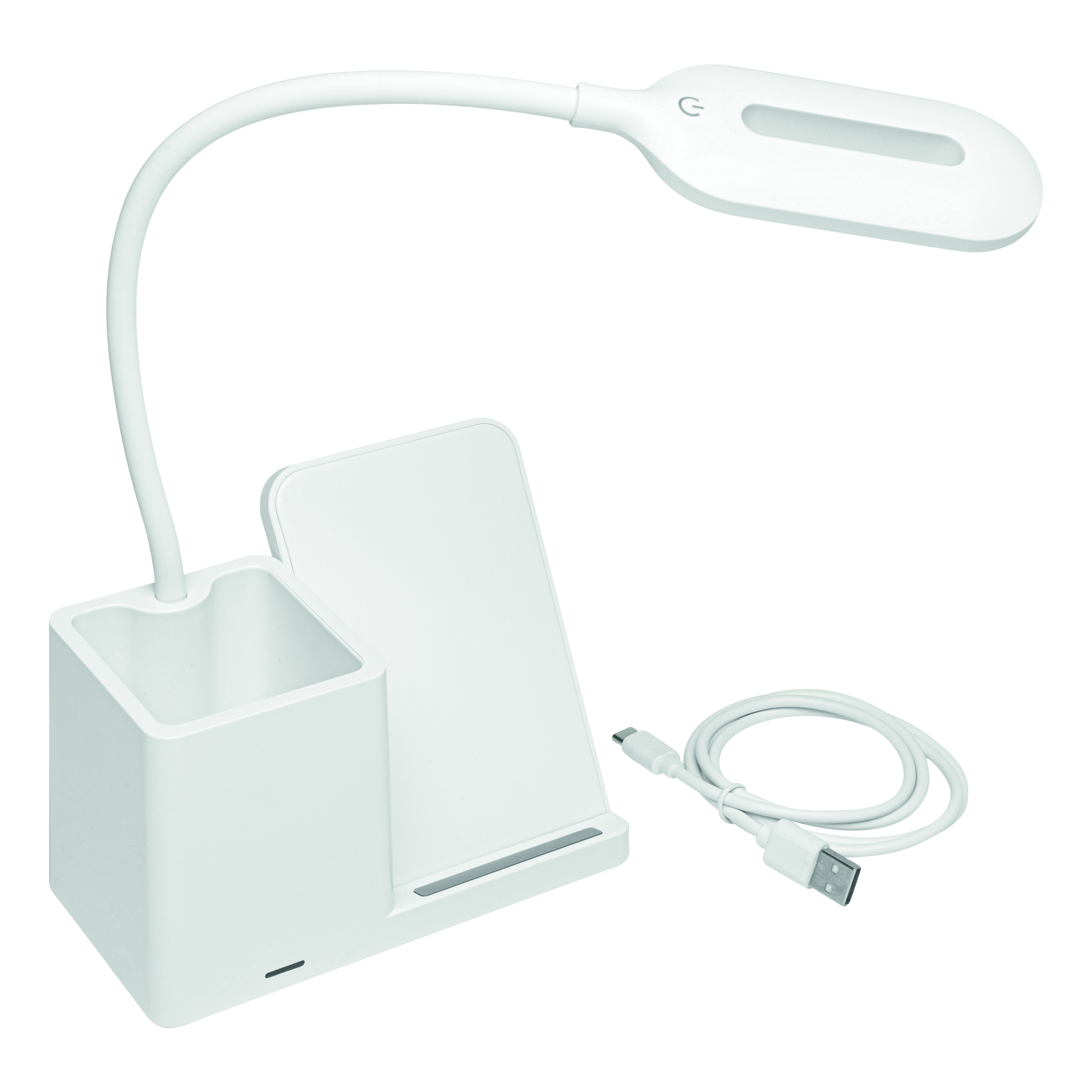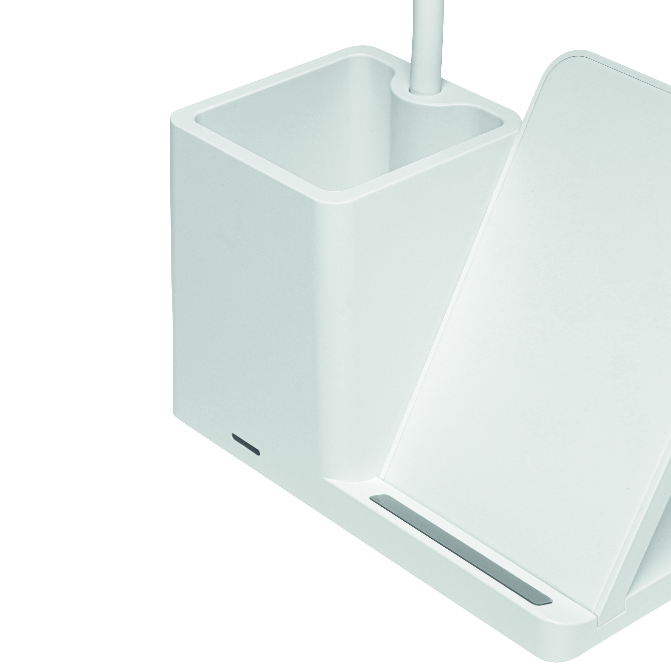 Lampa biurkowa ze stacją ładującą LIGHT & CHARGE: elastyczne obrotowe (360°) ramię lampy z 10 ciepłobiałymi i 10 chłodnobiałymi diodami LED, dotykowe włączanie/wyłączanie, uchwyt na długopis i bezprzewodowa stacja ładująca. Bezprzewodowe ładowanie urządzenia poprzez umieszczenie na powierzchni styku (urządzenie musi być przystosowane do ładowania indukcyjnego), kabel USB z wtyczką USB C (długość ok. 102 cm), wskaźnik pracy, moc wejściowa: 5 V/9 V, 2 A, moc wyjściowa: maks. 10 W, 4 antypoślizgowe nóżki w podstawie, funkcja automatycznej kontroli temperatury i wykrywania niepożądanych obiektów zapobiega przegrzewaniu i marnotrawieniu energii.