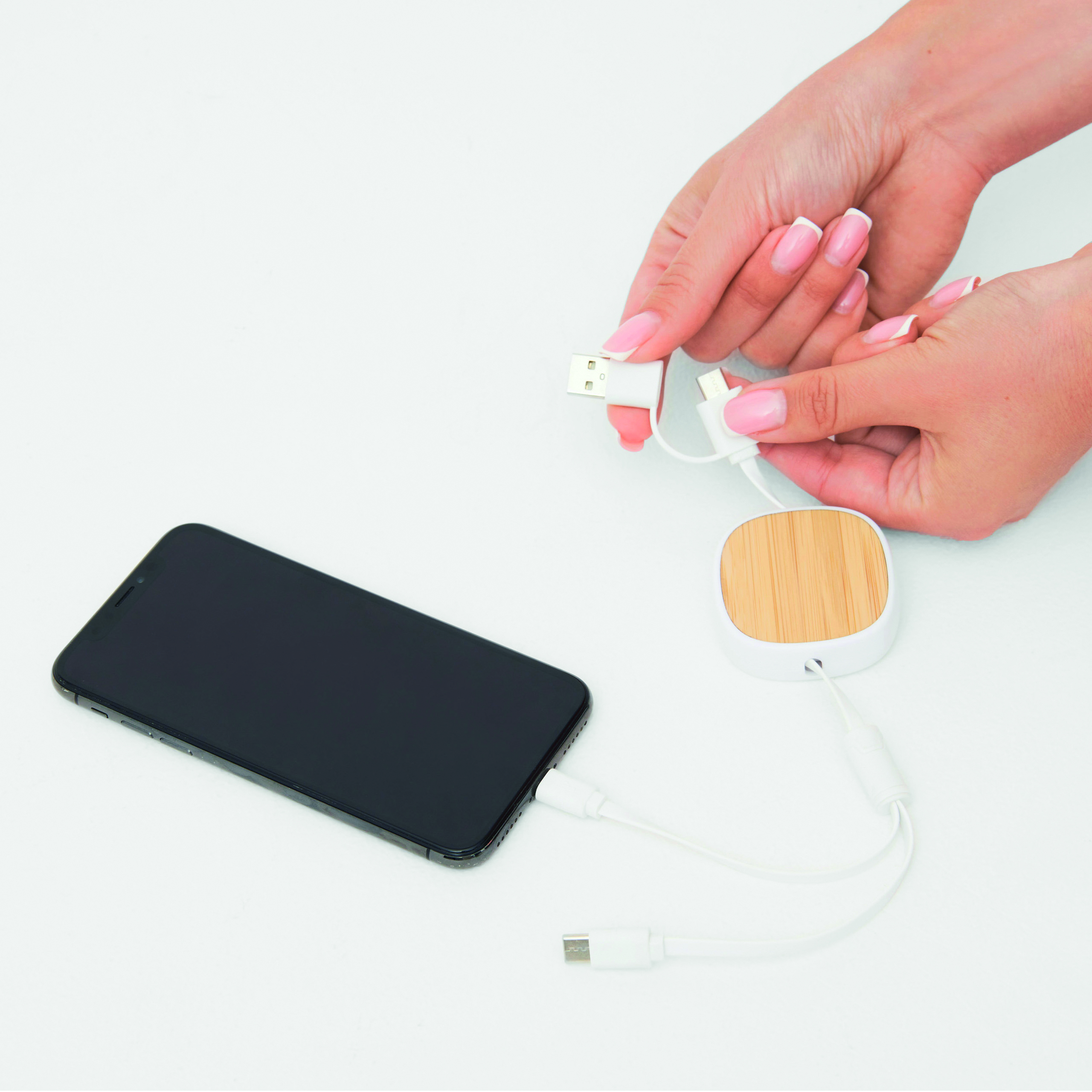Kabel ładujący ROLL ON, zwijany (długość ok. 92 cm): z 2 wtyczkami do ładowania popularnych urządzeń elektronicznych i smartfonów: USB C i 5-pinowym złączem Lightning®/Micro-USB, wtyczką wejściową USB A/C, bambusową płytką do znakowania.
