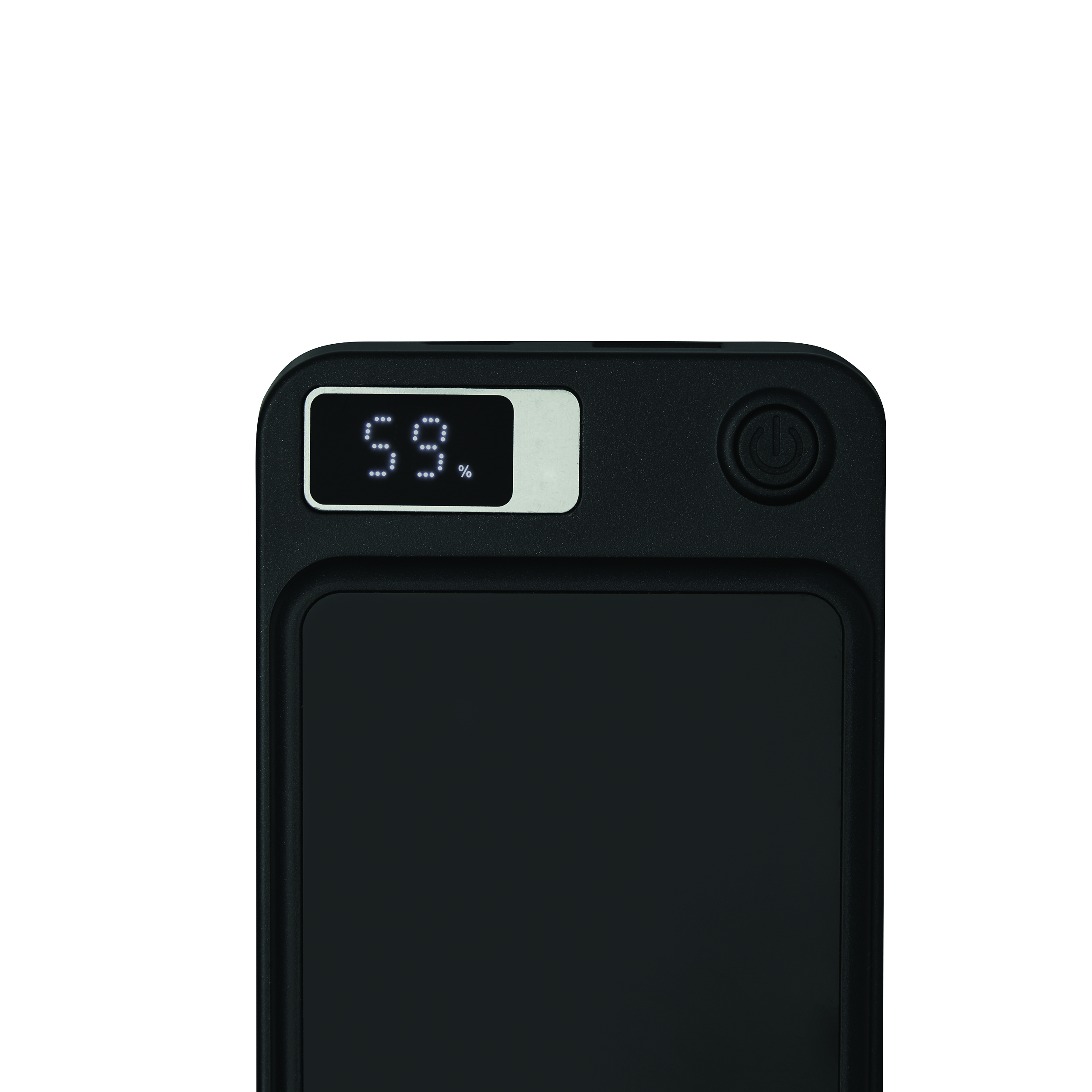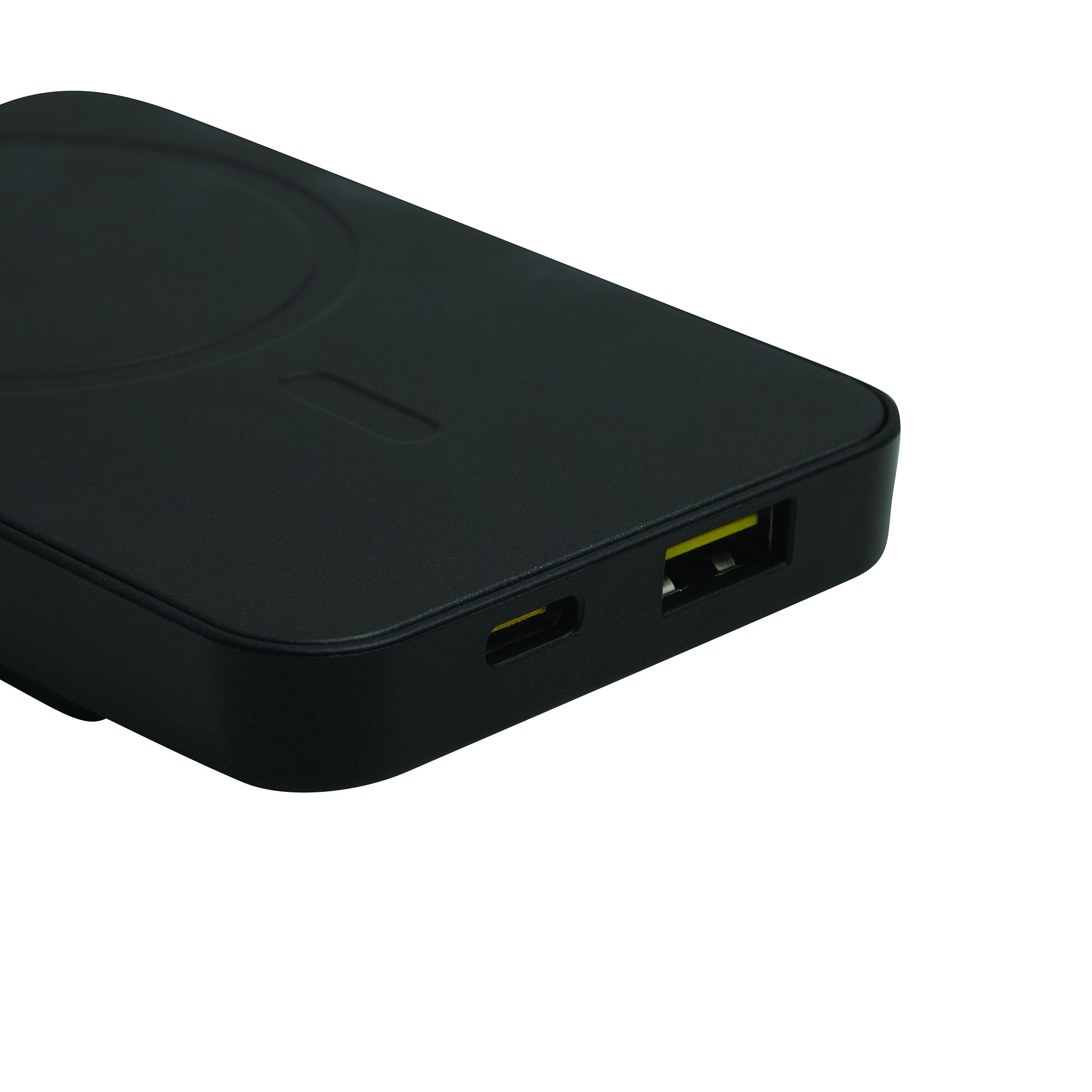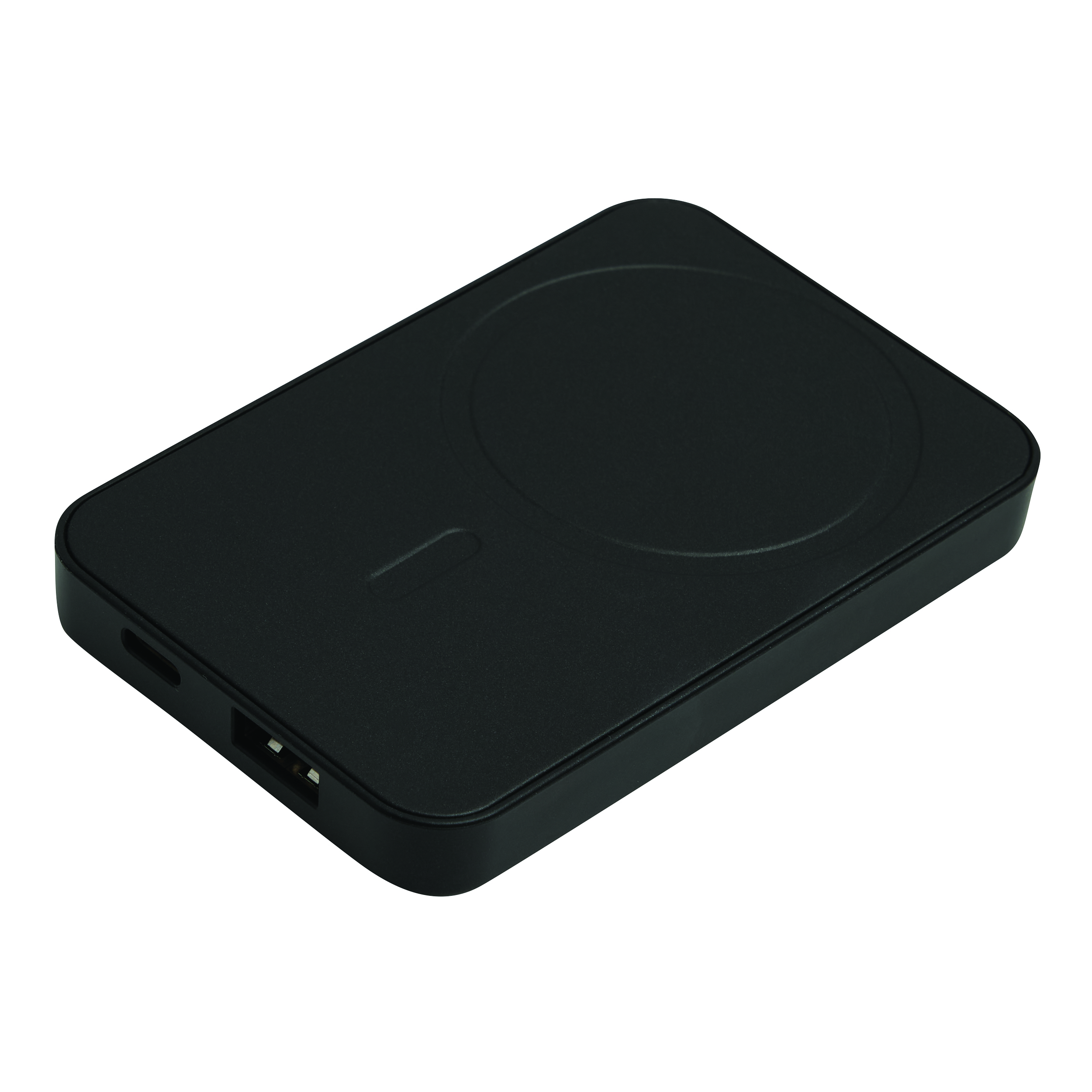 Powerbank MAGNET. Odpowiedni do smartfonów i urządzeń USB. Umożliwia bezprzewodowe ładowanie urządzenia poprzez umieszczenie go na powierzchni styku (tylko dla urządzeń przystosowanych do ładowania indukcyjnego). Dzięki sile magnetycznej trzyma się powerbanku (w zależności od urządzenia). Posiada on wskaźnik poziomu naładowania w procentach, mocną baterię o pojemności 5000 mAh oraz złącza USB-C i USB-A. Jego moc wejściowa to 5V/2A, a wyjściowa – 5V/2A. W zestawie jest także kabel z wtyczką USB-C o długości ok. 30 cm.