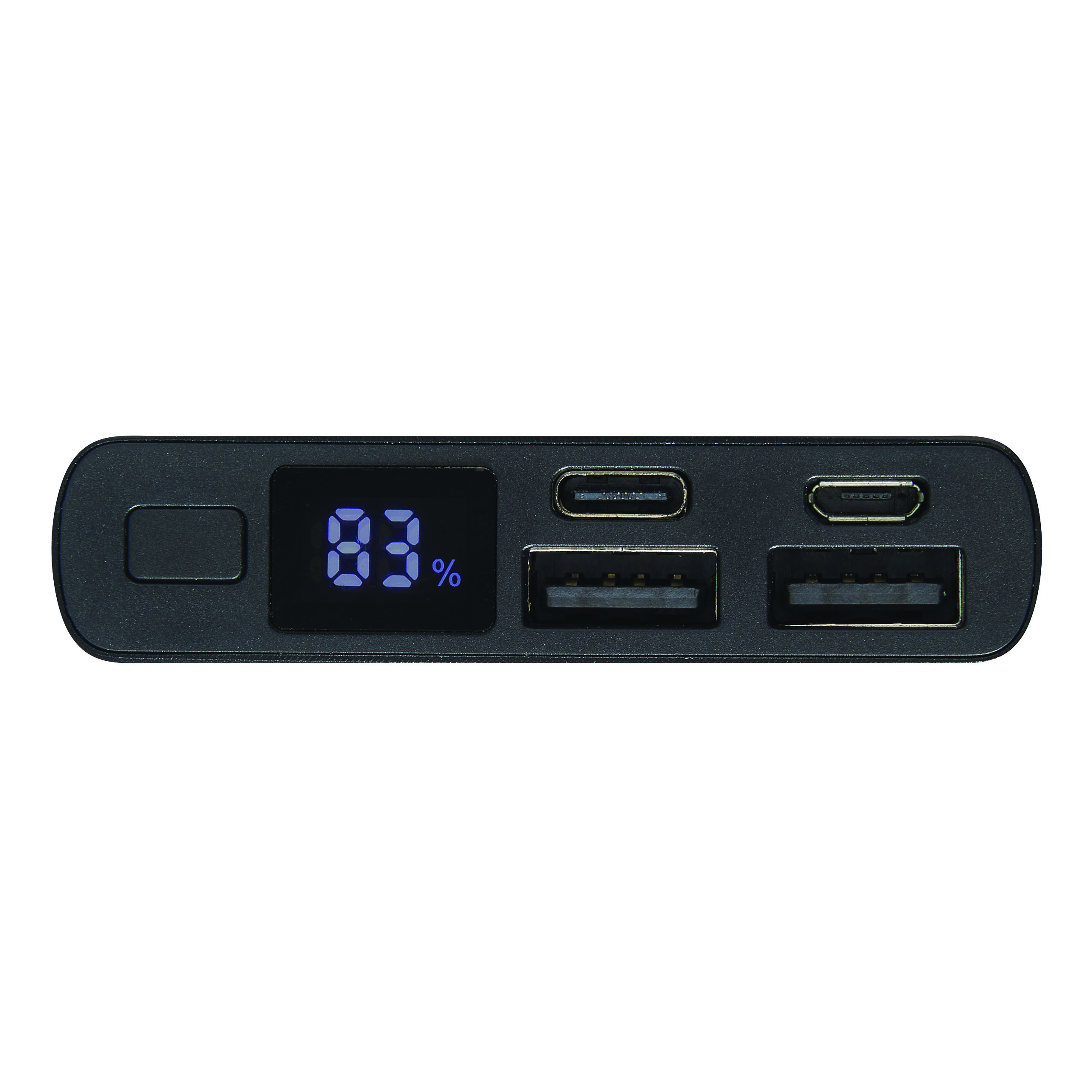 zawiera kabel do ładowania USB ze złączem USB Typu-C (długość: ok. 30 cm), ze wskaźnikiem poziomu baterii w procentach, włącznikiem/wyłącznikiem zasilania, 1 wejściem/wyjściem USB Typu-C, 1 wejściem Micro-USB, 2 wyjściami USB Typu-A, wejście: 5V/2A, wyjście: 5V/2A (maks.)