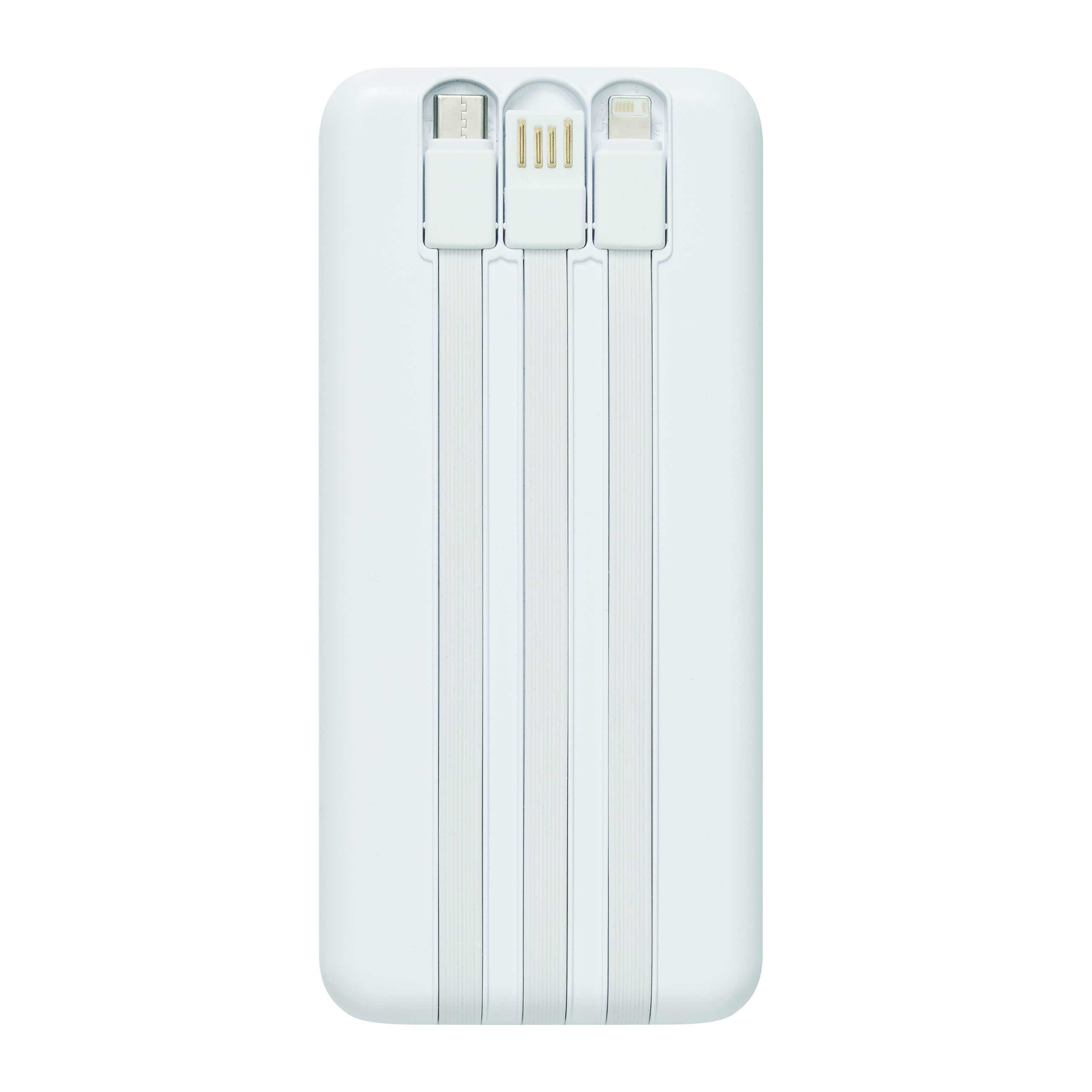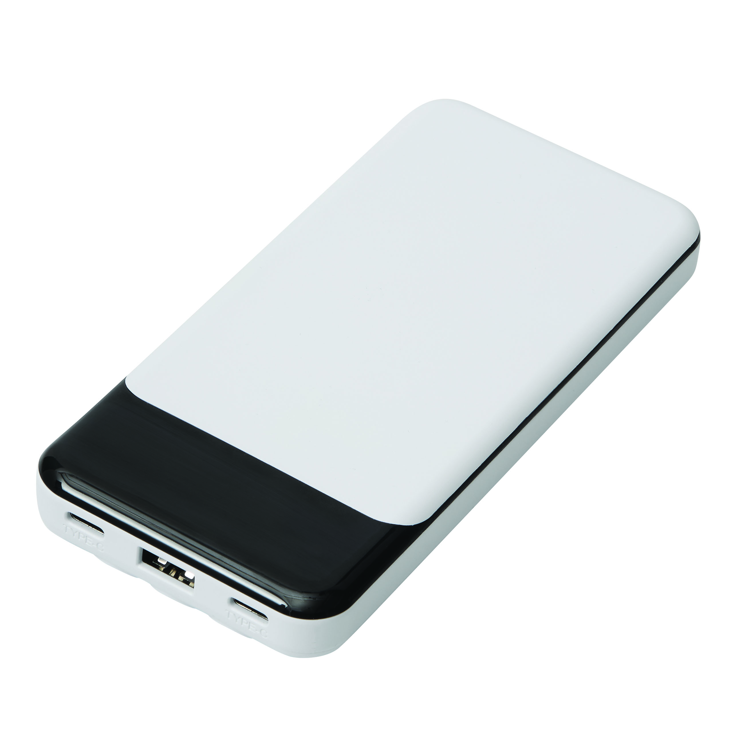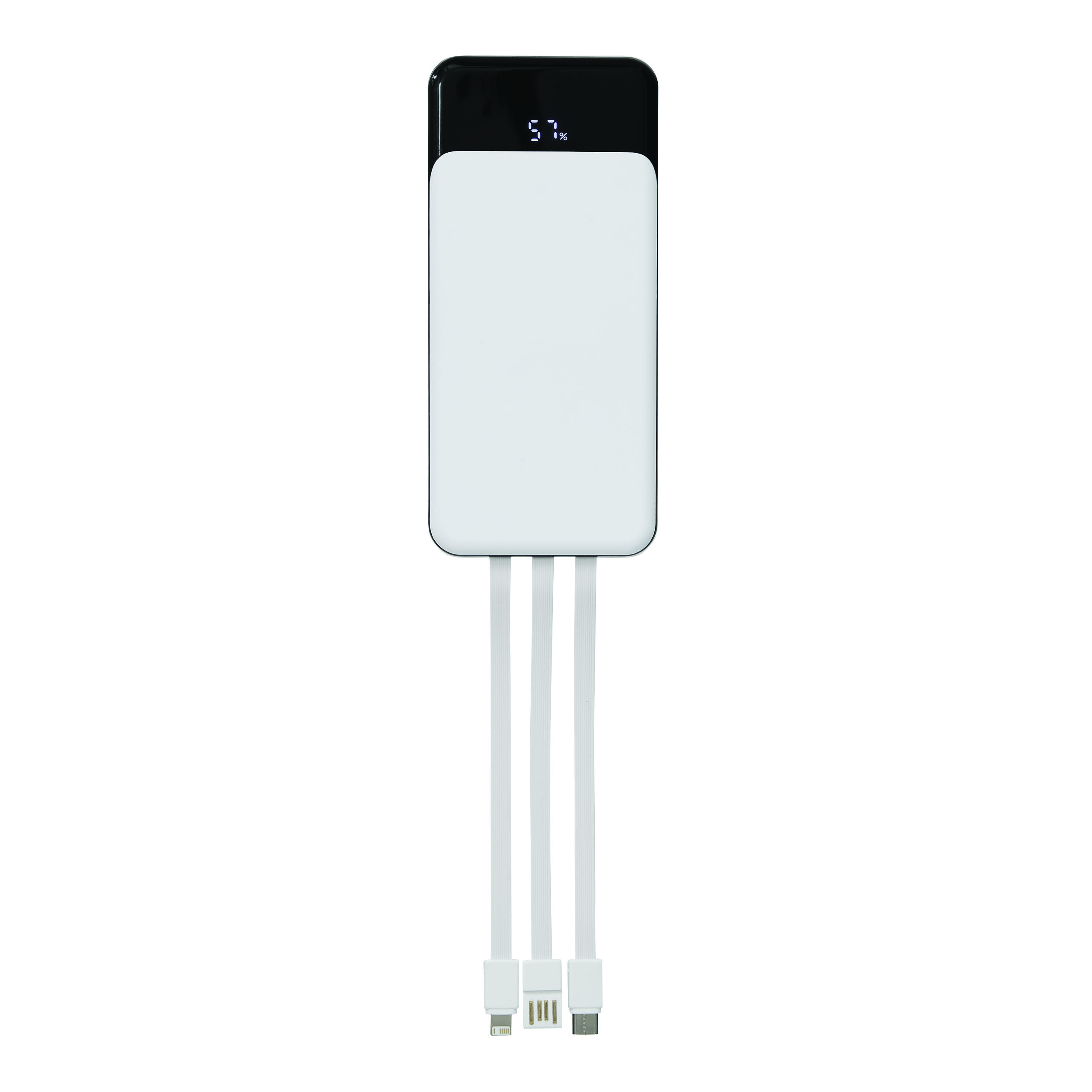 Powerbank POWERSTOCK. Odpowiedni do smartfonów i urządzeń podłączanych przez USB. Zestaw zawiera z tyłu 3 zintegrowane kable ładujące (USB-C, Lightning®, USB-A), wskaźnik poziomu naładowania baterii w procentach, przełącznik włączania/wyłączania zasilania, 2 porty wejścia/wyjścia USB-C i 1 wyjście USB-A. Moc wejściowa: 5 V/2 A, moc wyjściowa: 5 V/2 A (maks.). Ma pojemność: 10 000 mAh i wysokowydajną baterię litową. Zapakowany jest w pudełko.