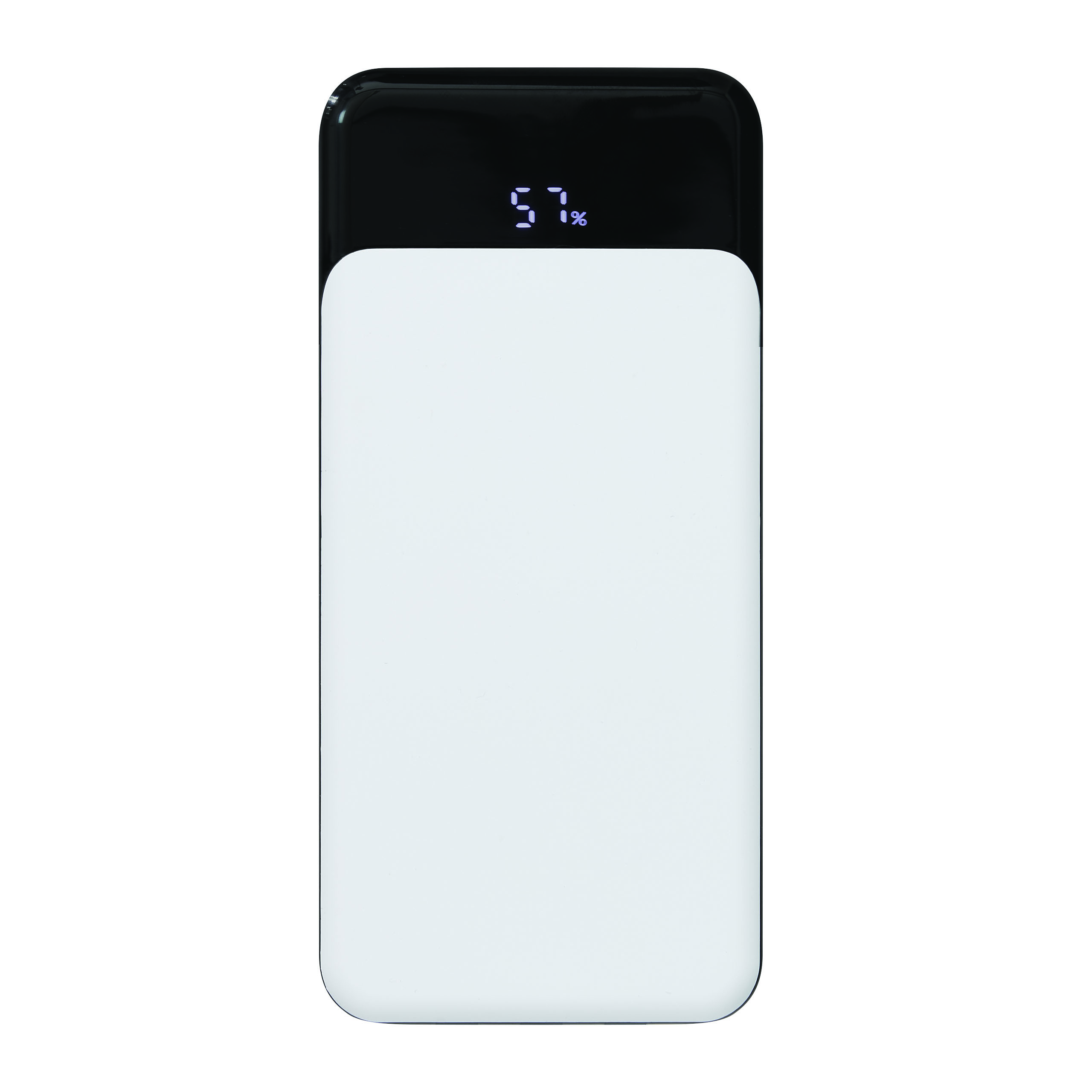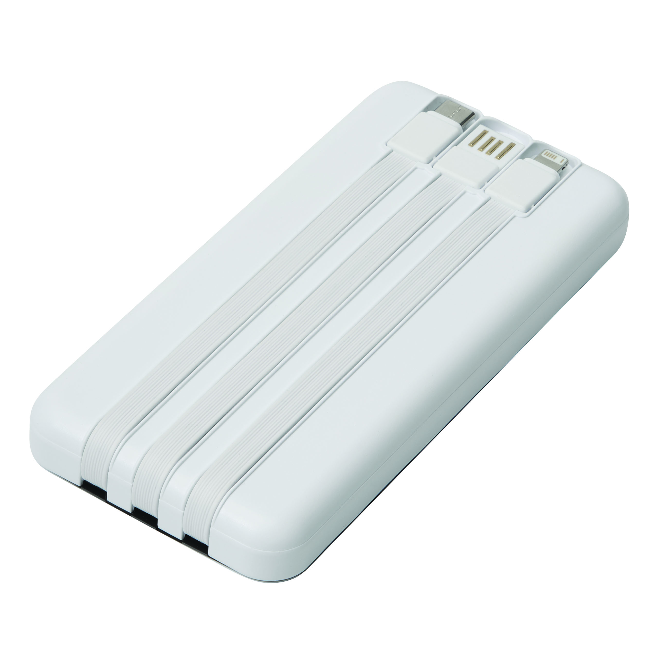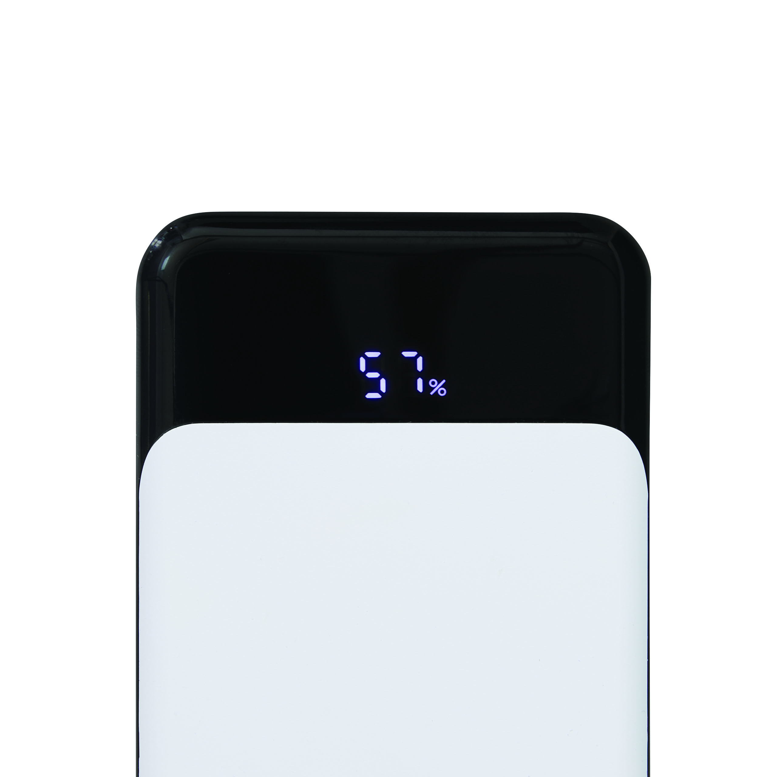 Powerbank POWERSTOCK. Odpowiedni do smartfonów i urządzeń podłączanych przez USB. Zestaw zawiera z tyłu 3 zintegrowane kable ładujące (USB-C, Lightning®, USB-A), wskaźnik poziomu naładowania baterii w procentach, przełącznik włączania/wyłączania zasilania, 2 porty wejścia/wyjścia USB-C i 1 wyjście USB-A. Moc wejściowa: 5 V/2 A, moc wyjściowa: 5 V/2 A (maks.). Ma pojemność: 10 000 mAh i wysokowydajną baterię litową. Zapakowany jest w pudełko.