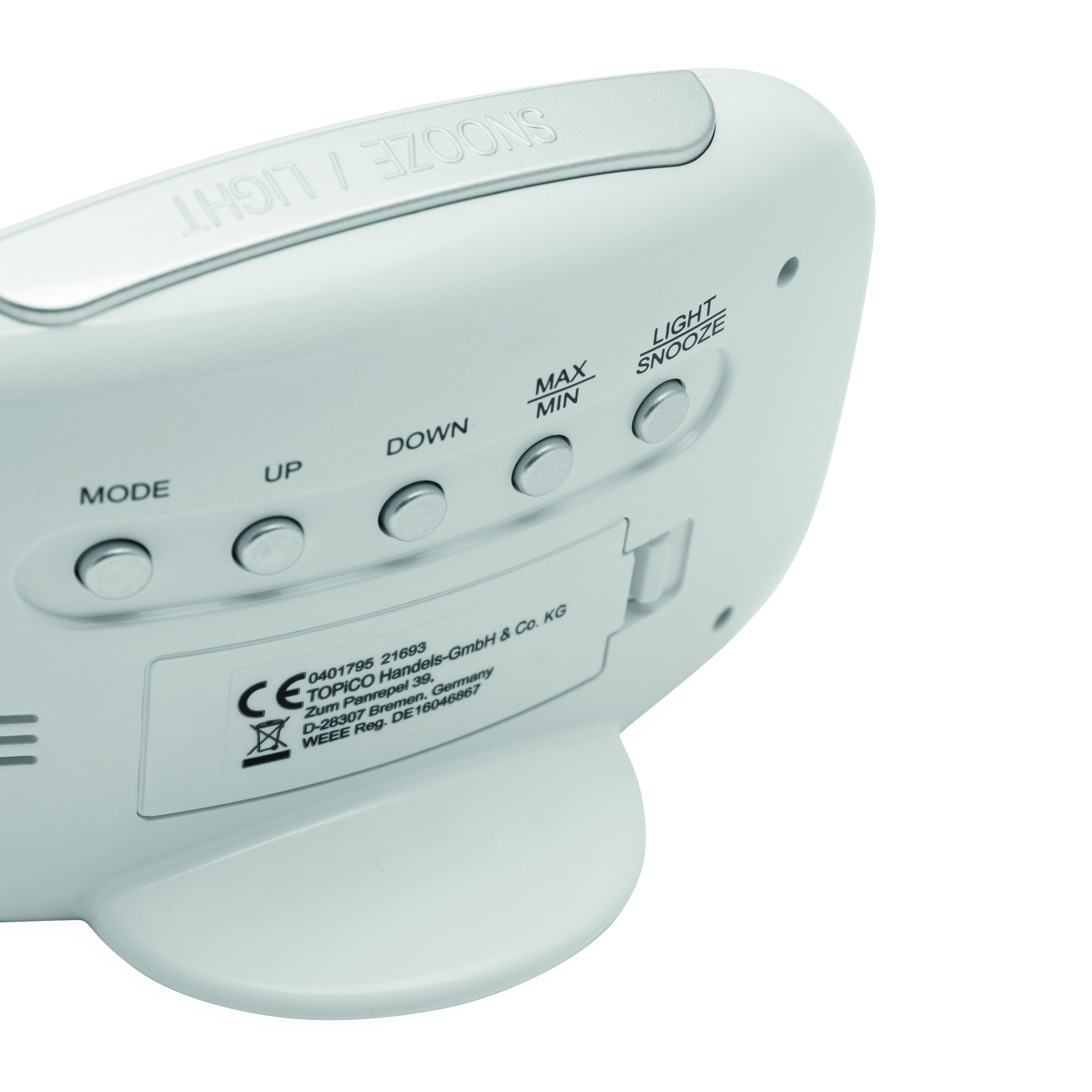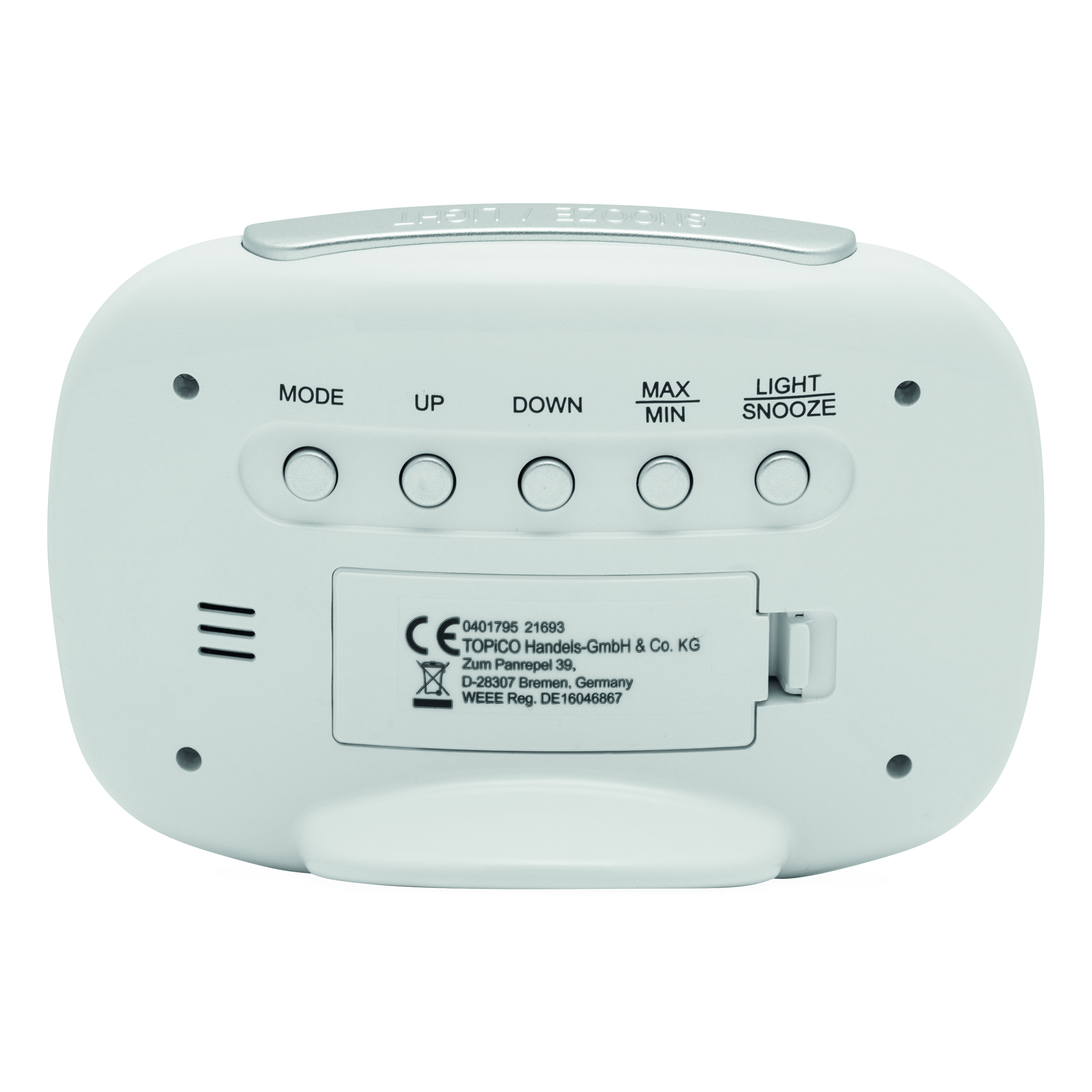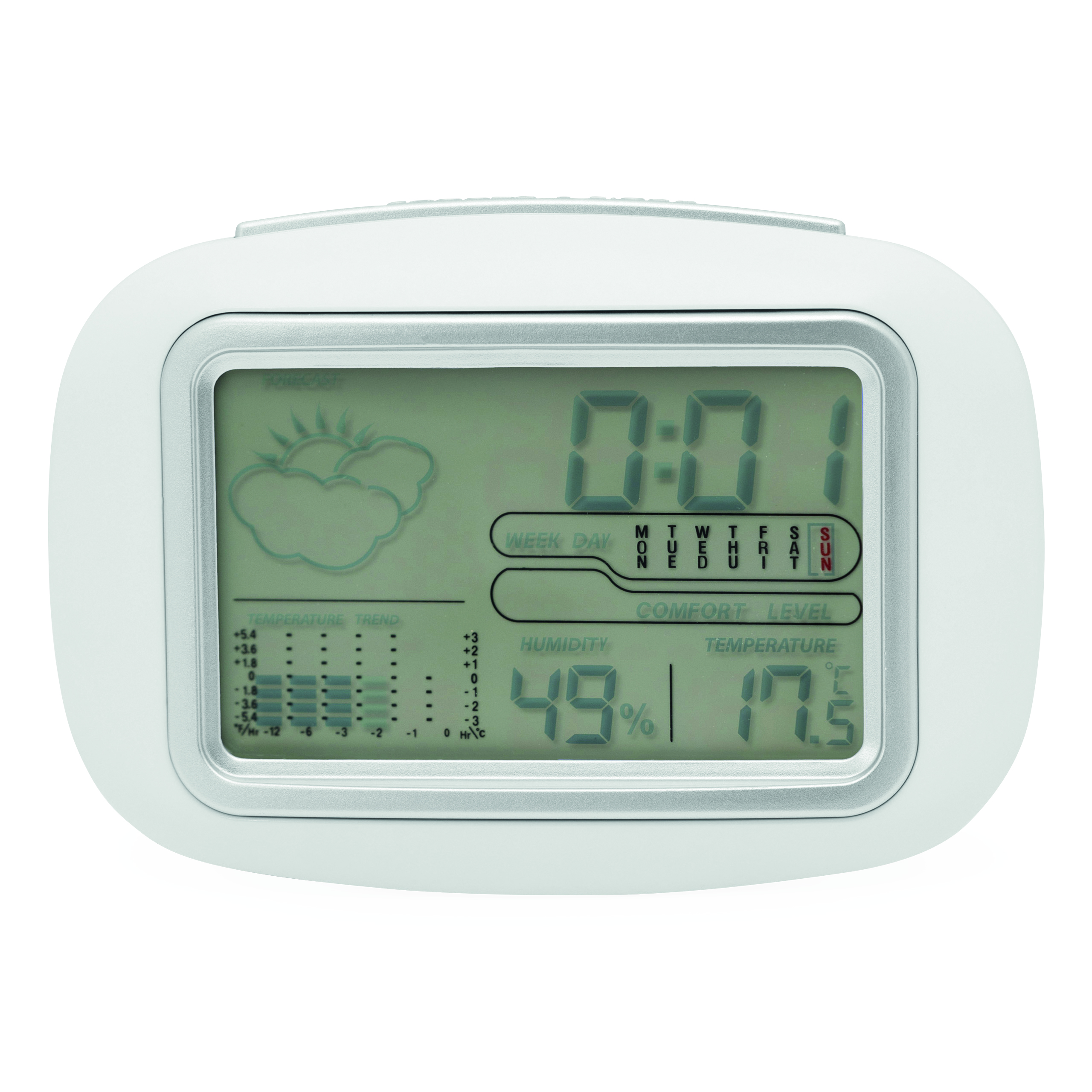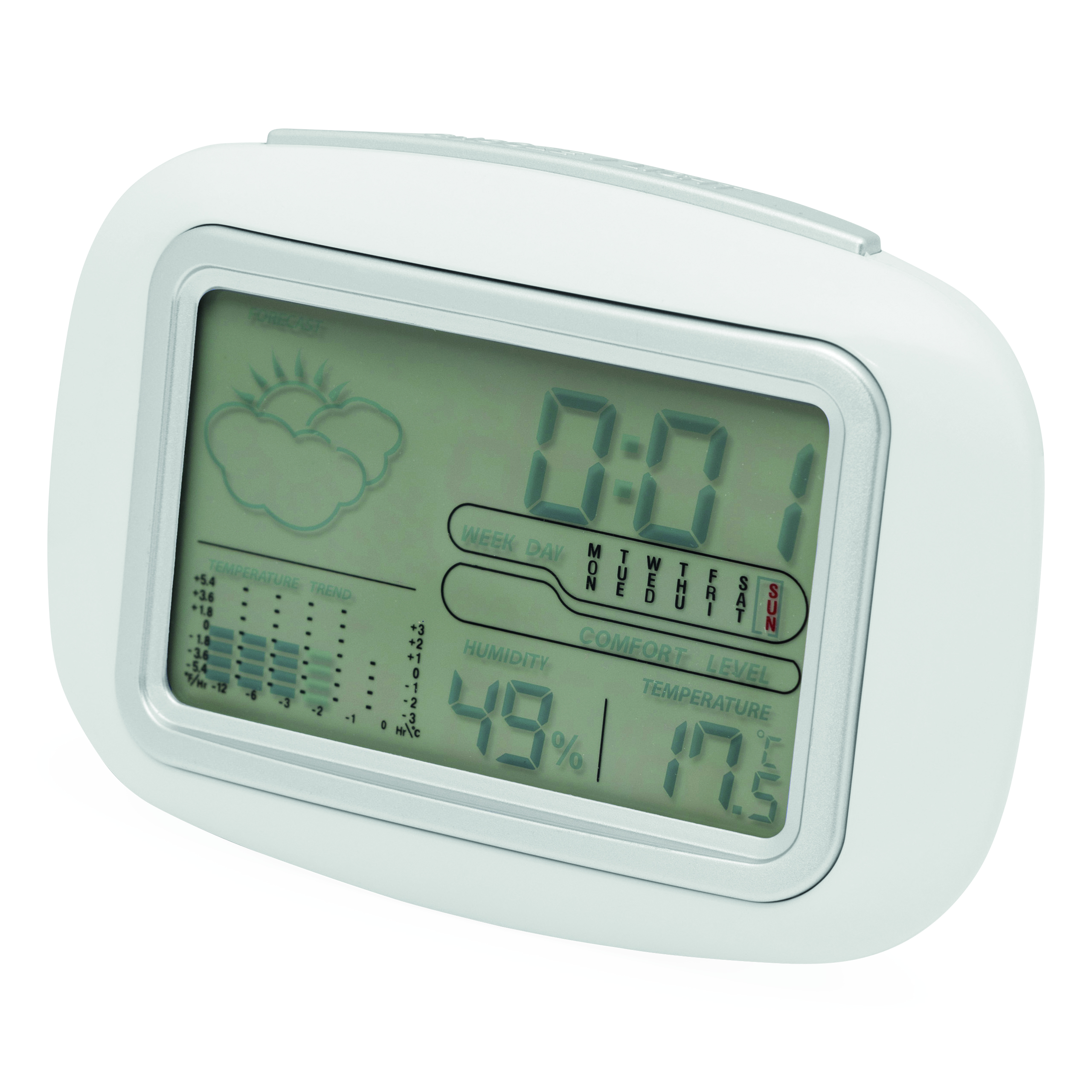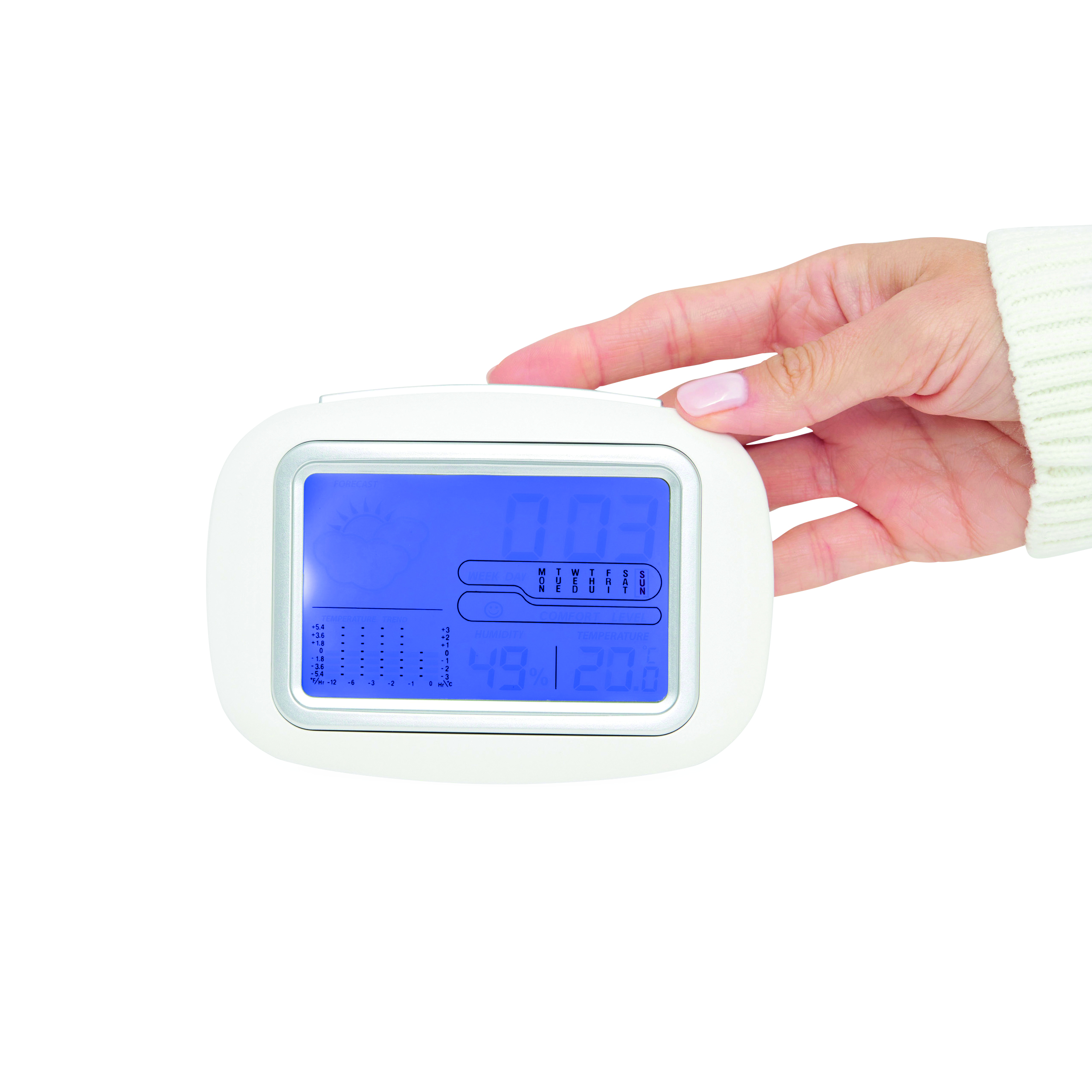 Stacja pogodowa CALOR z termometrem i higrometrem. Wyświetla godzinę i wilgotność powietrza. Niebieskie podświetlenie LED. Wykonana z białego plastiku ABS.