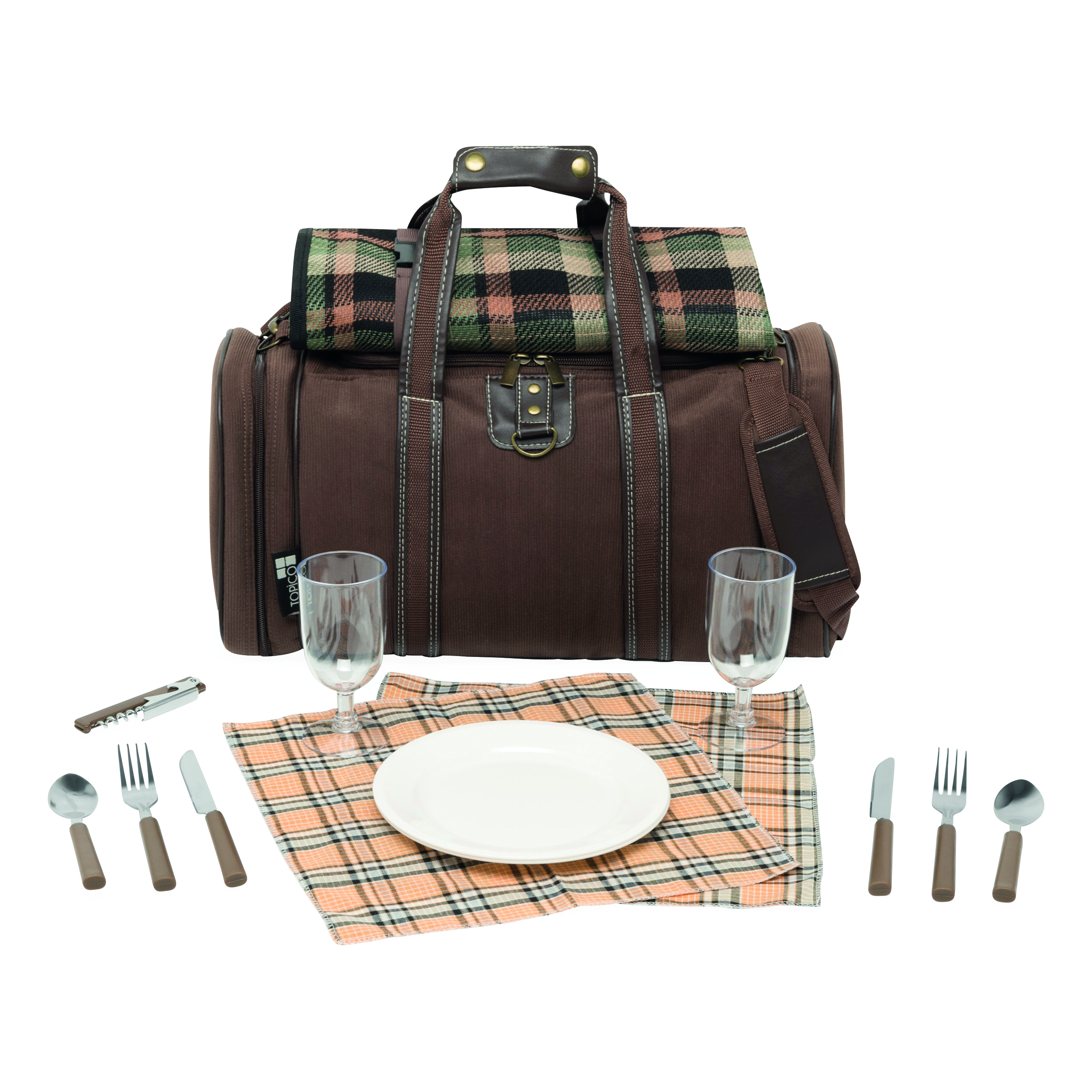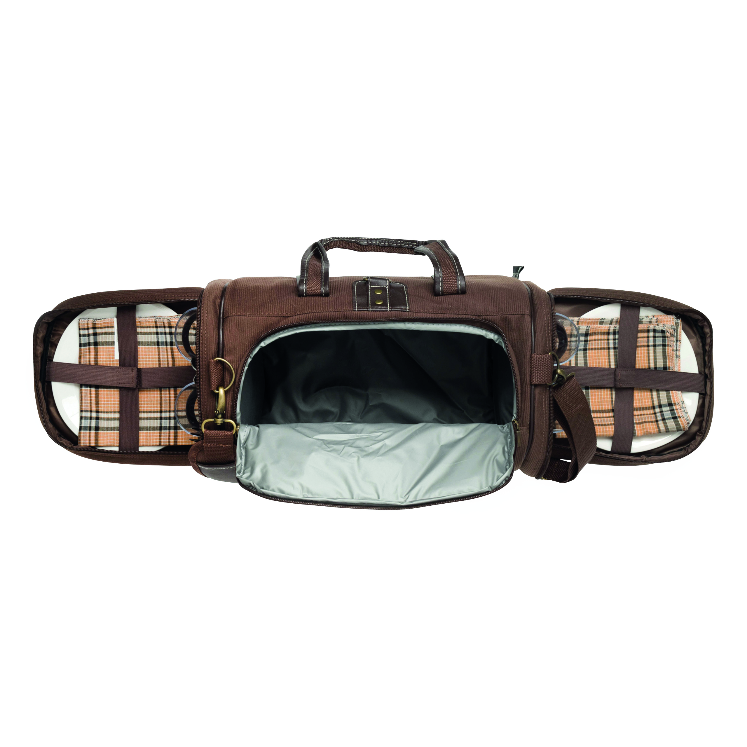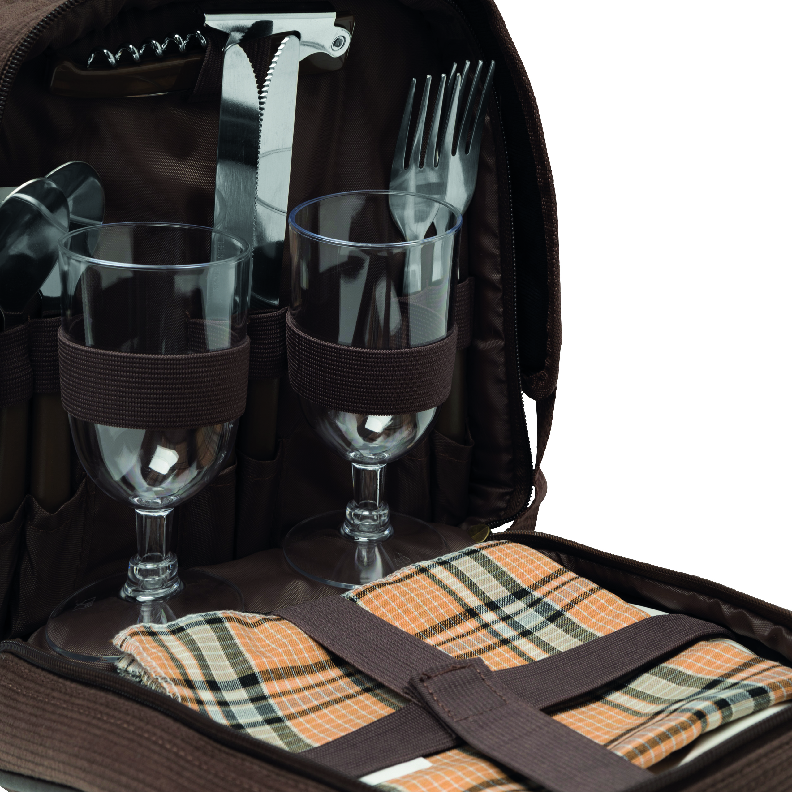 Torba piknikowa 4 PICKNICK dla 4 osób. Z kieszeniami na suwak z jednej strony i z izolowaną kieszenią chłodzącą na napoje i żywność w środku. Zawiera 4 plastikowe talerze i szklanki, metalowe łyżki, widelce i noże, serwetki oraz nóż kelnerski. W zestawie koc piknikowy (ok. 135 x 113 cm) ze spodem odpornym na zabrudzenia. Regulowane i odpinane ramiączka, 2 uchwyty do przenoszenia.