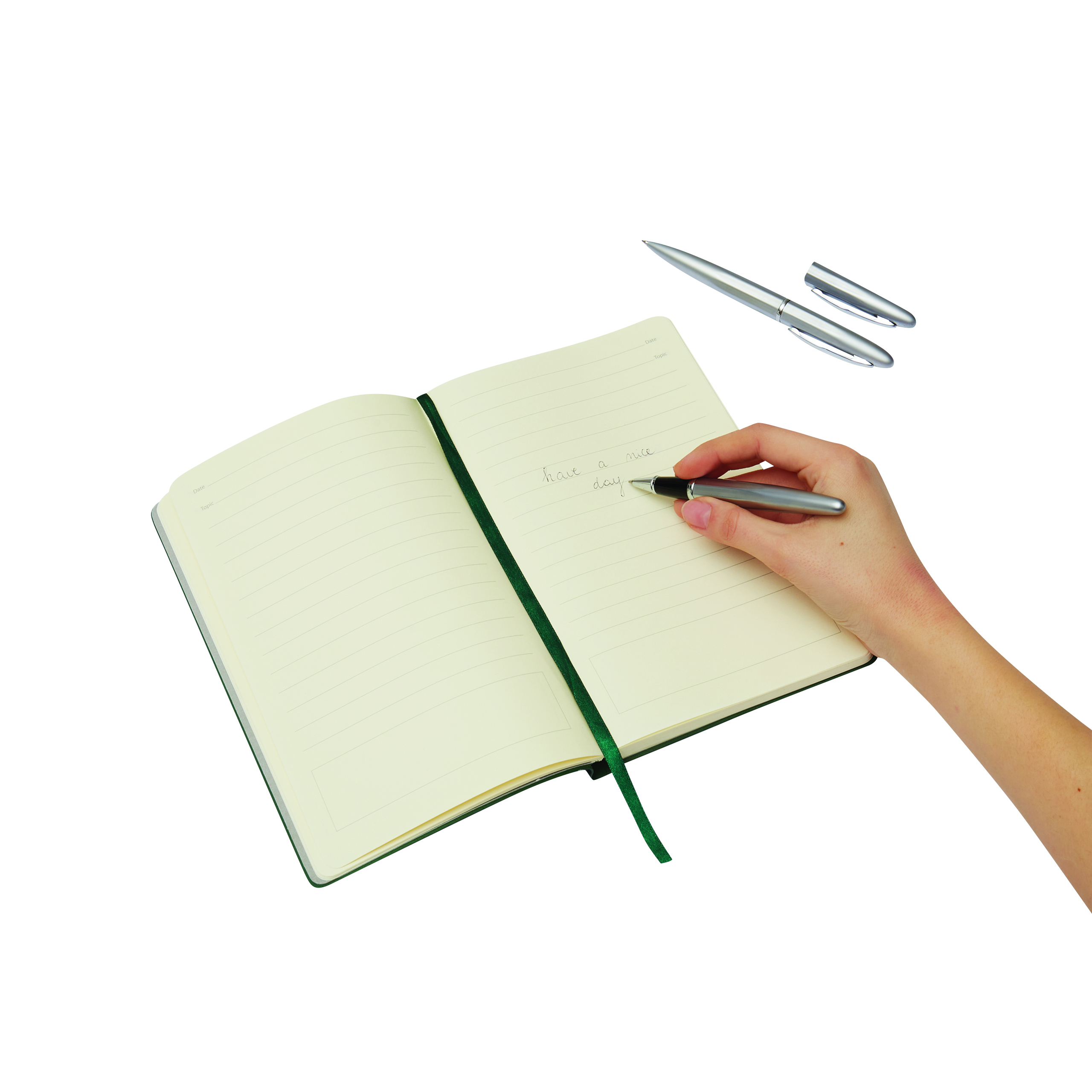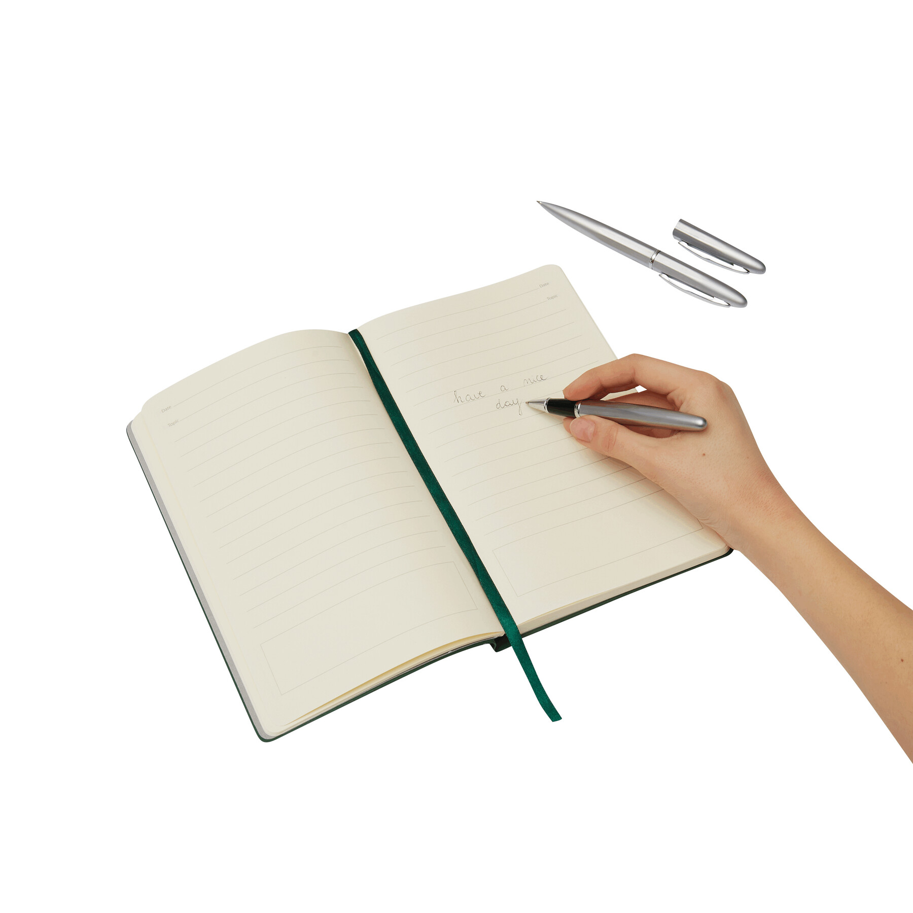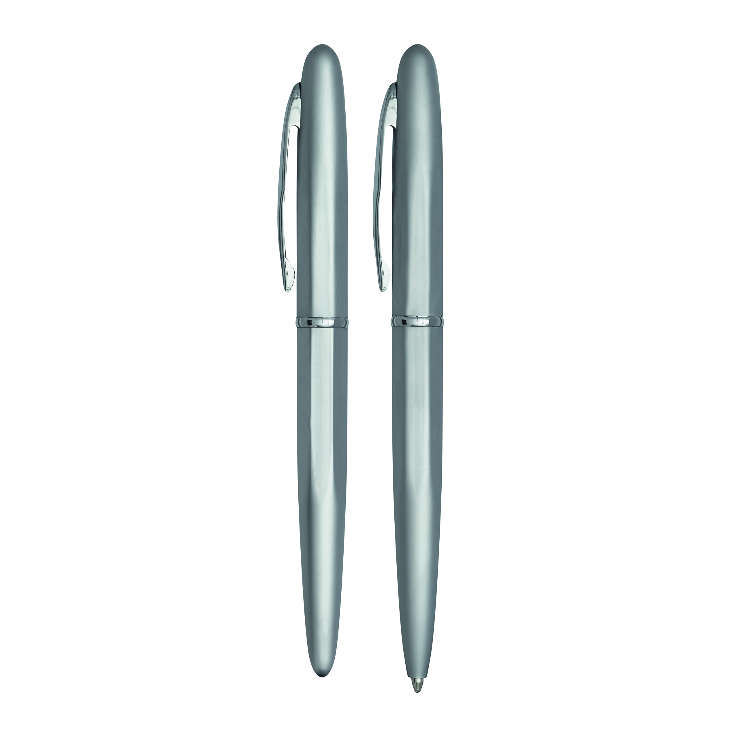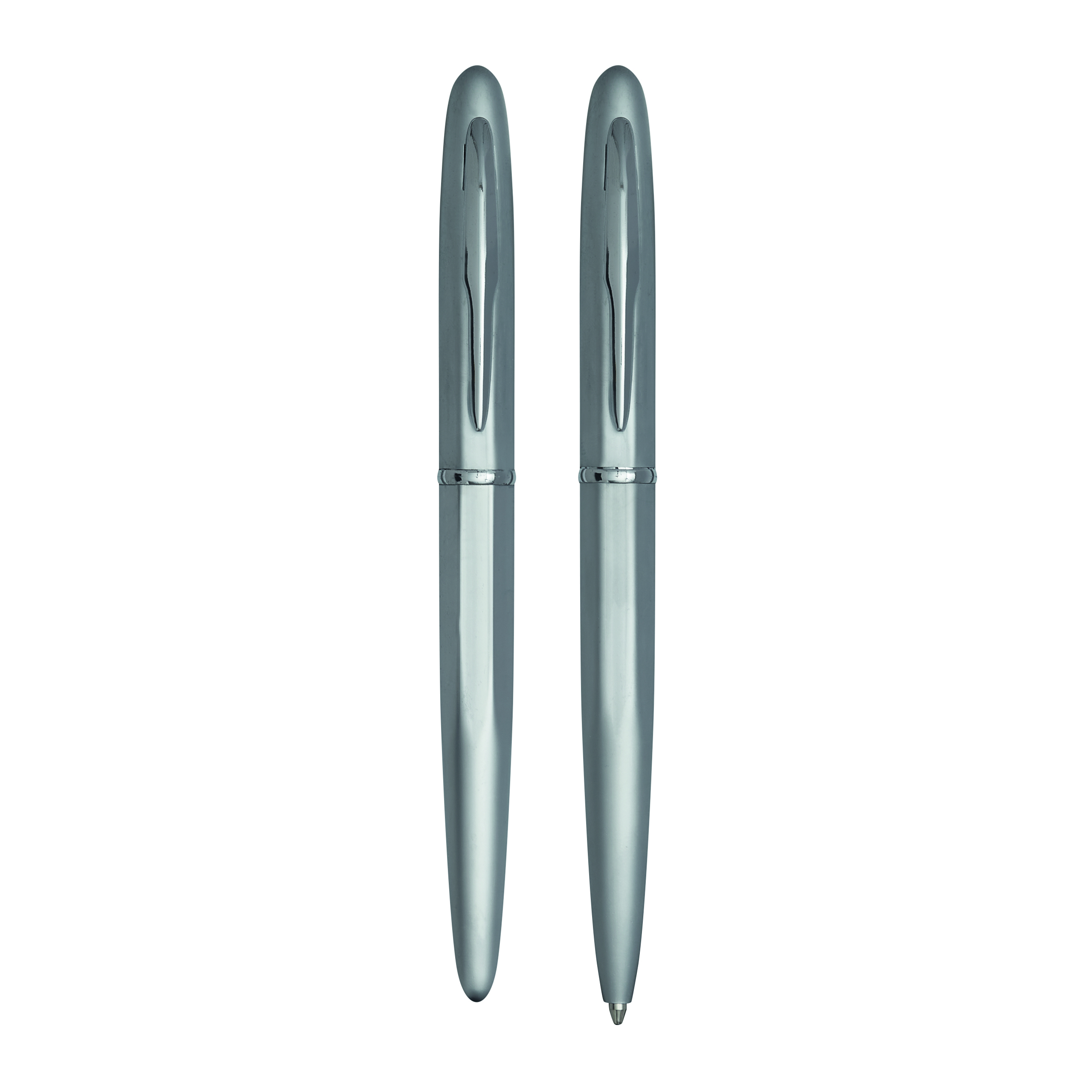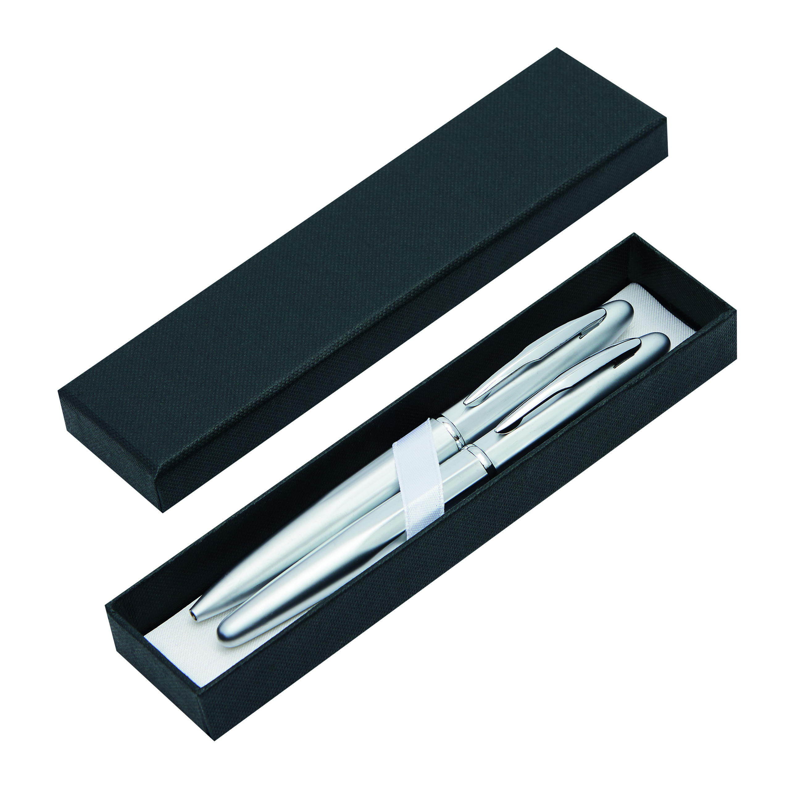 Zestaw do pisania COMTESSE zawiera długopis z obracaną obsadką i pióro kulkowe. Wykonane z trwałego, satynowego metalu z kontrastującymi chromowanymi elementami.