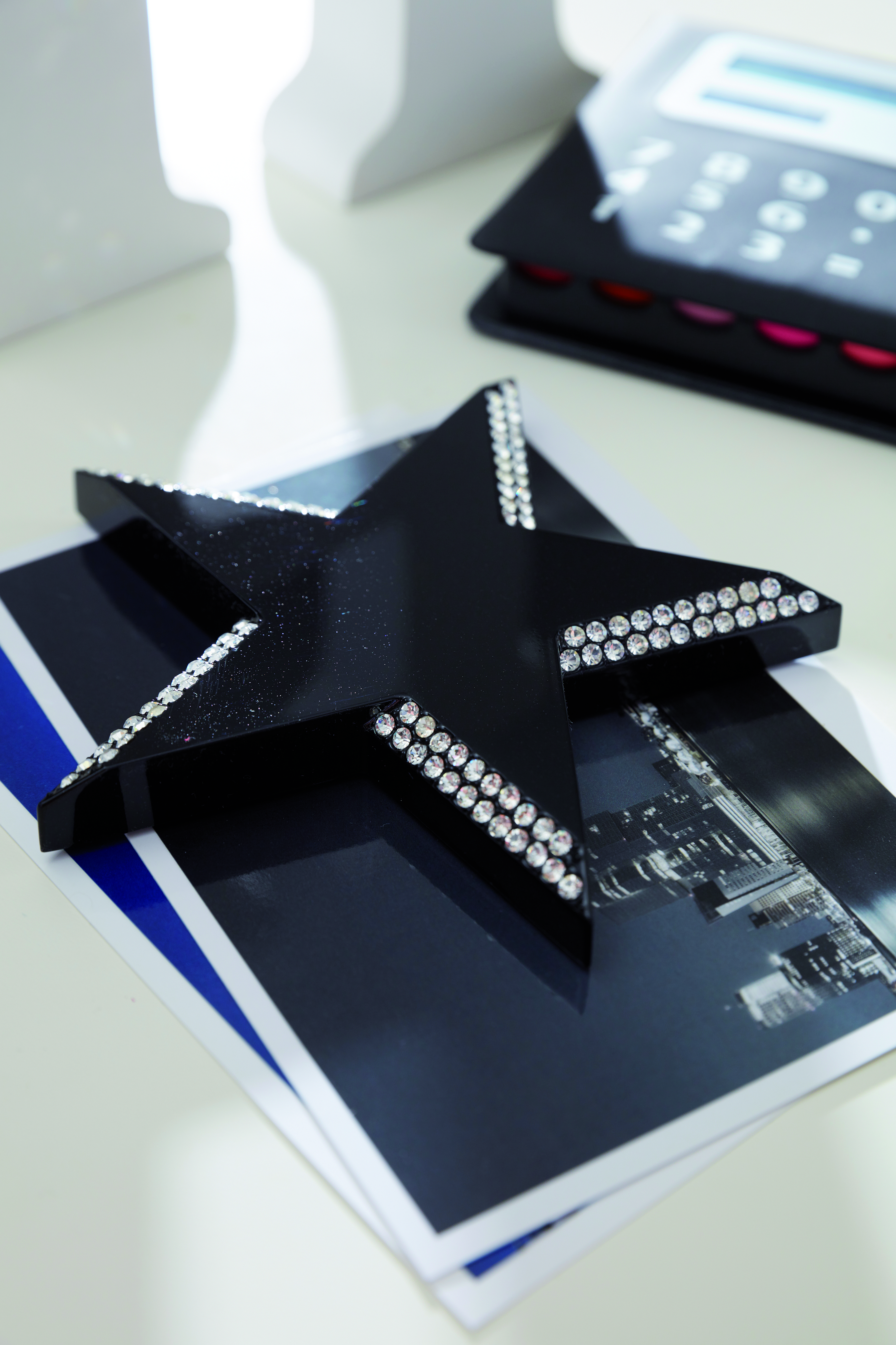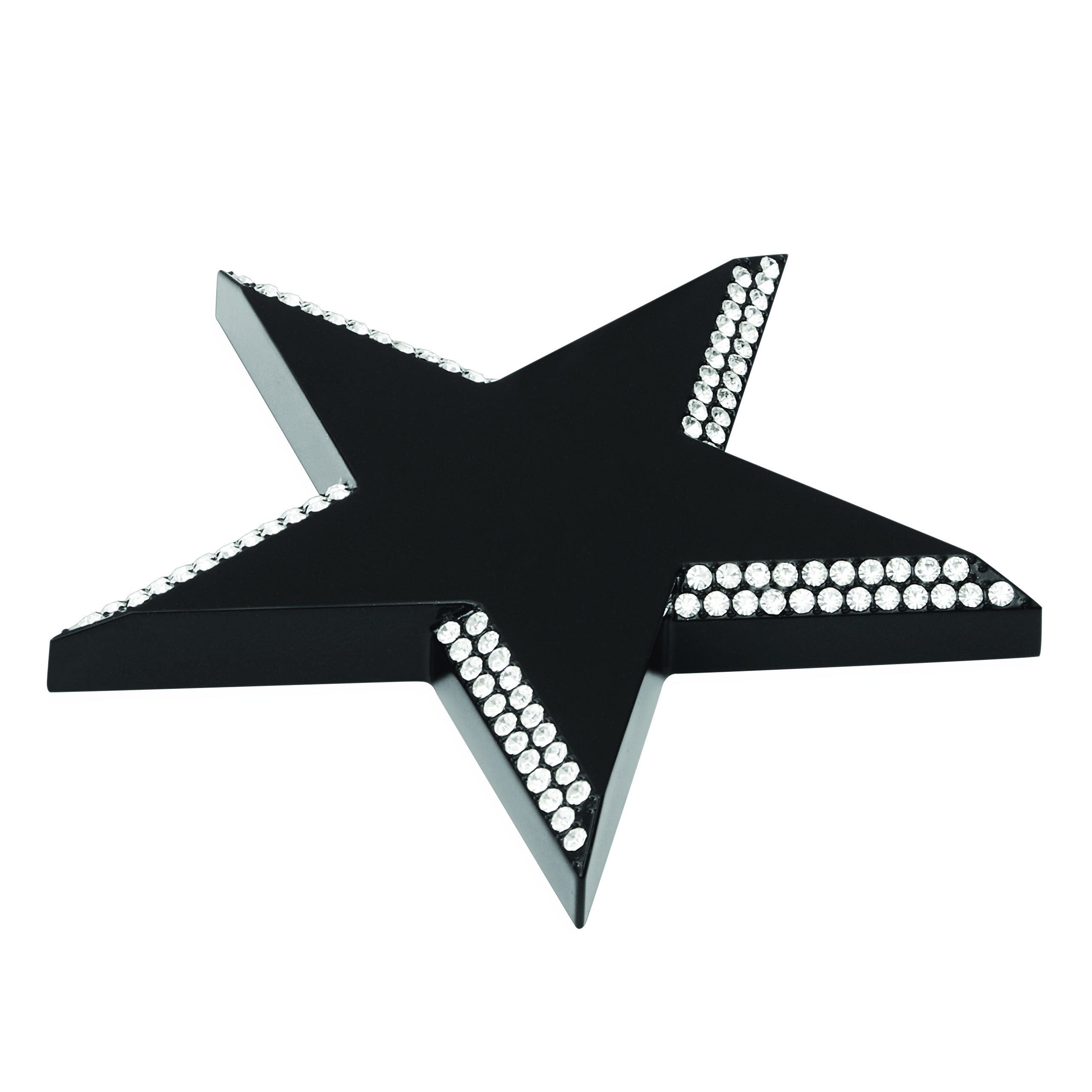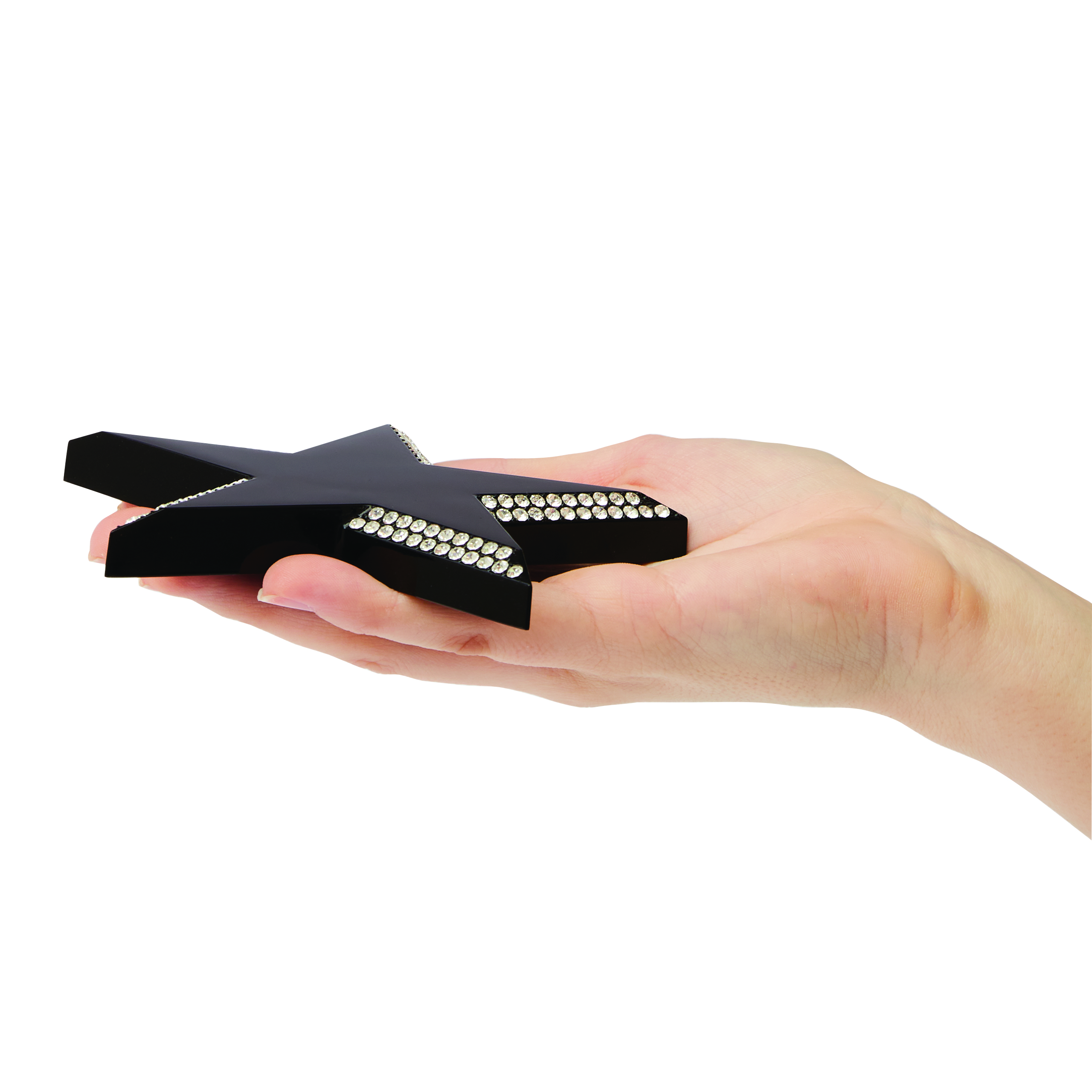 Obracany przycisk do papieru TRONDHEIM w kształcie gwiazdy ozdobionej błyszczącymi kryształkami. Wykonany z ciężkiego czarnego metalu.