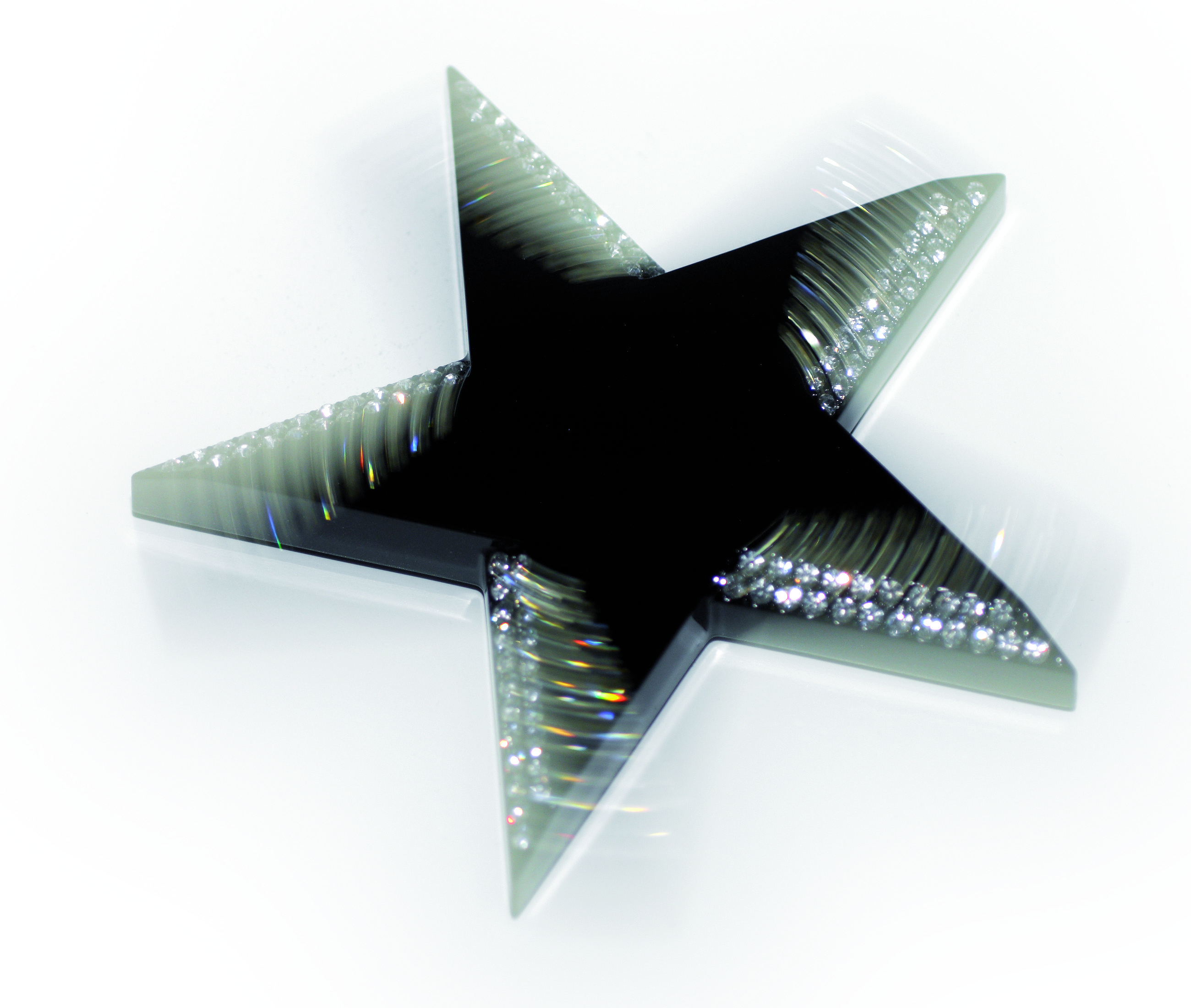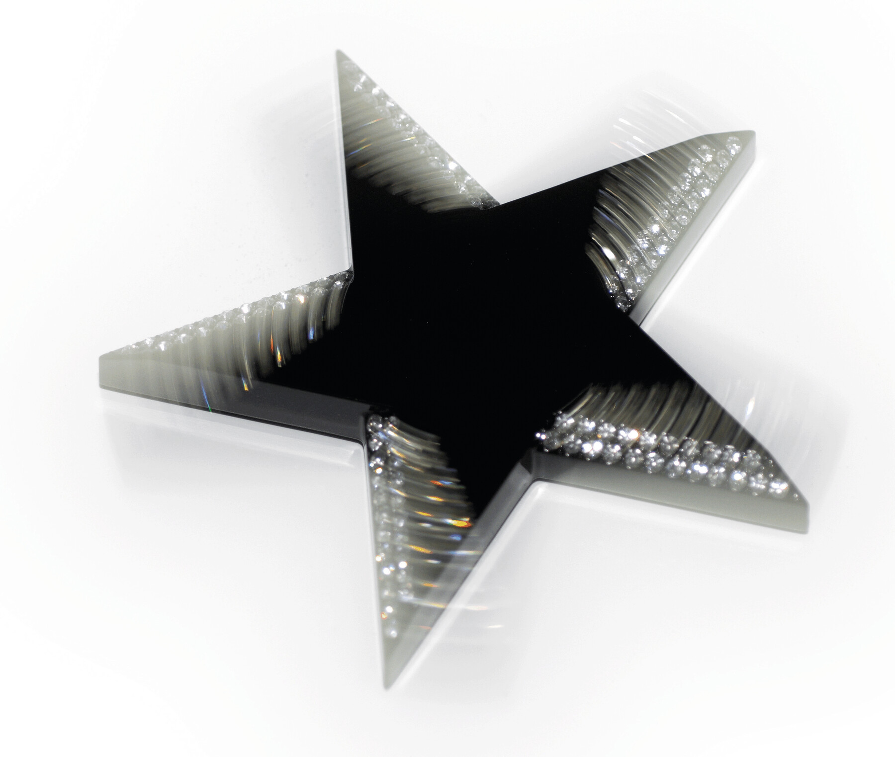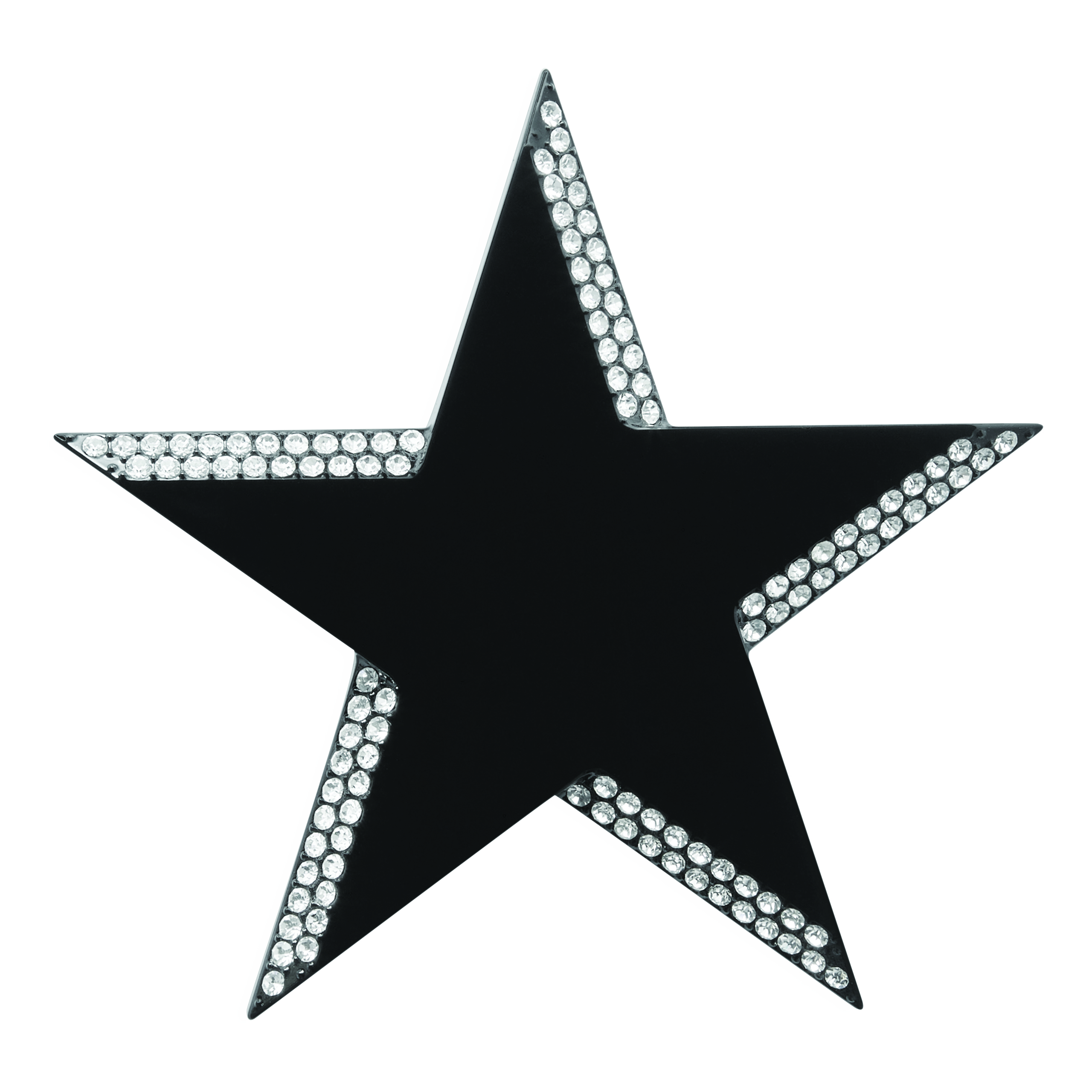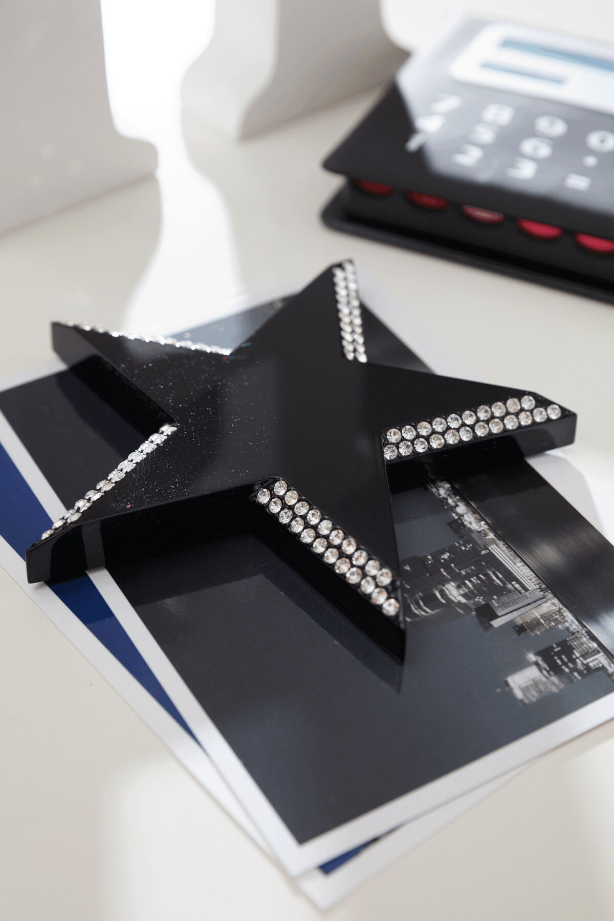 Obracany przycisk do papieru TRONDHEIM w kształcie gwiazdy ozdobionej błyszczącymi kryształkami. Wykonany z ciężkiego czarnego metalu.