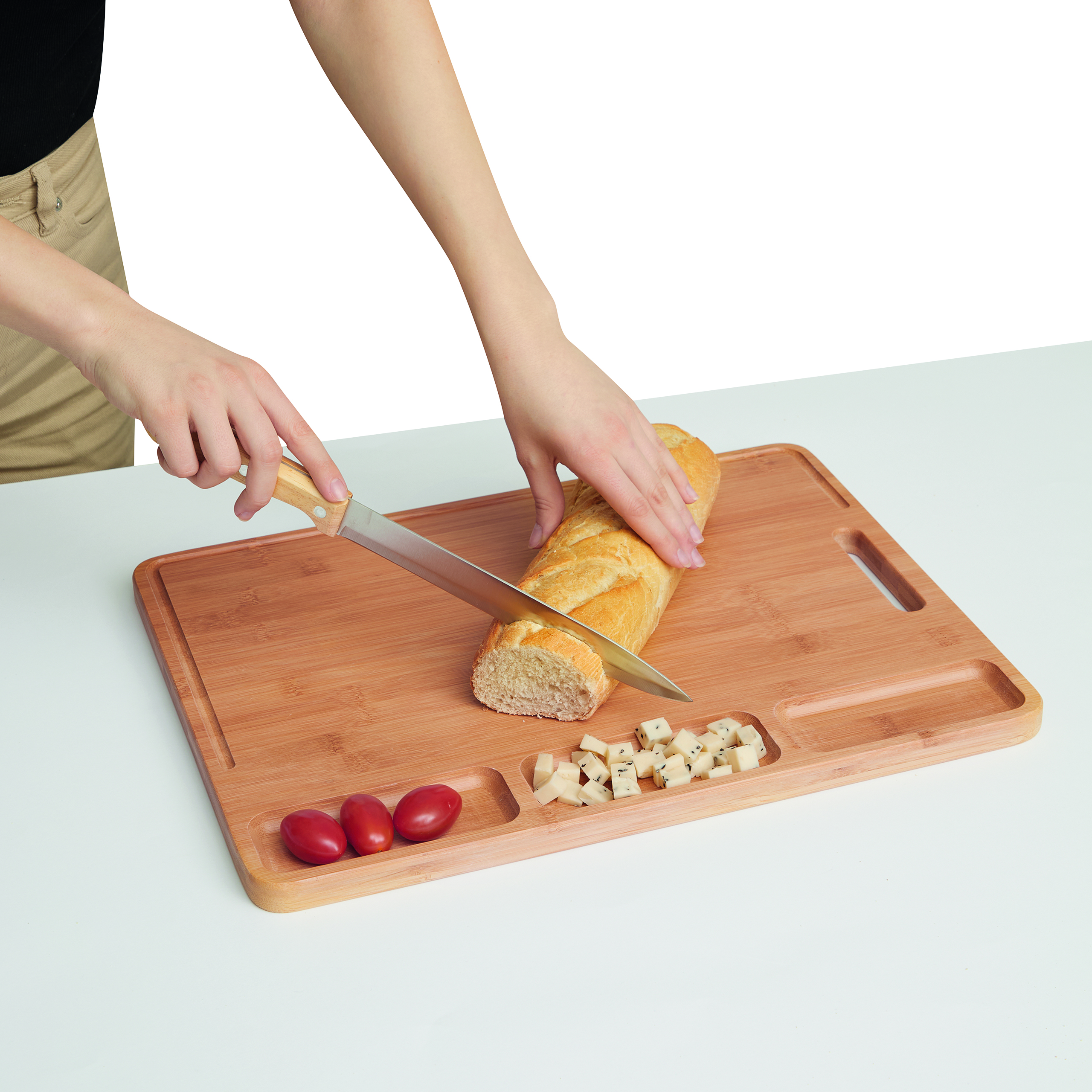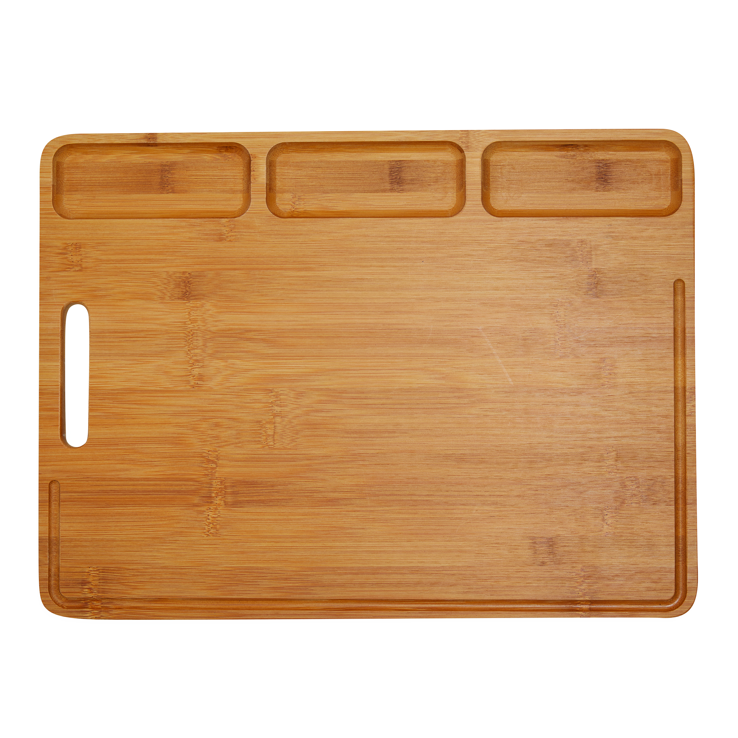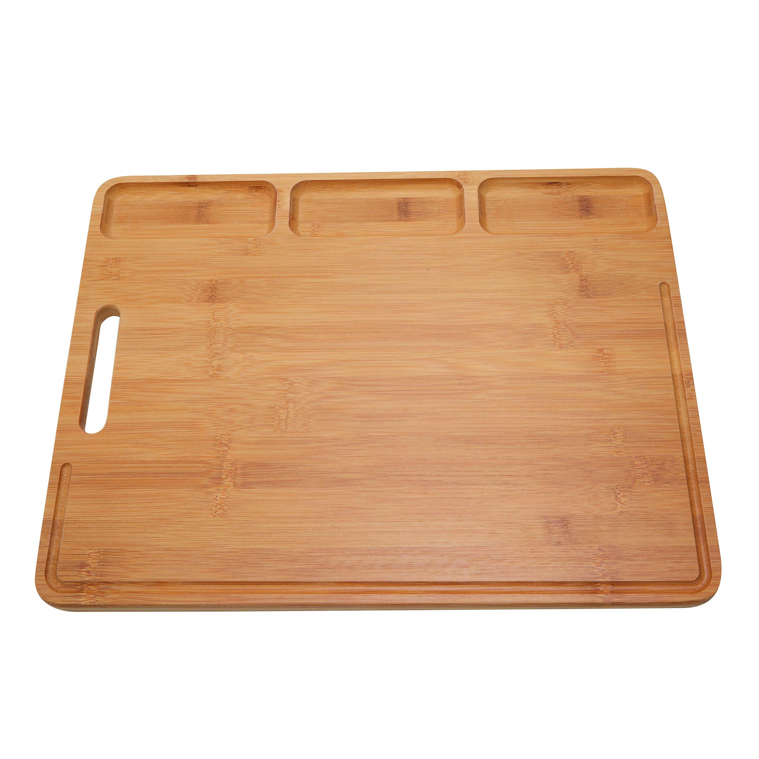 Duża deska do krojenia BAMBOO SERVING z trzema przegródkami i praktycznym wyżłobieniem wzdłuż krawędzi.