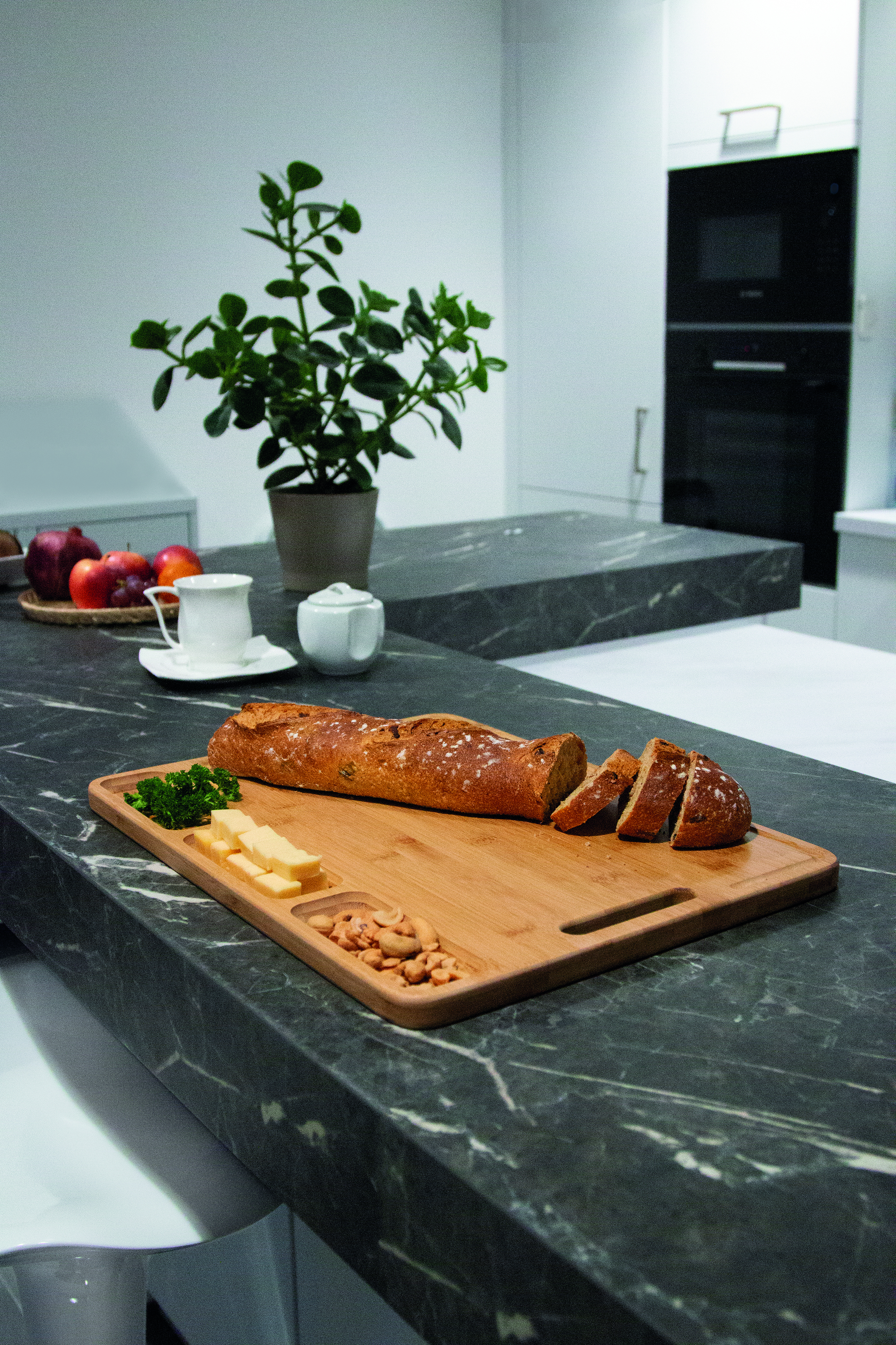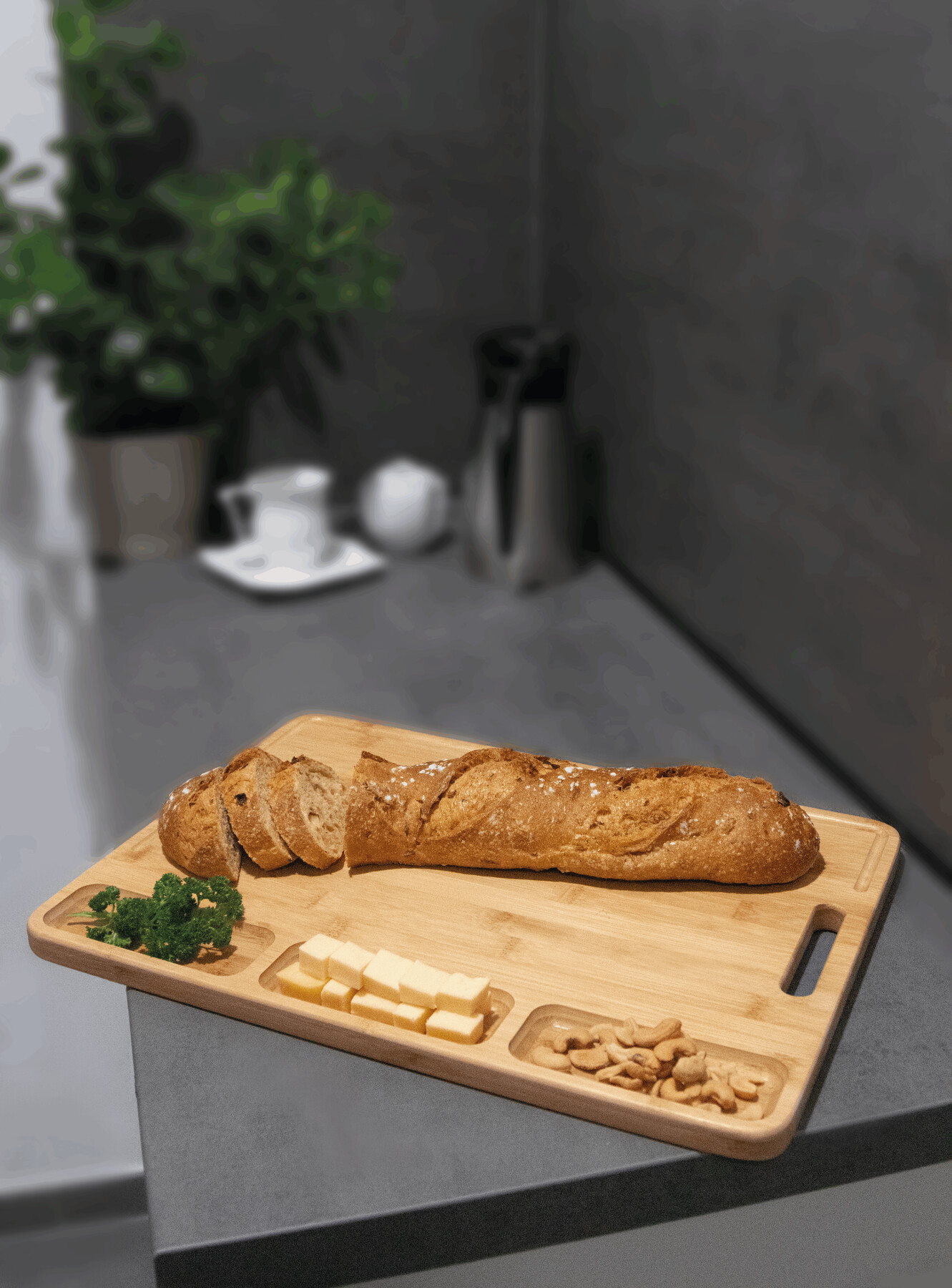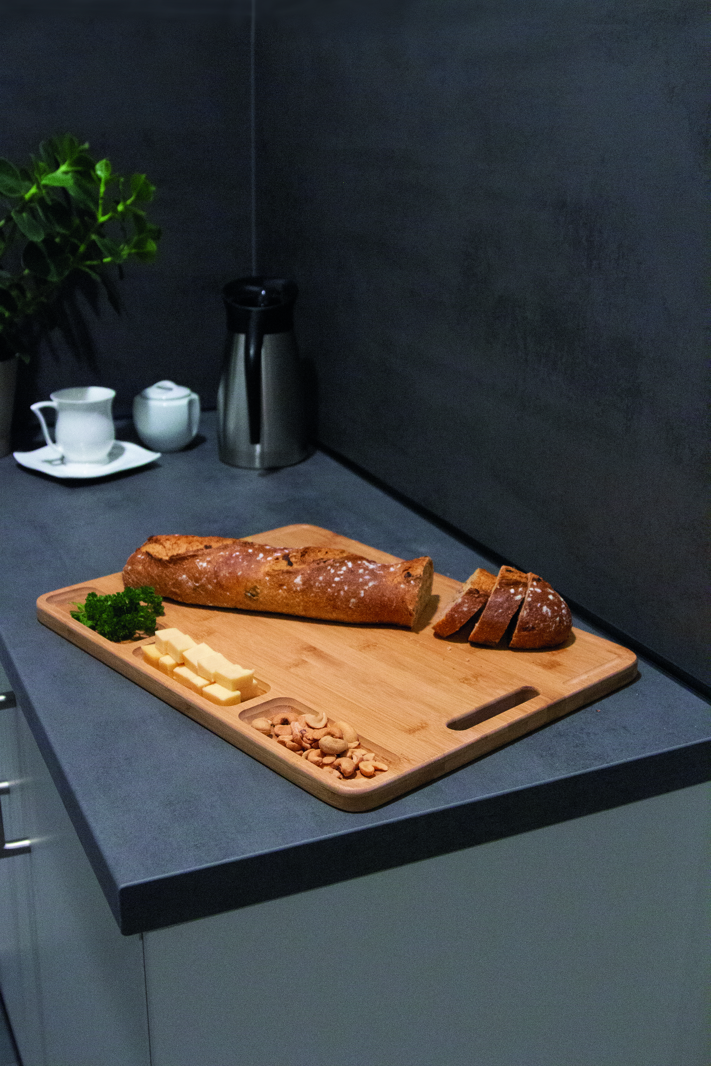 Duża deska do krojenia BAMBOO SERVING z trzema przegródkami i praktycznym wyżłobieniem wzdłuż krawędzi.