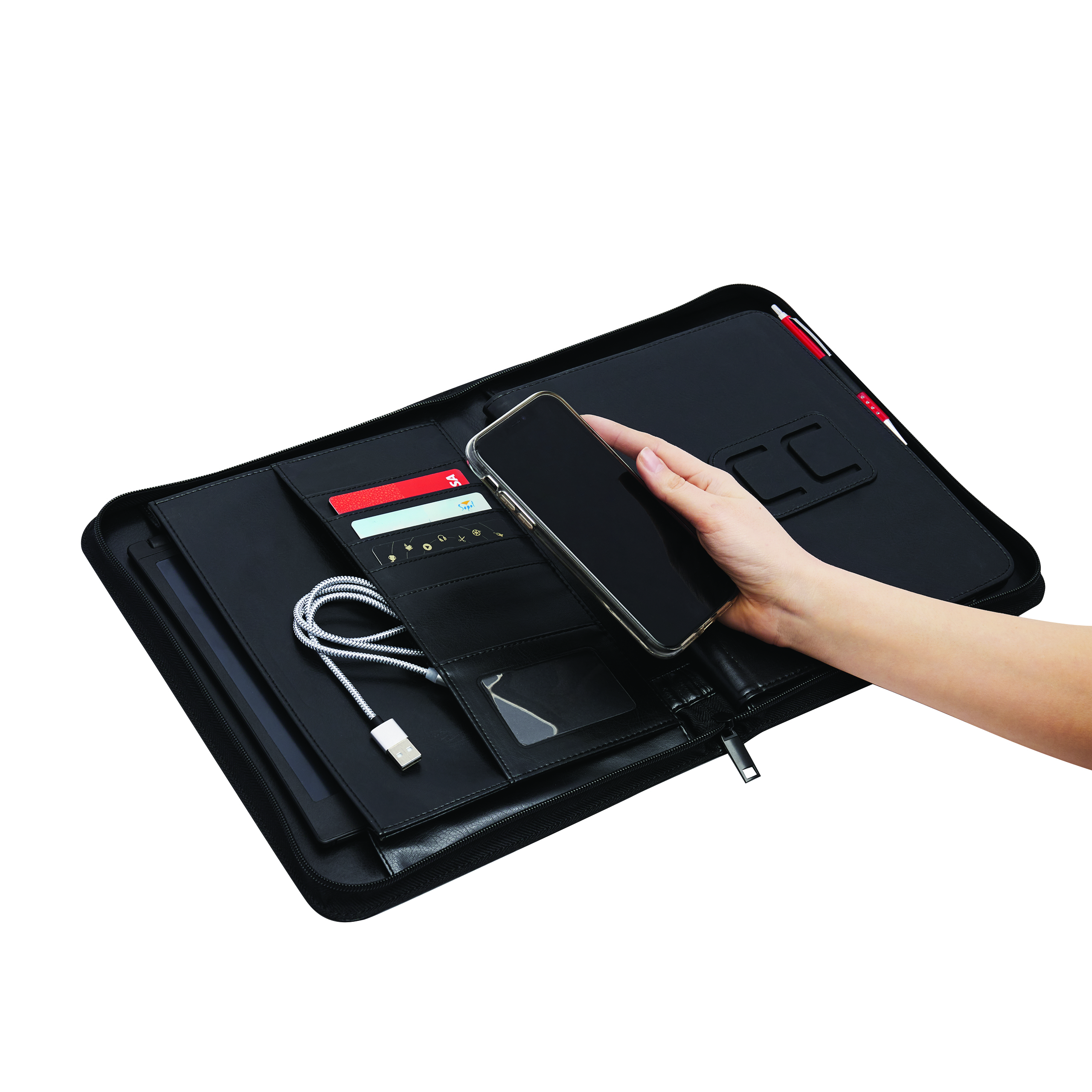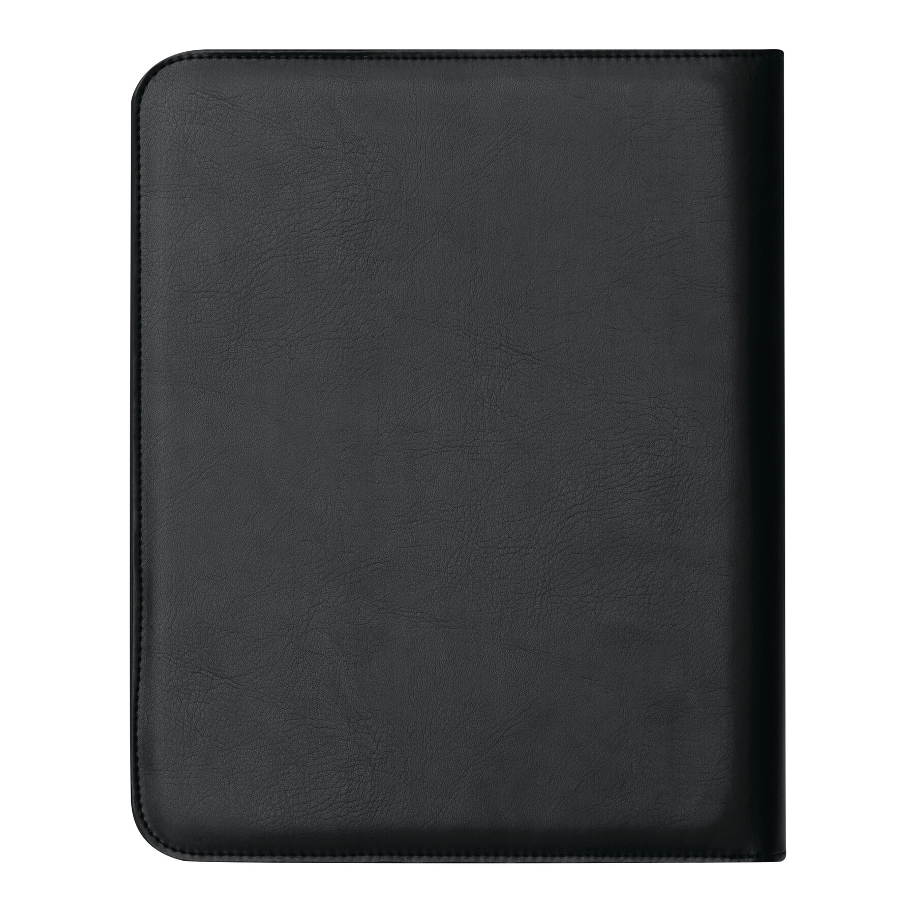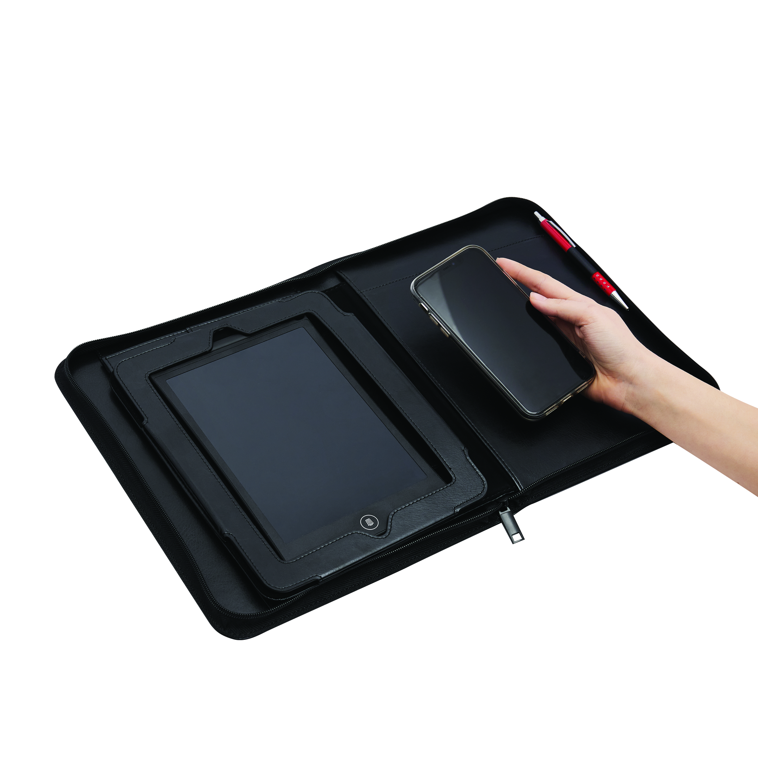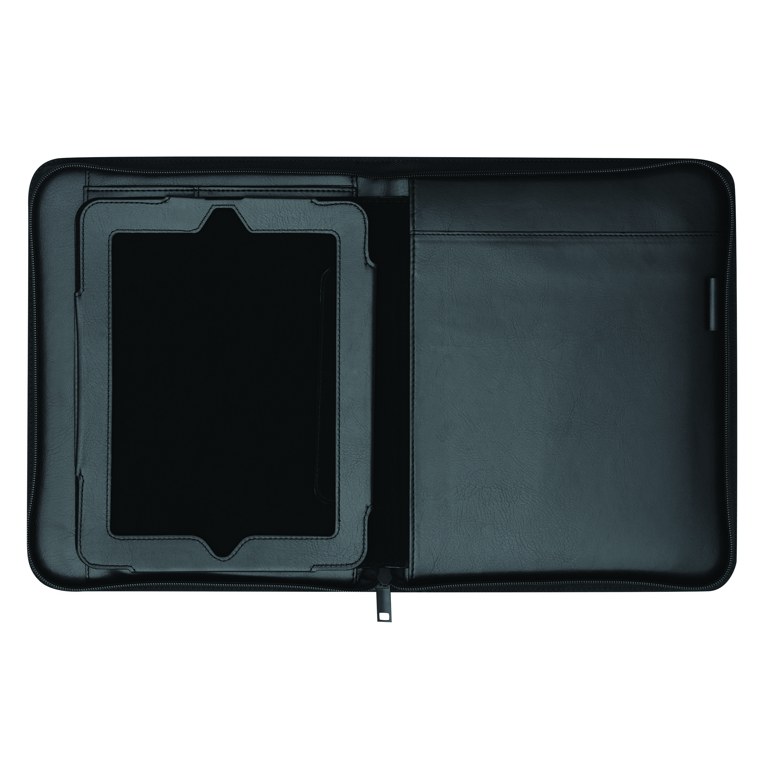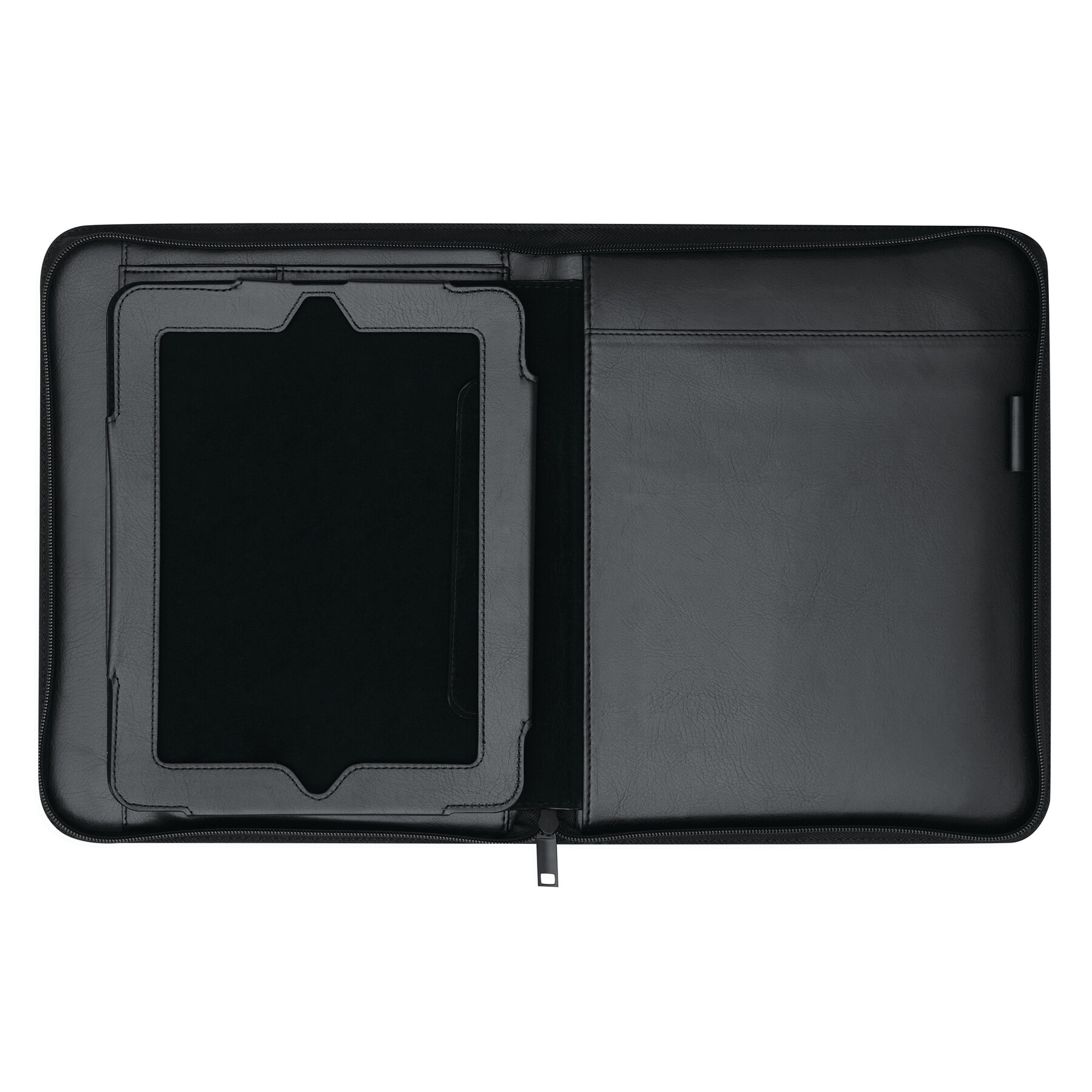 Portfolio NEW AGE z odczepianym etui na tablet (format ok. 24 x 17,7 cm). Wykonane z miękkiej syntetycznej skóry. Posiada 5 zakładek na wizytówki, 1 przezroczystą kieszeń, miejsce na podkładkę do pisania i przybory.