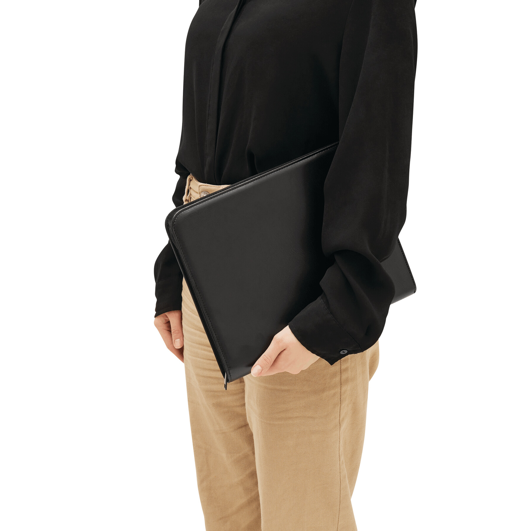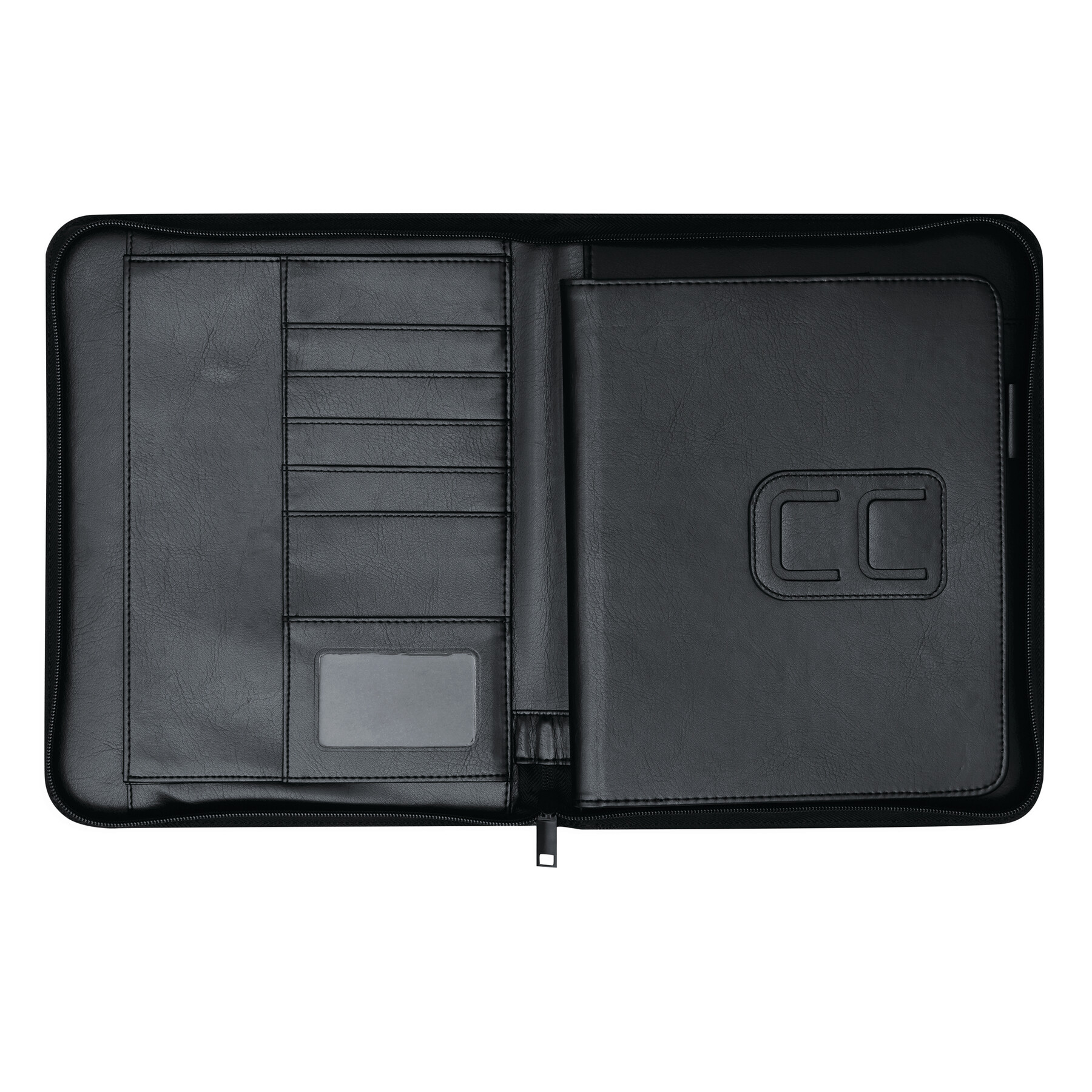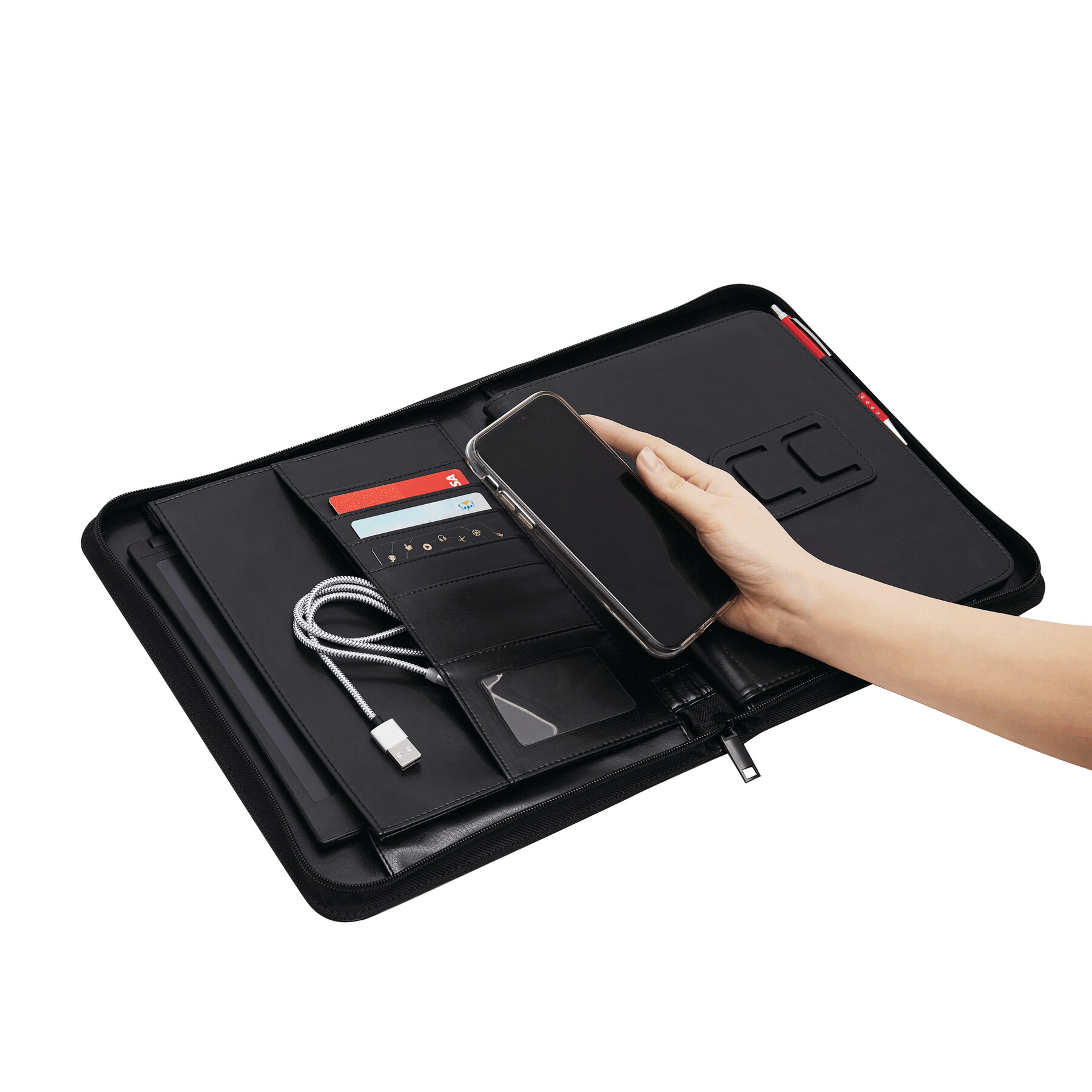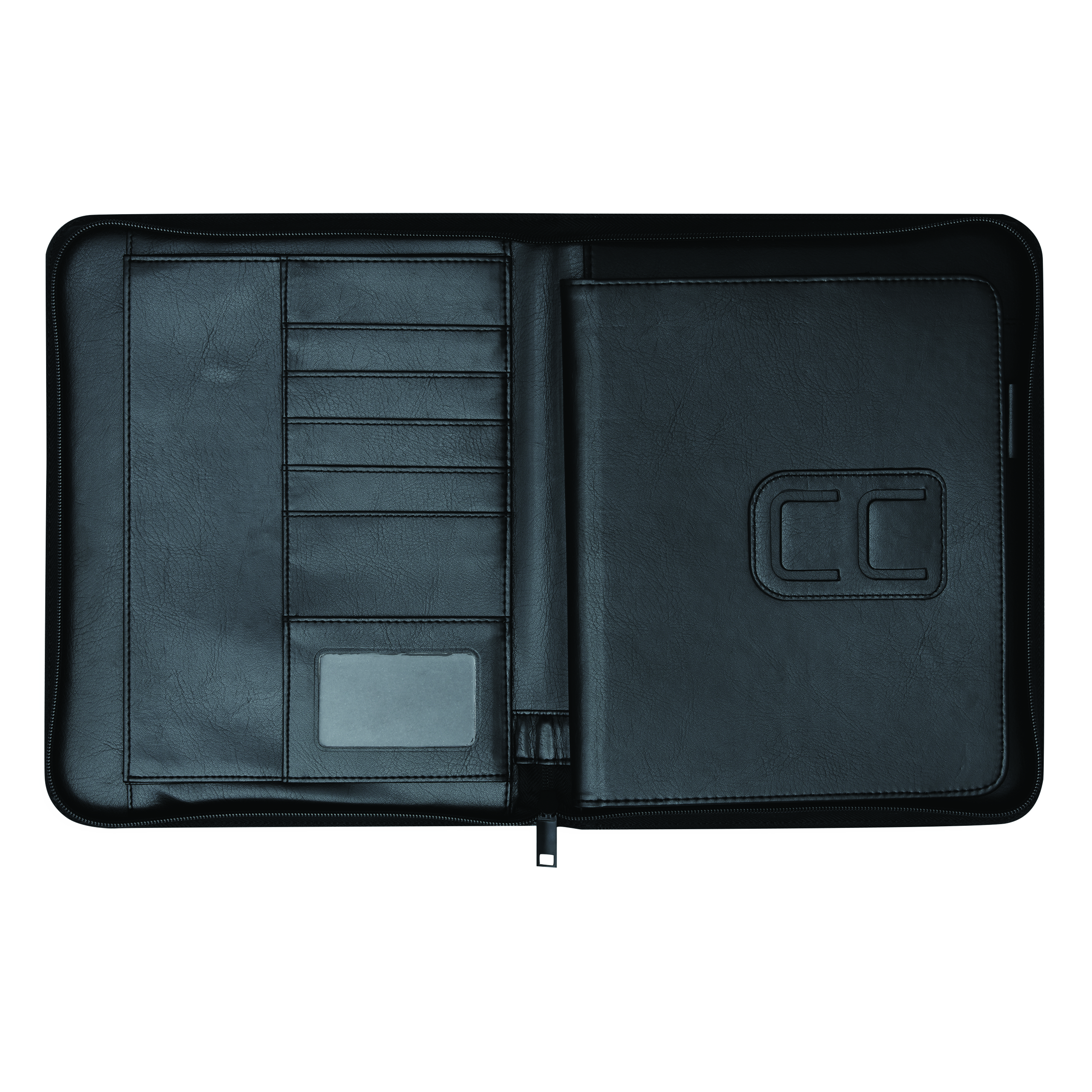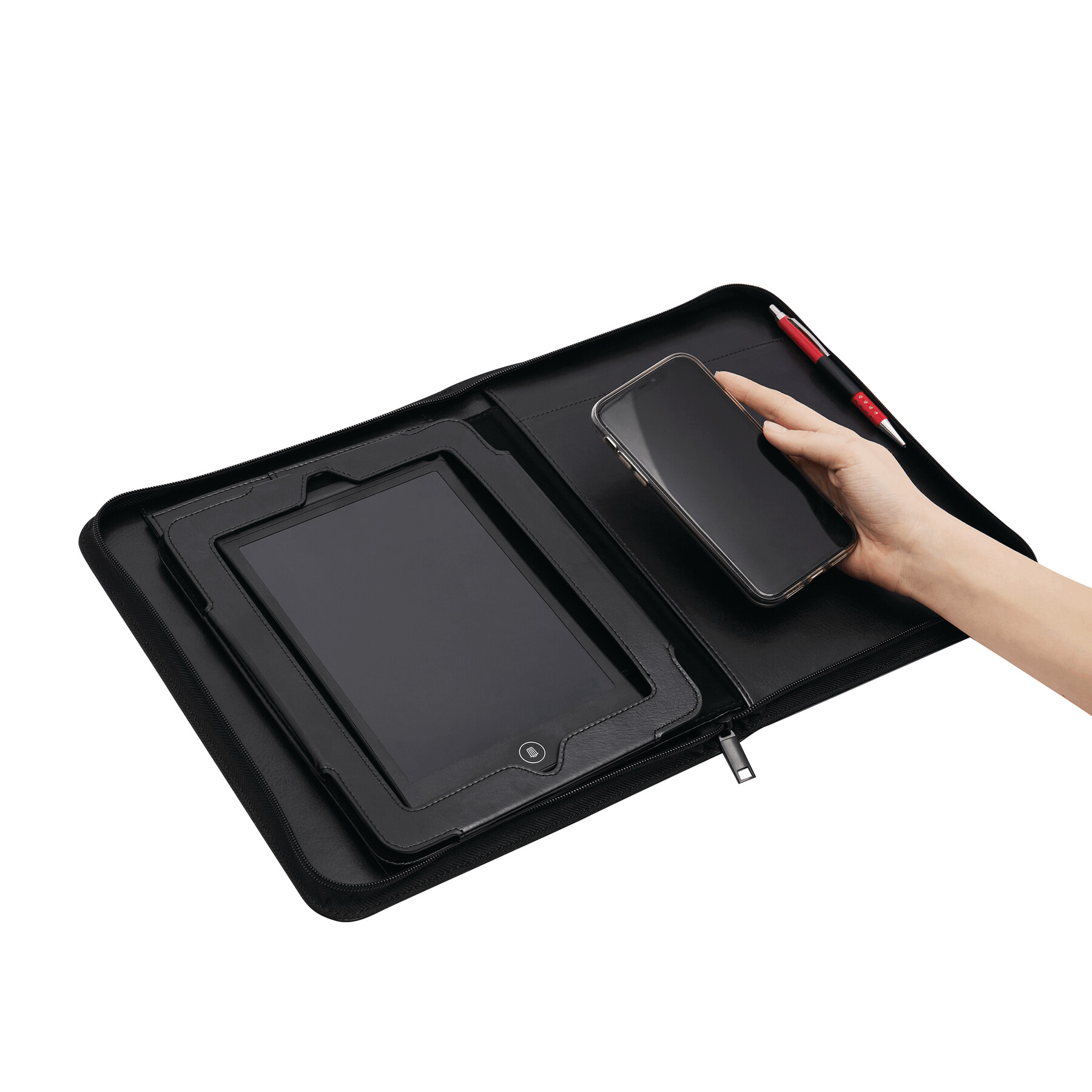 Portfolio NEW AGE z odczepianym etui na tablet (format ok. 24 x 17,7 cm). Wykonane z miękkiej syntetycznej skóry. Posiada 5 zakładek na wizytówki, 1 przezroczystą kieszeń, miejsce na podkładkę do pisania i przybory.