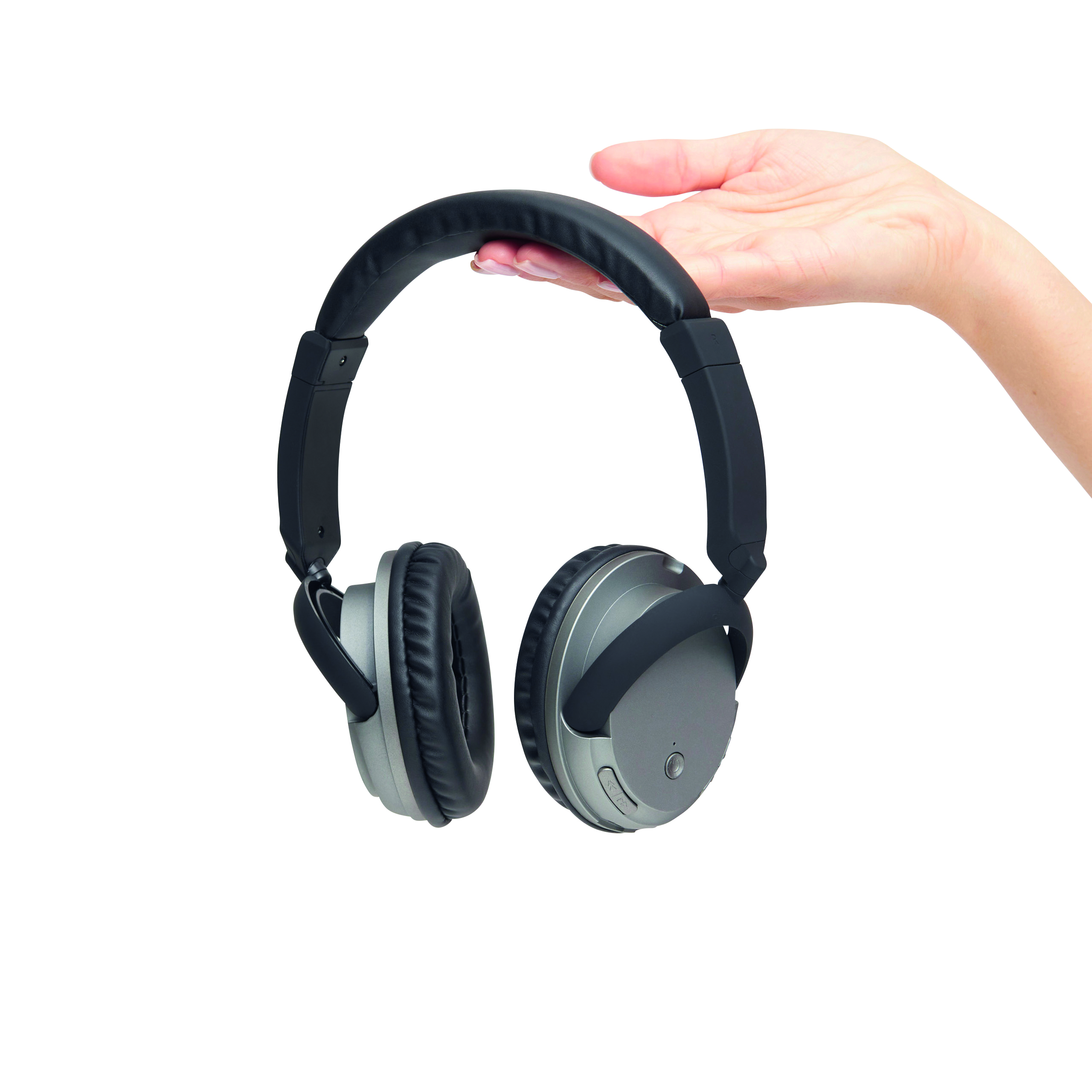 Słuchawki bezprzewodowe COMFY. Wyściełane muszle i opaska na głowę, prawa muszla ze zintegrowaną funkcją obsługi. Regulowany rozmiar. Ze zintegrowanym akumulatorem litowym o pojemności 180 mAh. Czas pracy ok. 1,5-2 godz. Posiada gniazdo ładowania micro USB i kabel ładujący z USB o długości ok. 30 cm oraz kabel audio o długości ok. 120 cm. Możliwość pracy nawet przy wyczerpanym akumulatorze przy użyciu kabla audio.