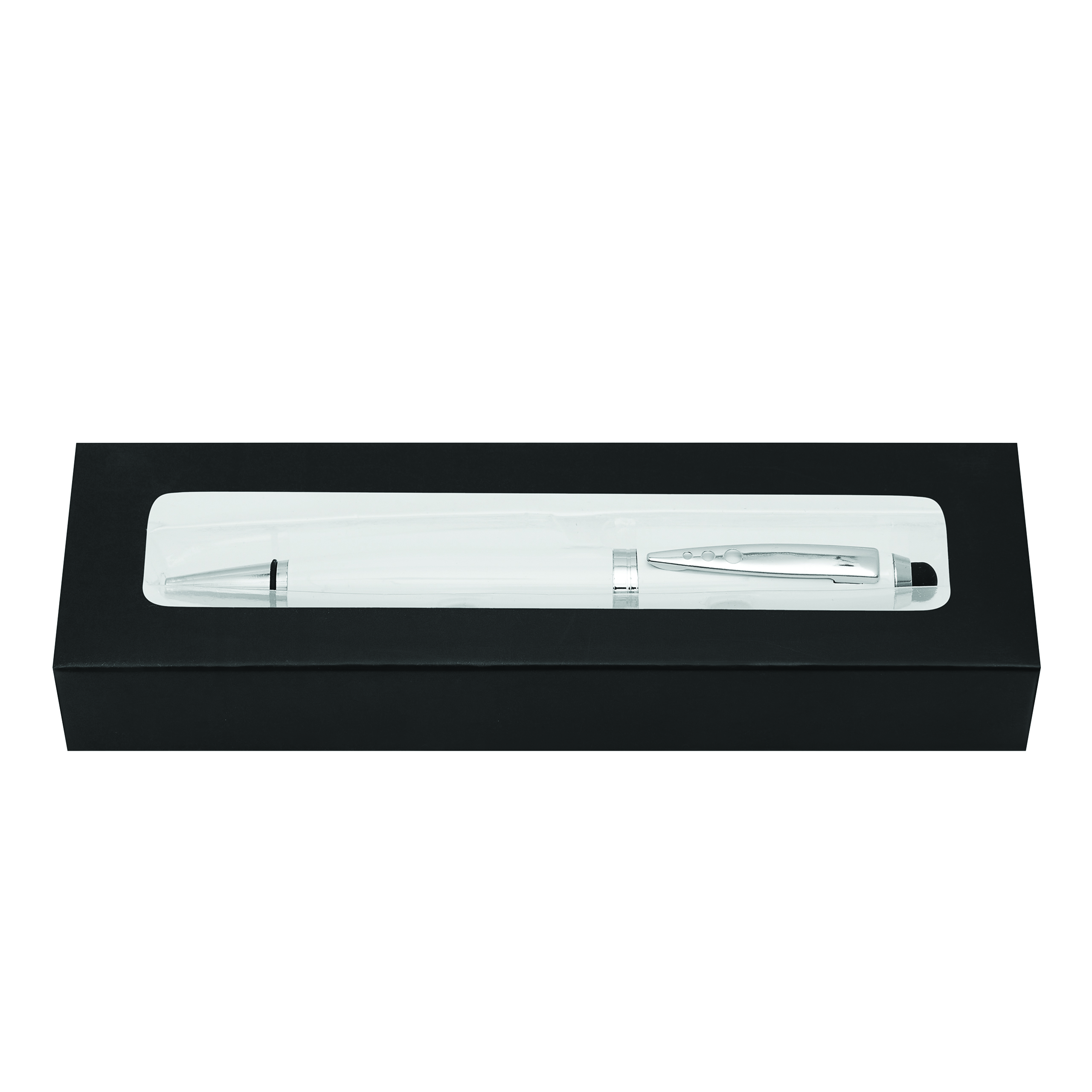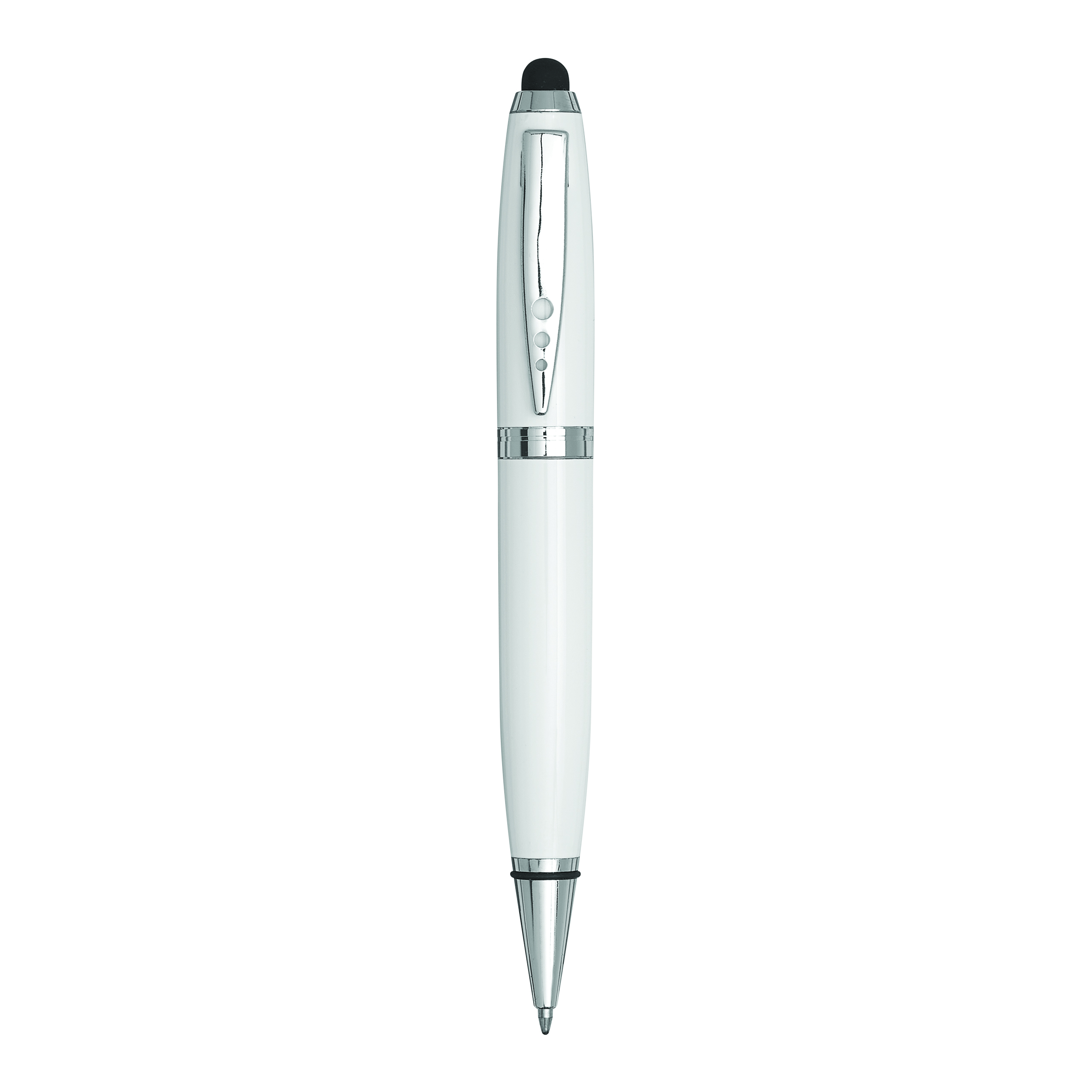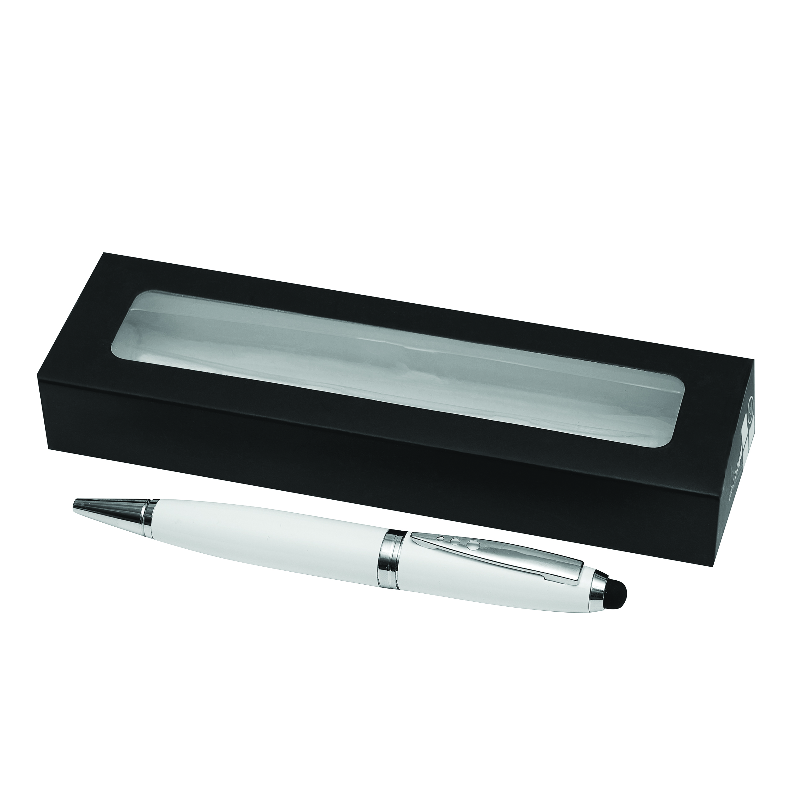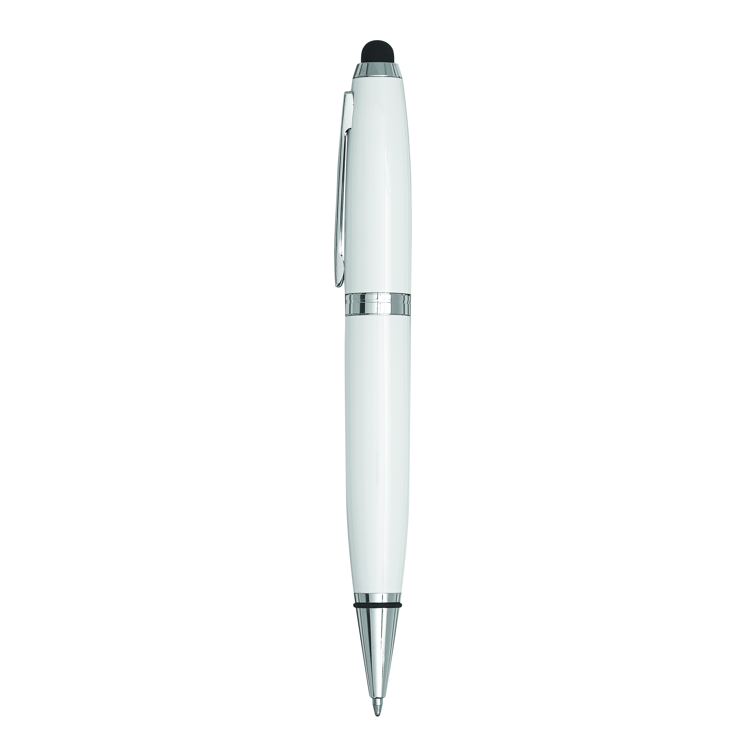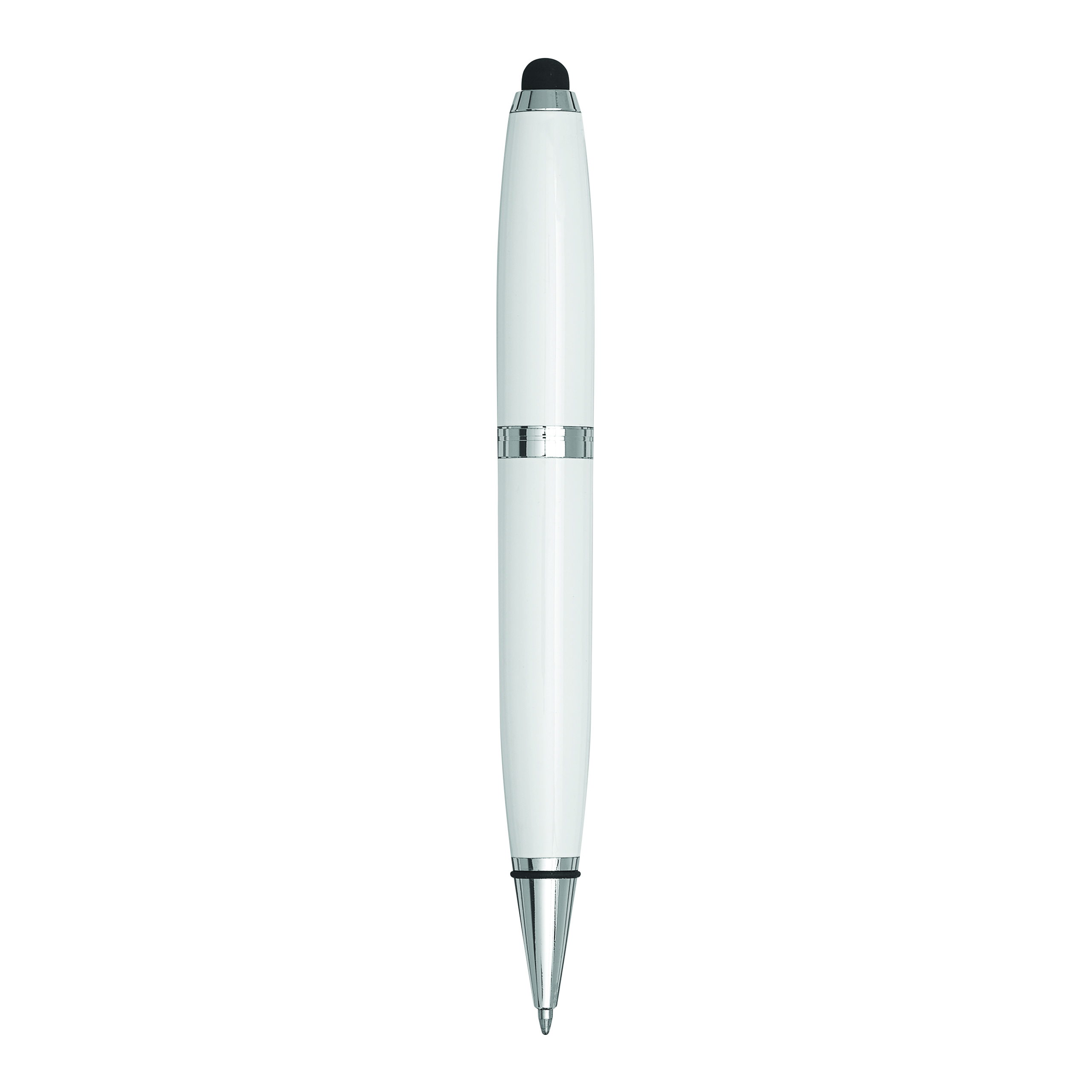 Długopis ze stali nierdzewnej TOUCH DOWN z pojemnym wkładem, mechanizmem obrotowym i końcówką do ekranów dotykowych. Z czarnego, błyszczącego metalu, ze srebrnymi elementami ozdobnymi. Czarny tusz. W pudełku.