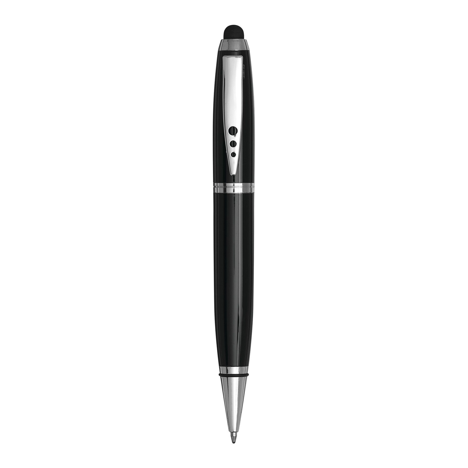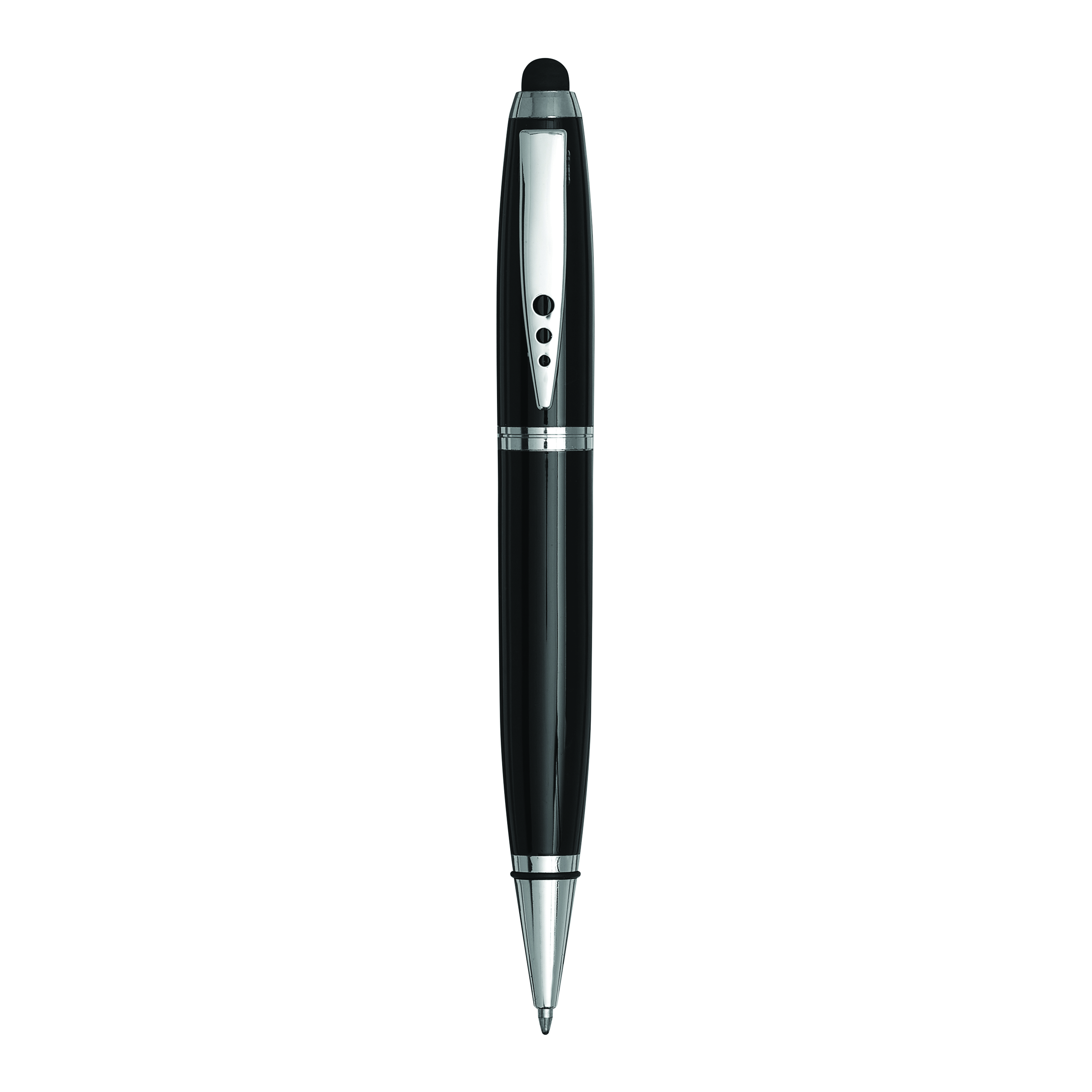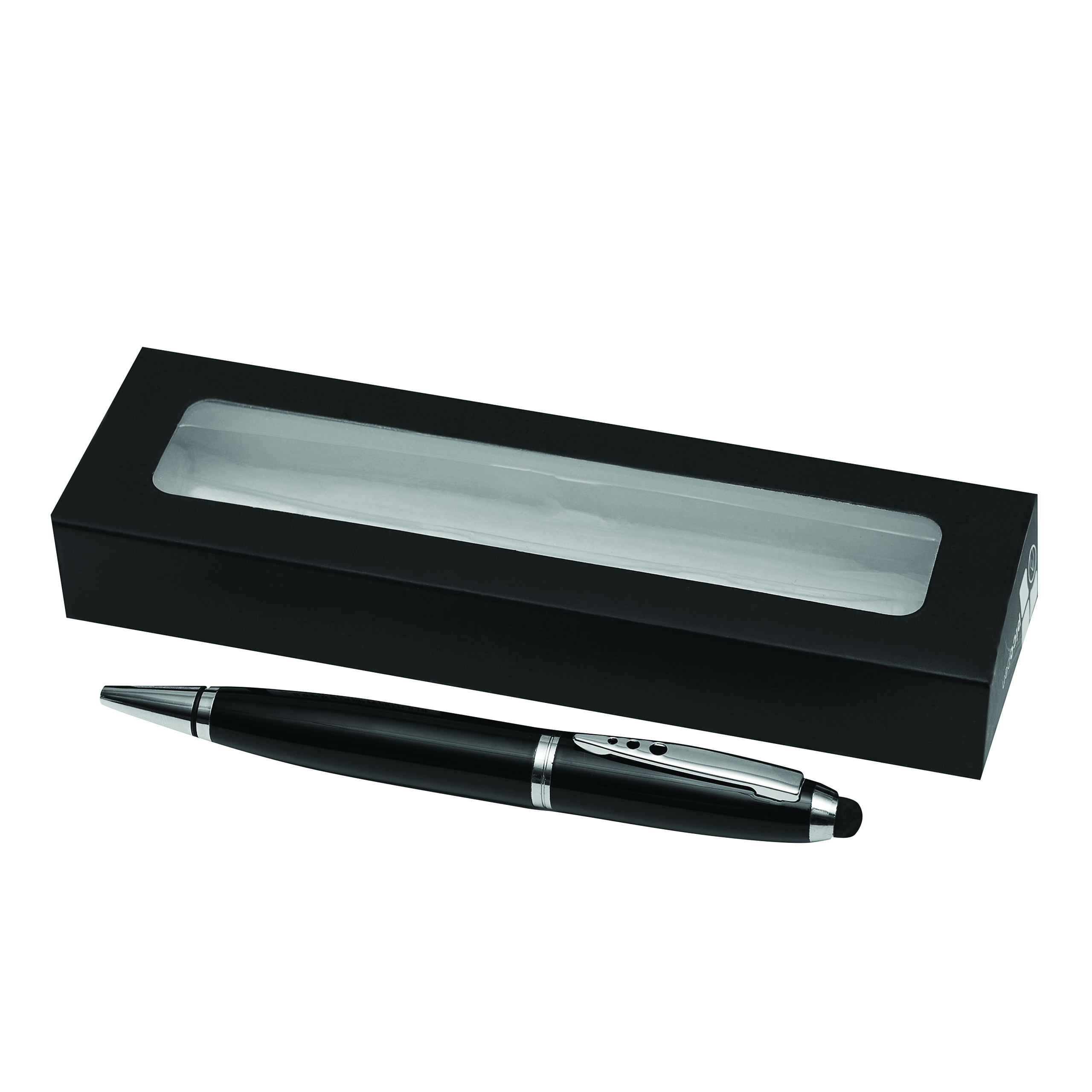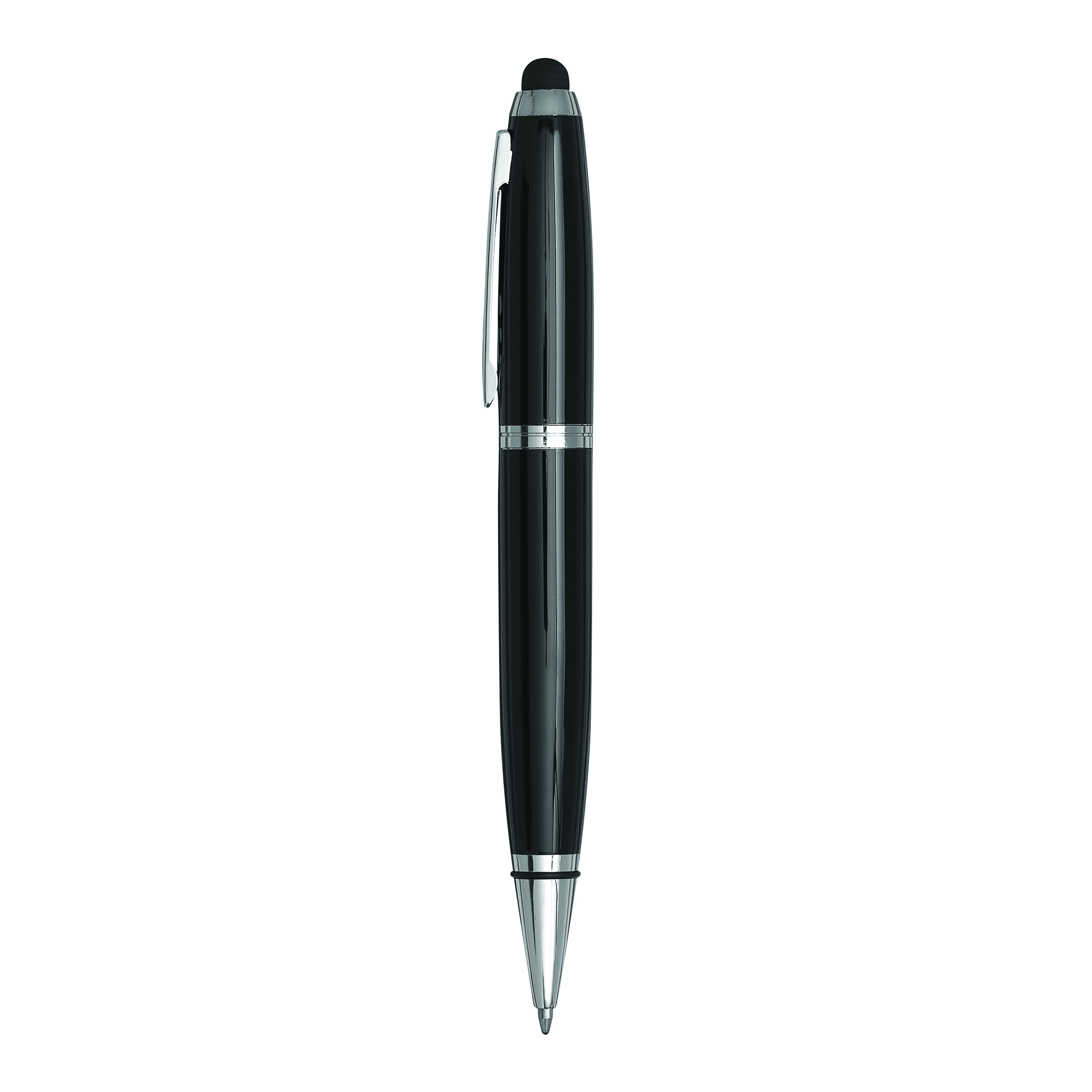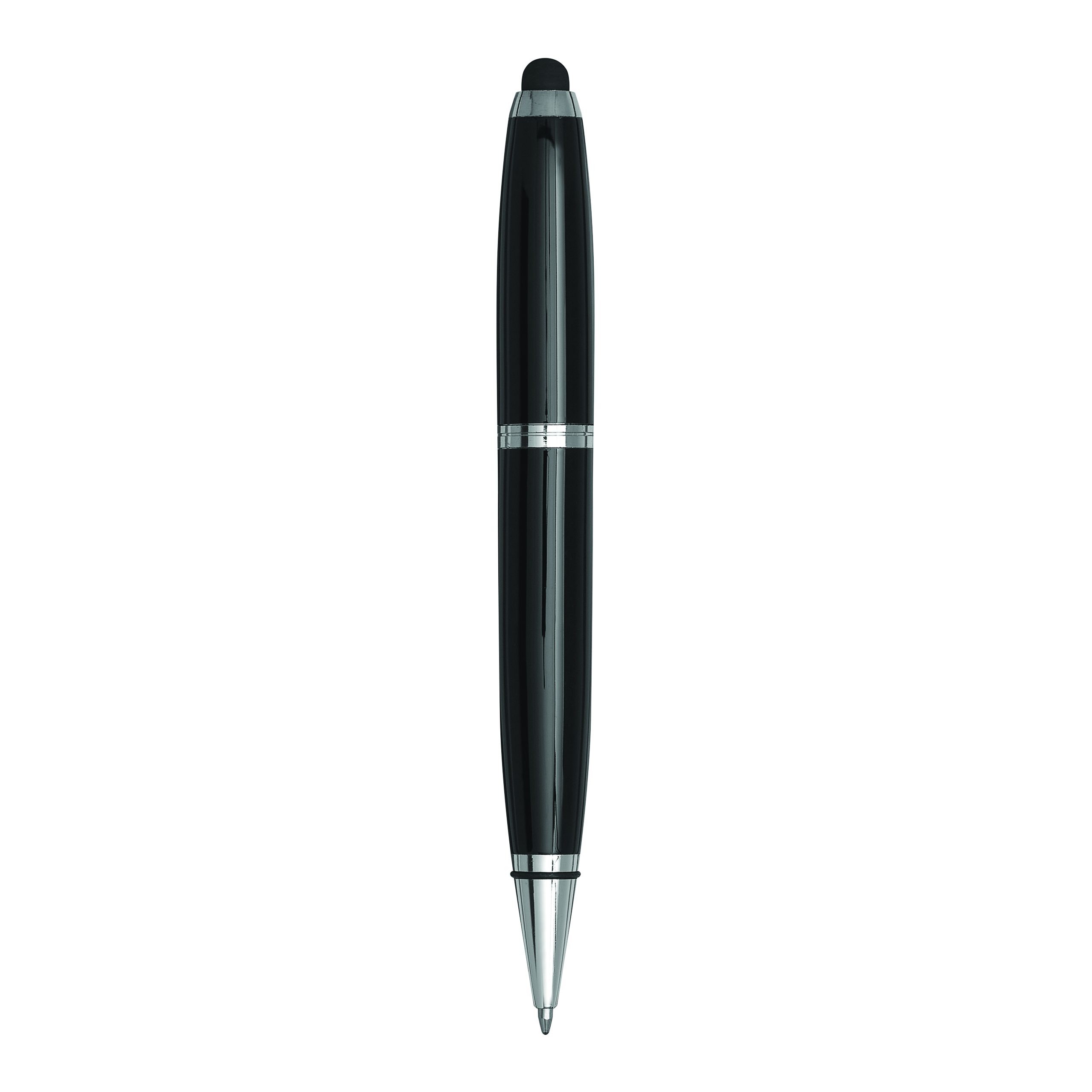 Długopis ze stali nierdzewnej TOUCH DOWN z pojemnym wkładem, mechanizmem obrotowym i końcówką do ekranów dotykowych. Z czarnego, błyszczącego metalu, ze srebrnymi elementami ozdobnymi. Czarny tusz. W pudełku.