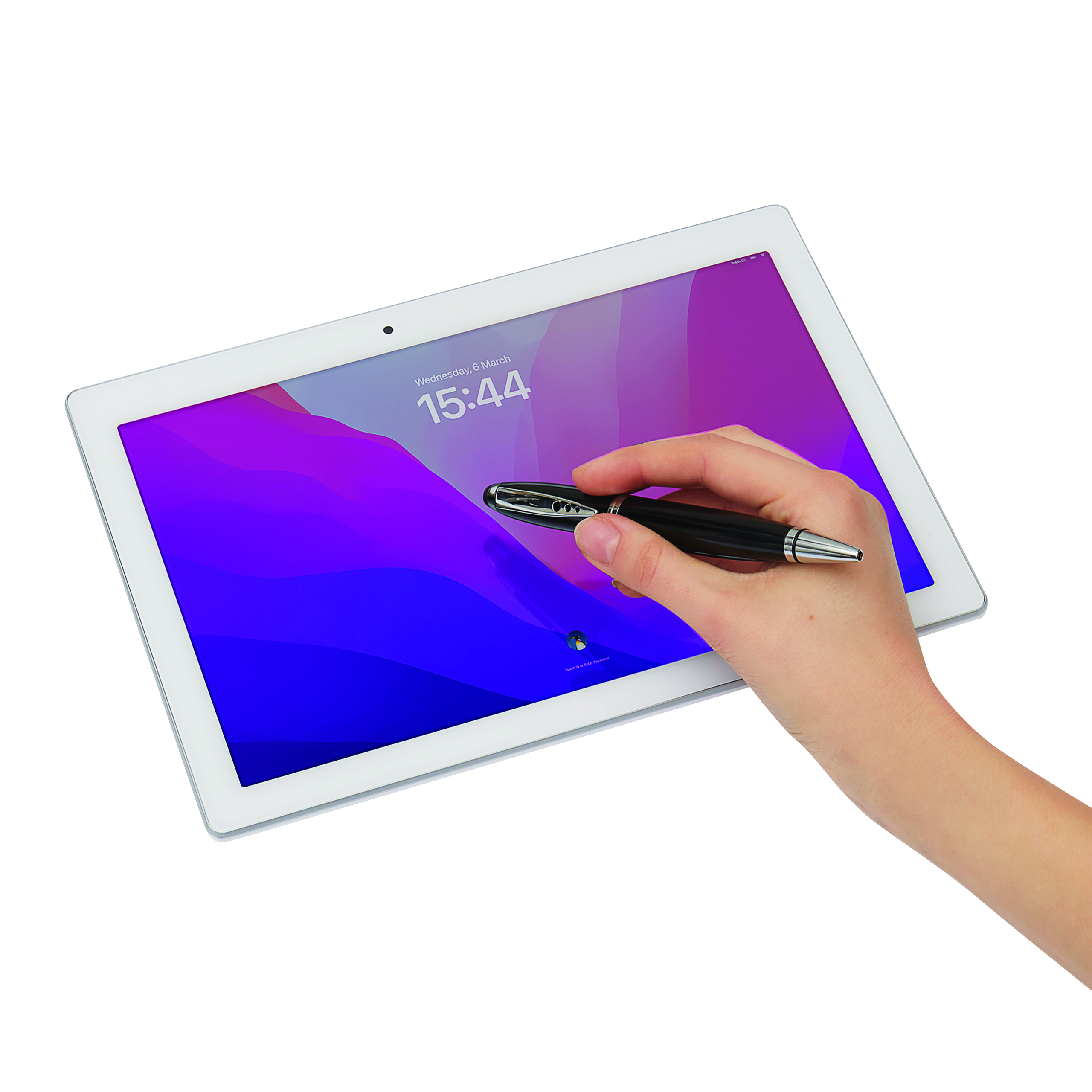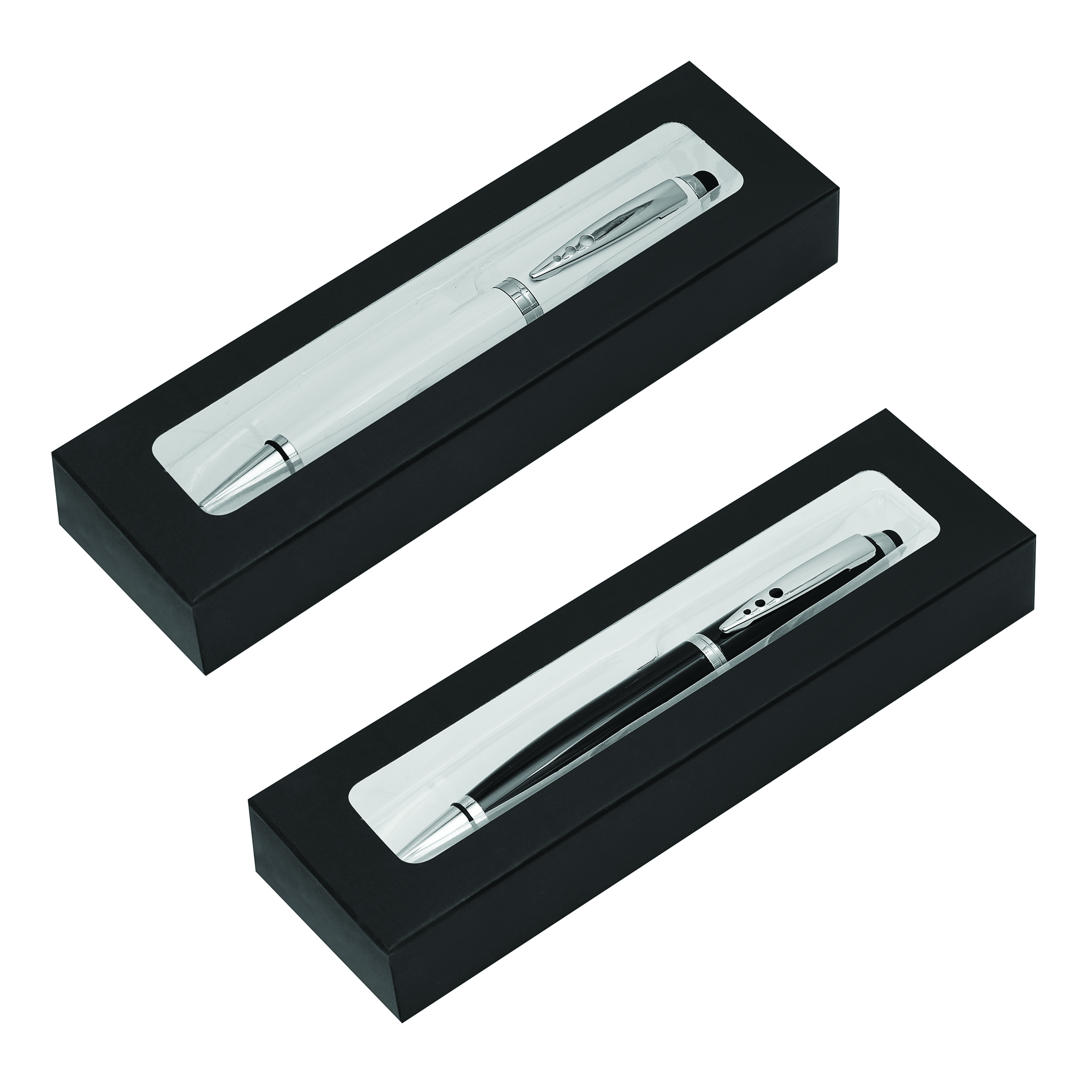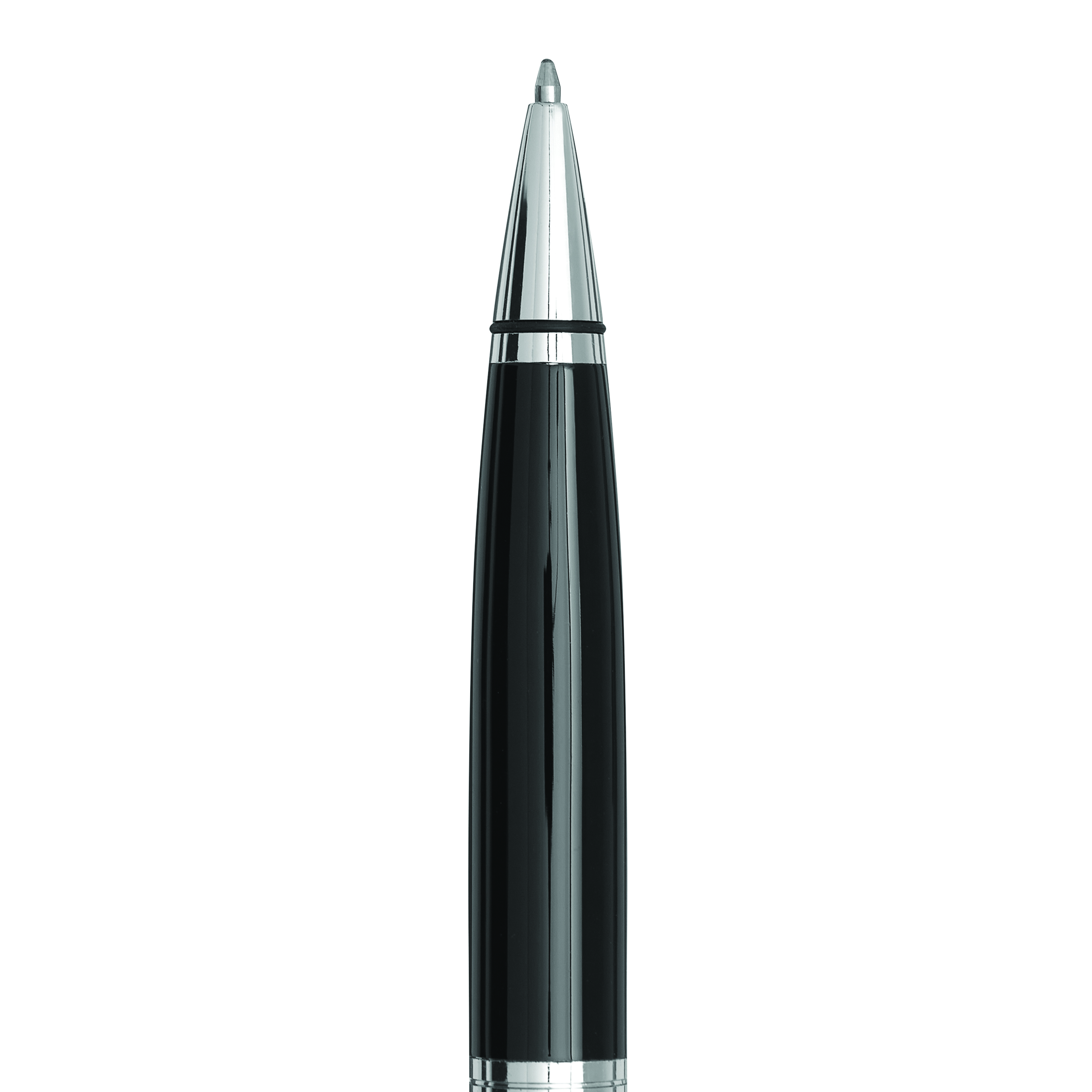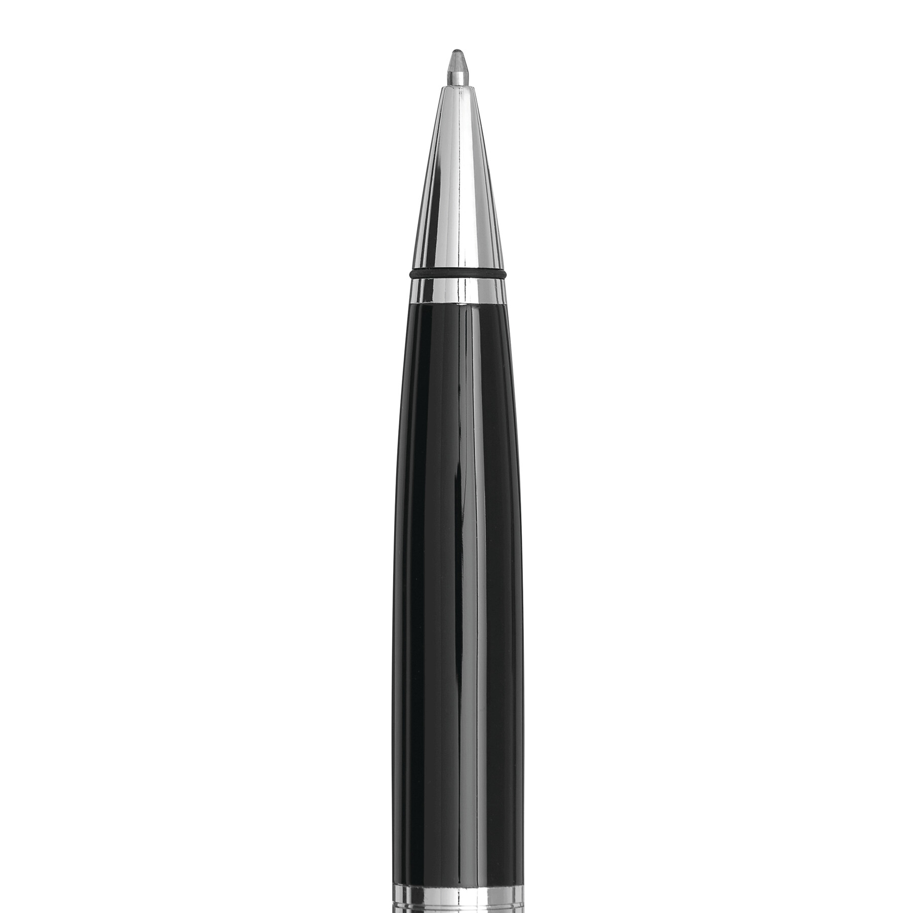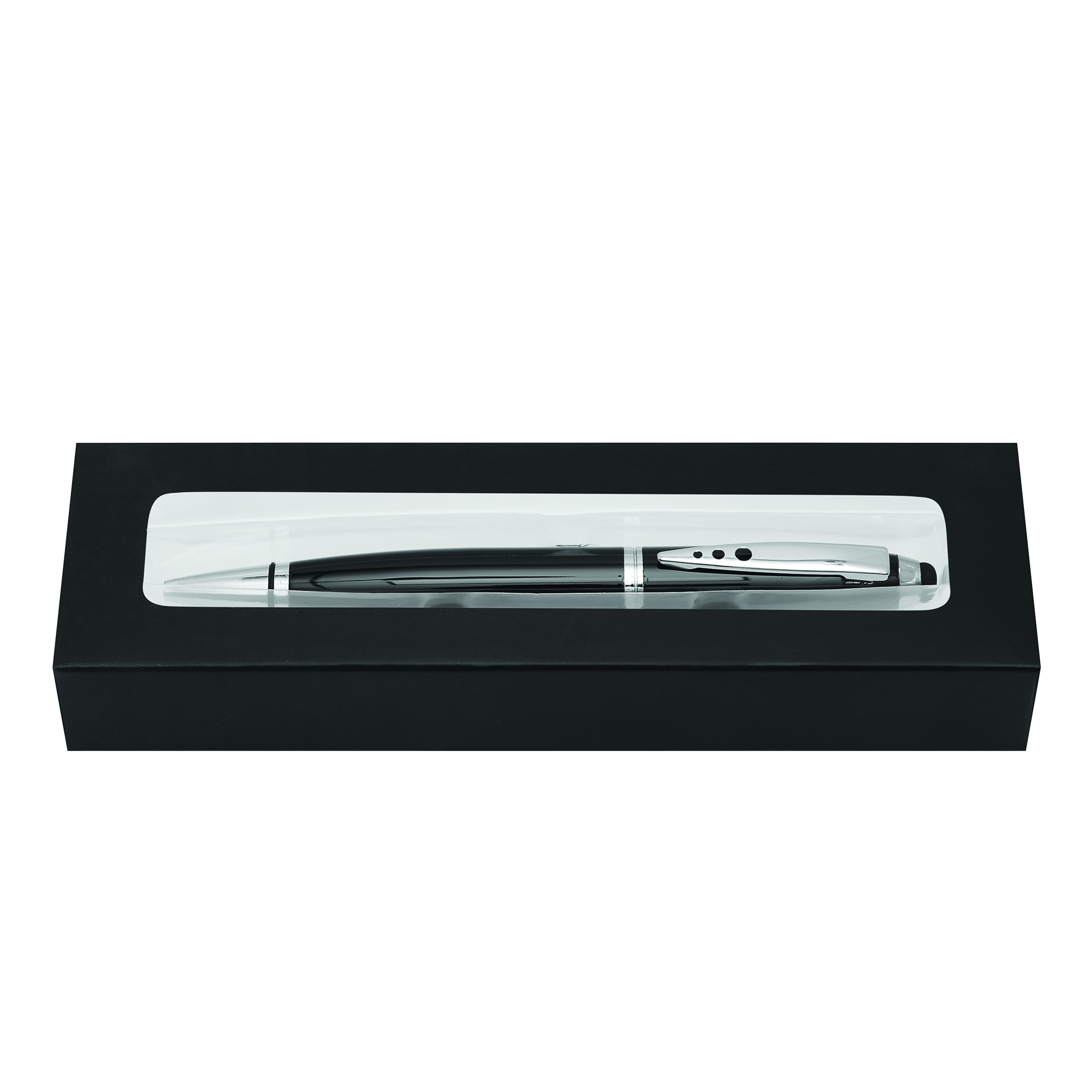 Długopis ze stali nierdzewnej TOUCH DOWN z pojemnym wkładem, mechanizmem obrotowym i końcówką do ekranów dotykowych. Z czarnego, błyszczącego metalu, ze srebrnymi elementami ozdobnymi. Czarny tusz. W pudełku.