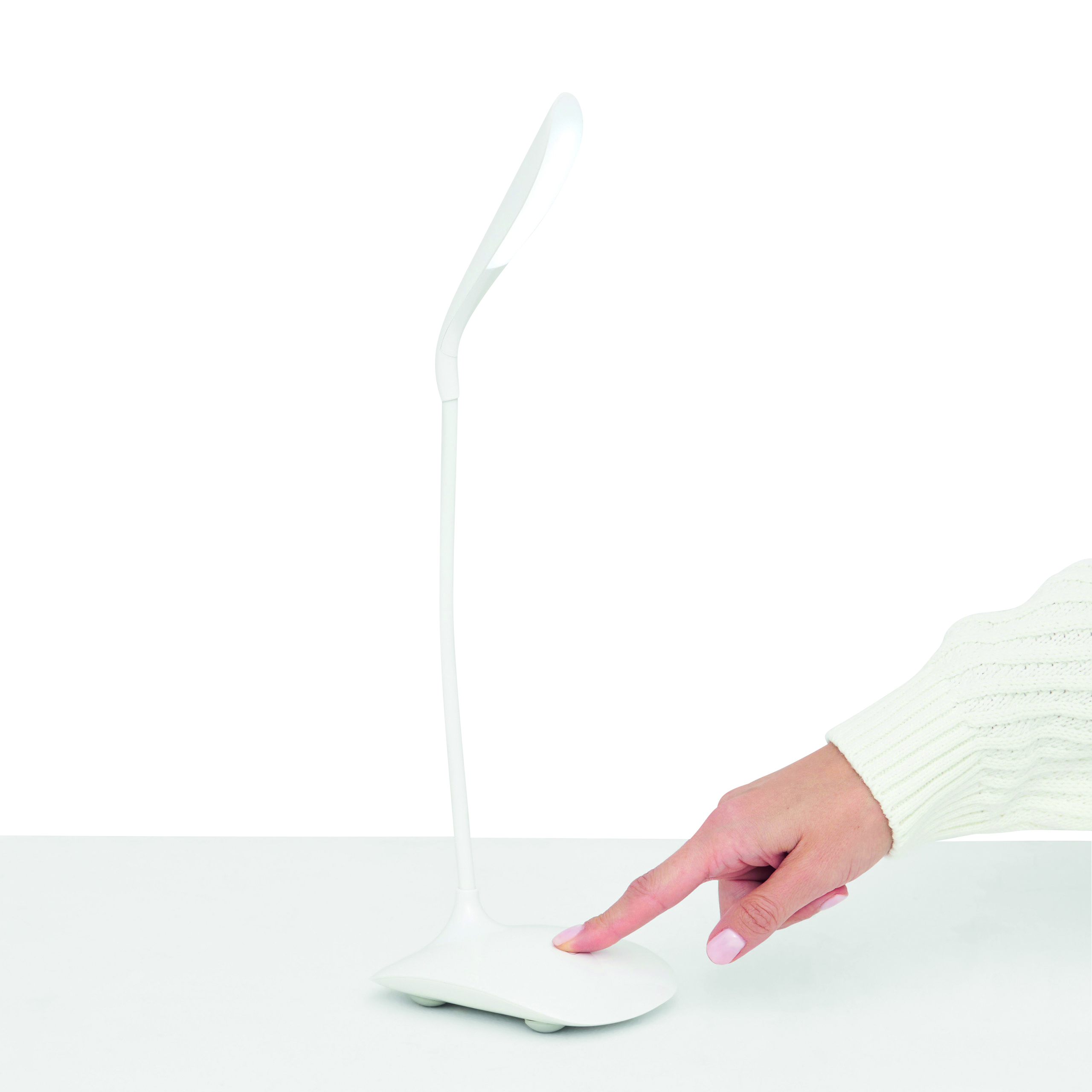 Lampka biurkowa SWAN z elastycznym, obrotowym ramieniem z 14 diodami LED. Funkcja przyciemniania, 3 poziomy jasności światła, dotykowy włącznik/wyłącznik, zasilana przez kabel USB o długości ok. 98 cm. Wszechstronna w pracy dzięki wbudowanemu akumulatorowi, zużycie energii do 1,5 W. Podstawa gumowana dla lepszej przyczepności. W pudełku.