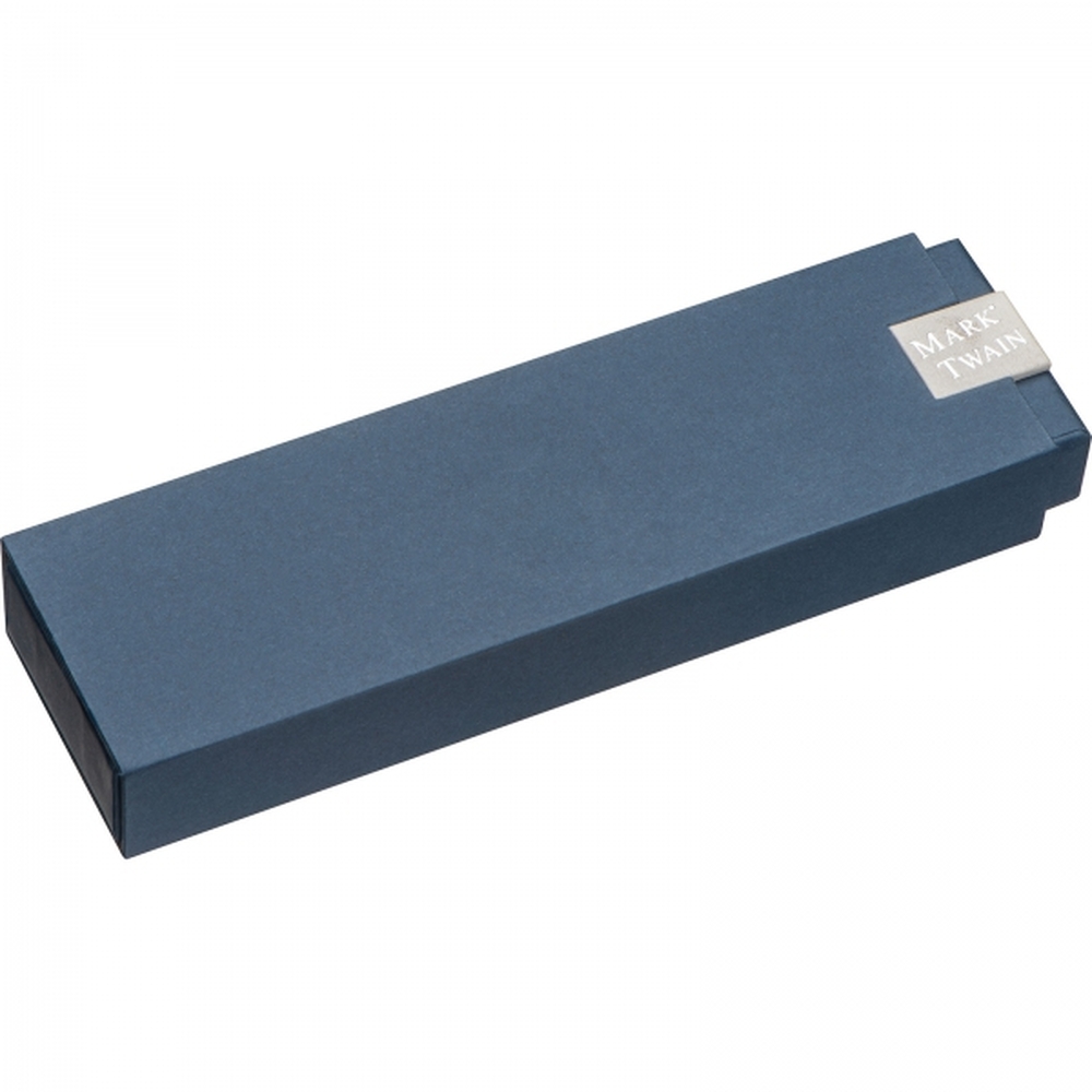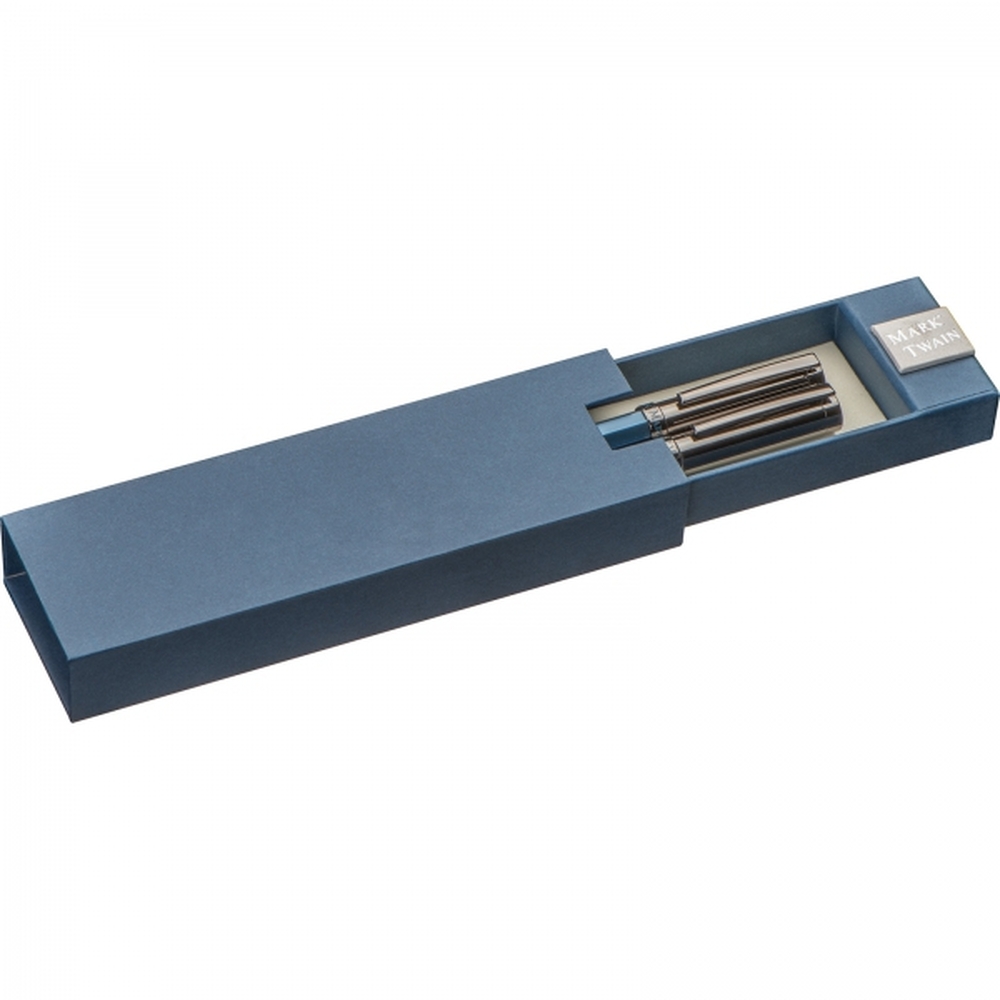 Zestaw piśmienniczy marki Mark Twain, składający się z długopisu i pióra kulkowego. Zestaw wykonany z metalu, piszący na niebiesko.