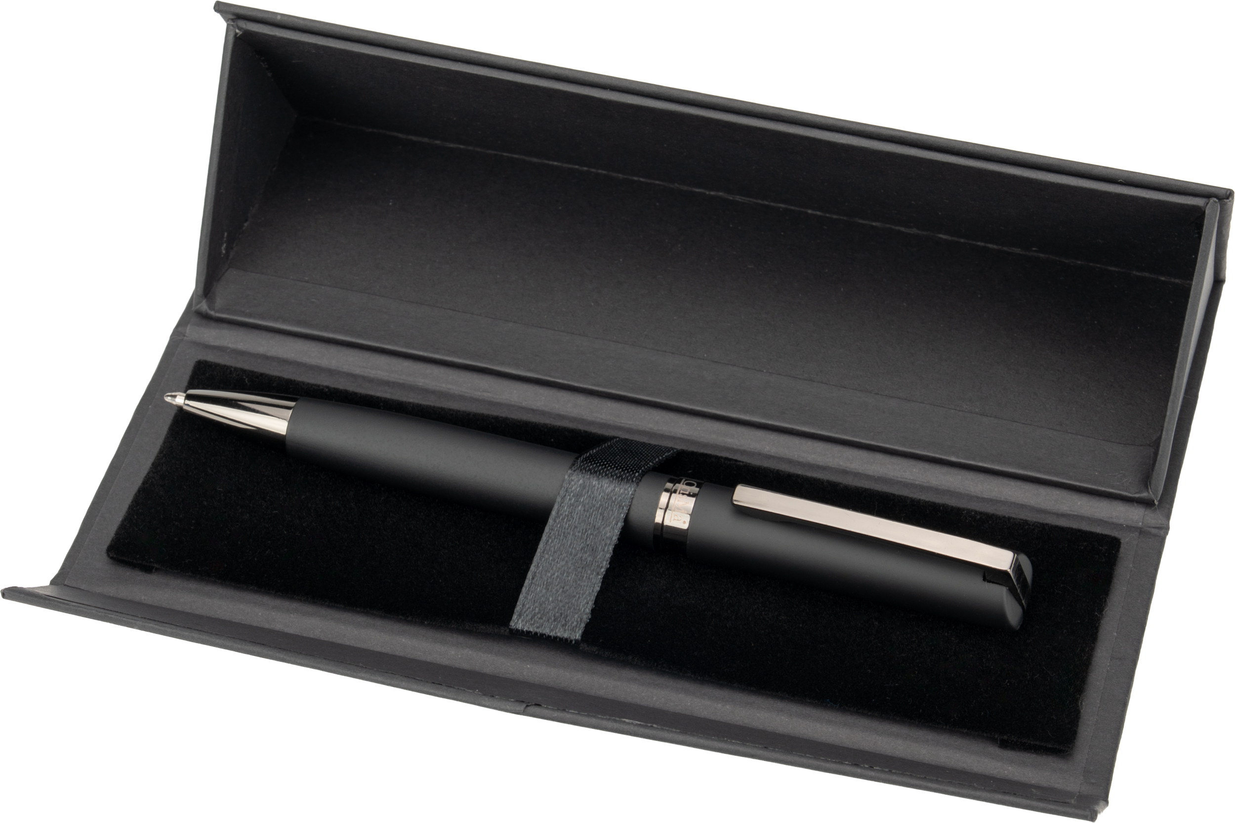 Przekręcany, metalowy długopis z gumową powierzchnią i niebieskim wkładem.
