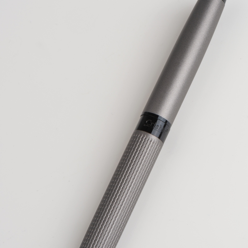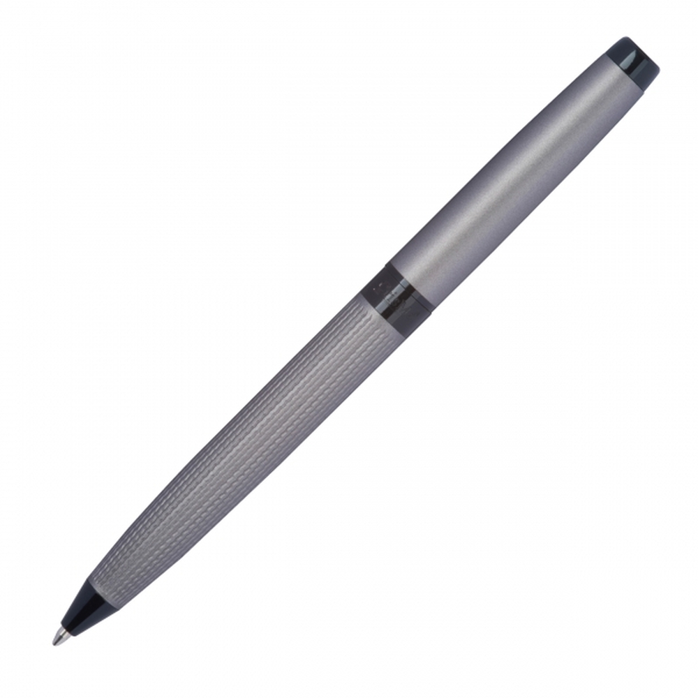 Matowy, przekręcany długopis, wykonany ze stali nierdzewnej, z czarnymi akcentami, posiada wkład piszący na niebiesko.