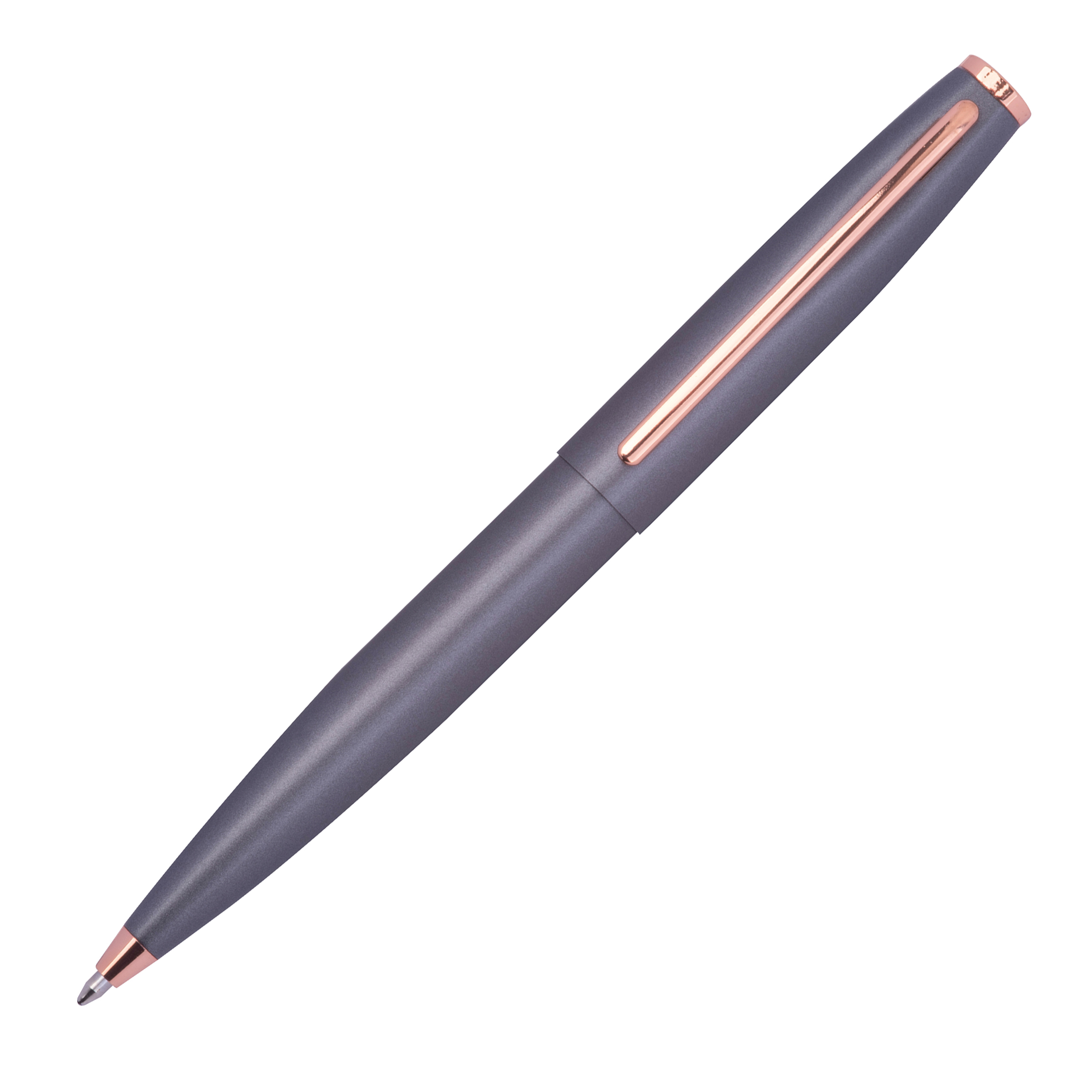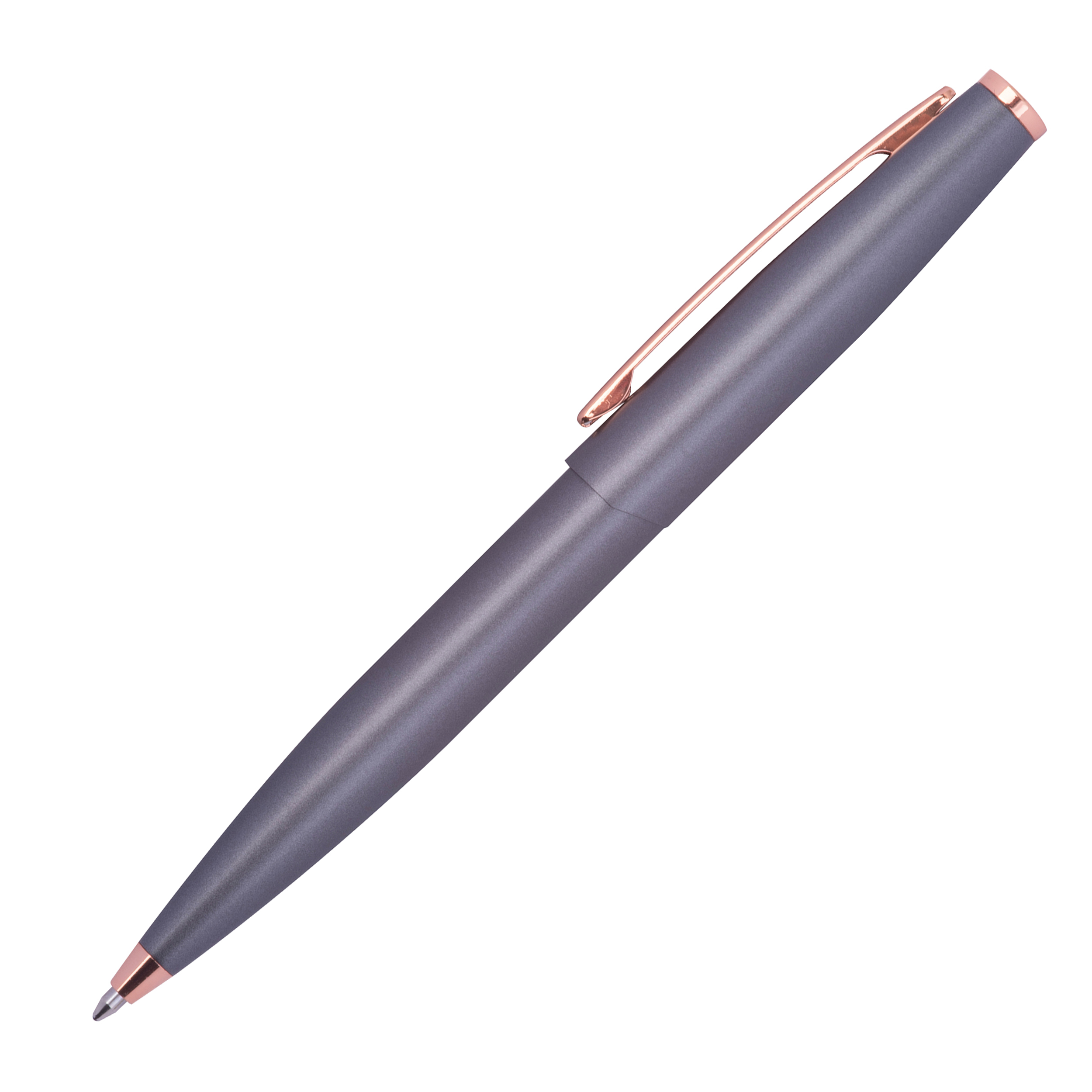 Zestaw piśmienniczy CrisMa wykonany z metalu, składający się z obrotowego długopisu (o długości pisania do 800 m) oraz pióra kulkowego (o długości pisania do 500 m), zdobionych różowozłotymi detalami. Oba przybory piszą w kolorze niebieskim i są zapakowane w eleganckie, czarne pudełko.