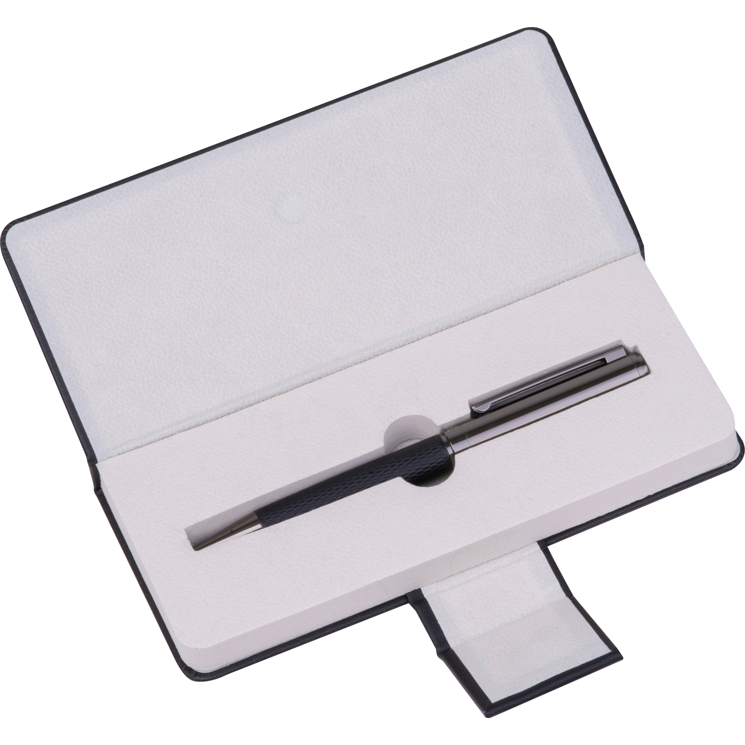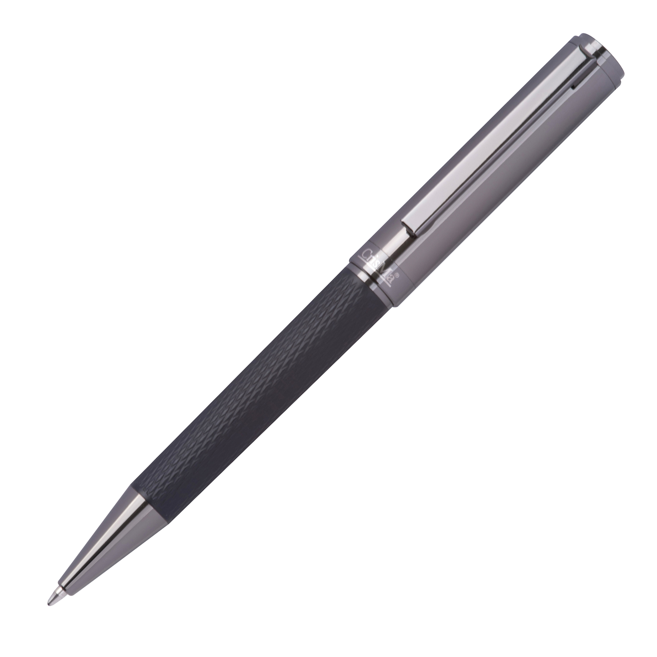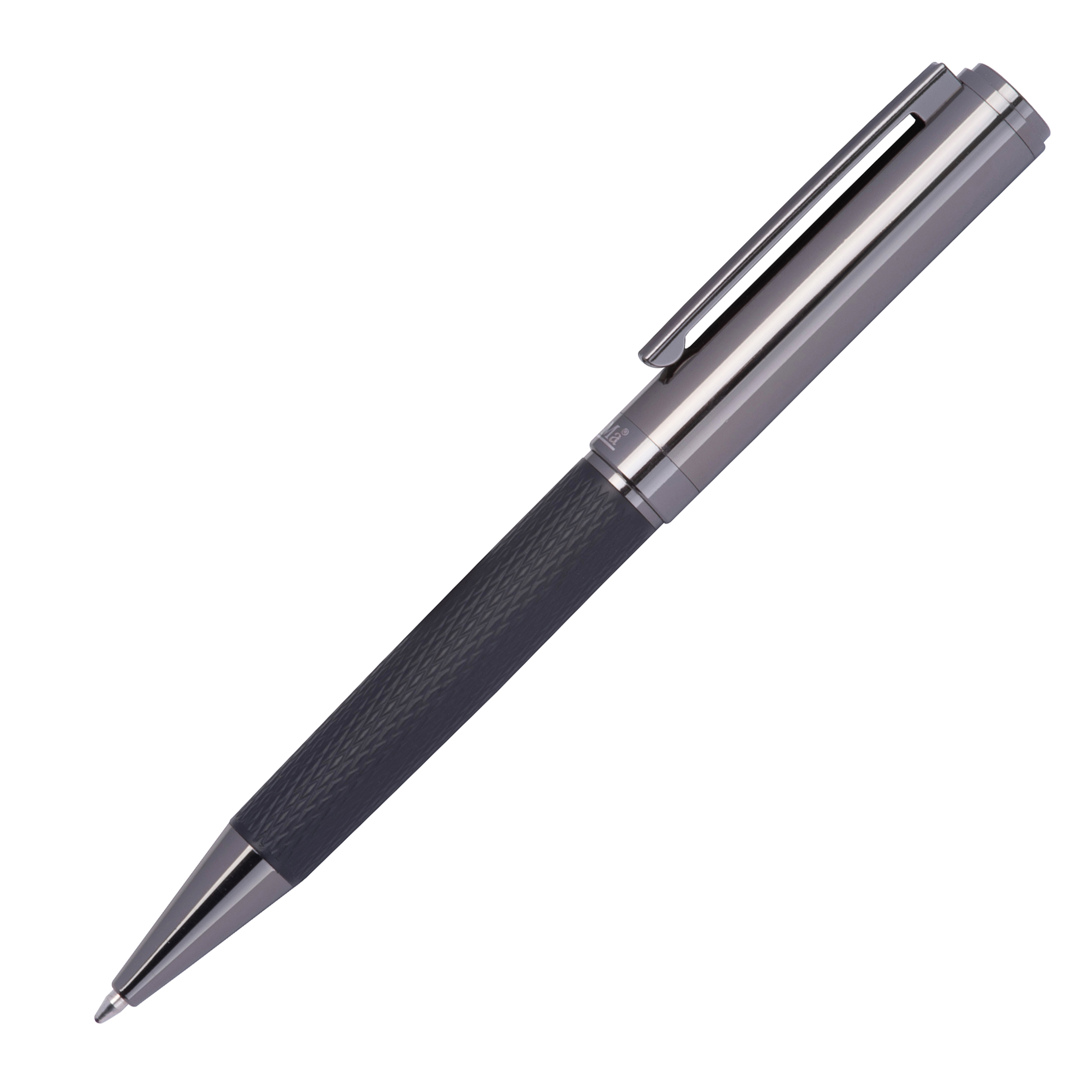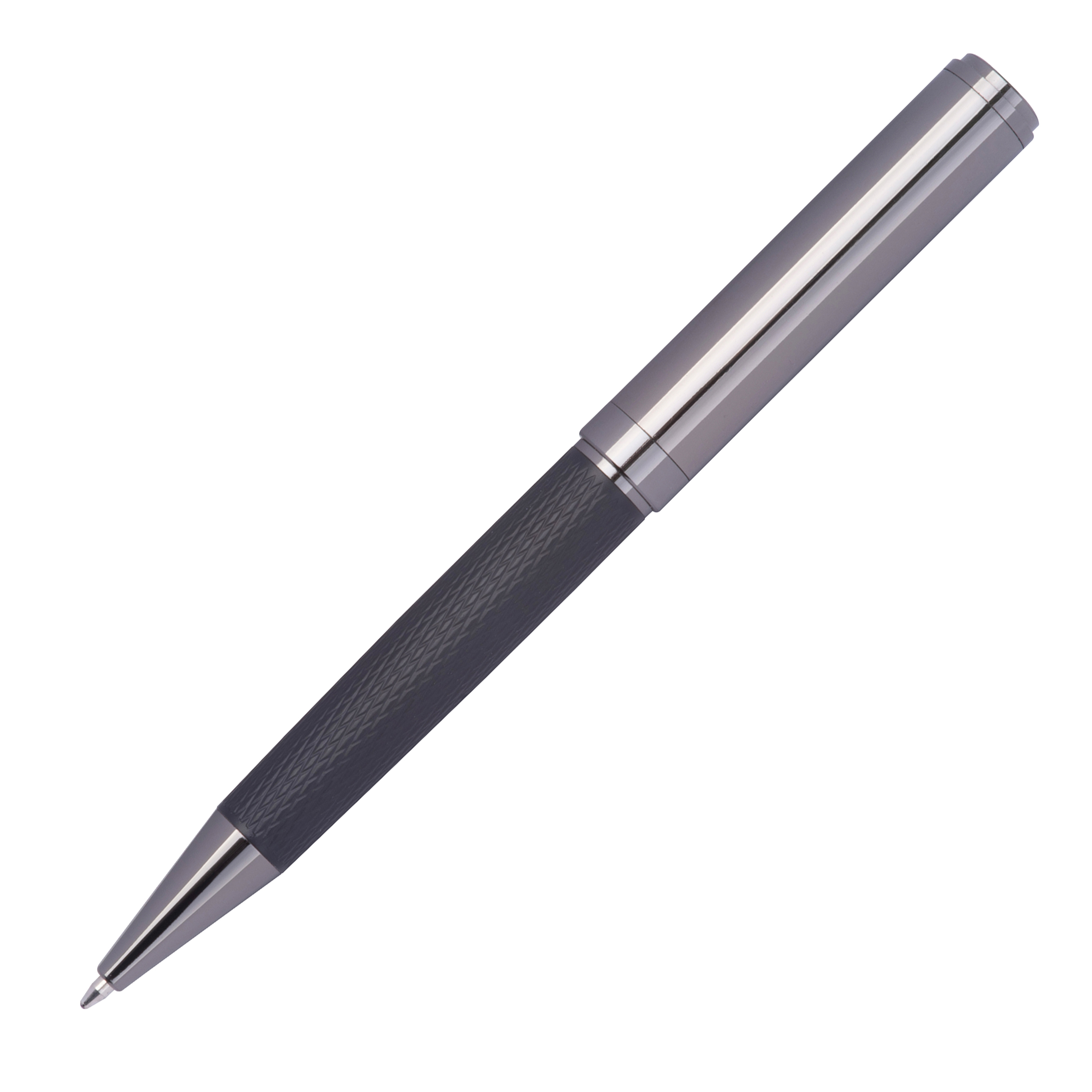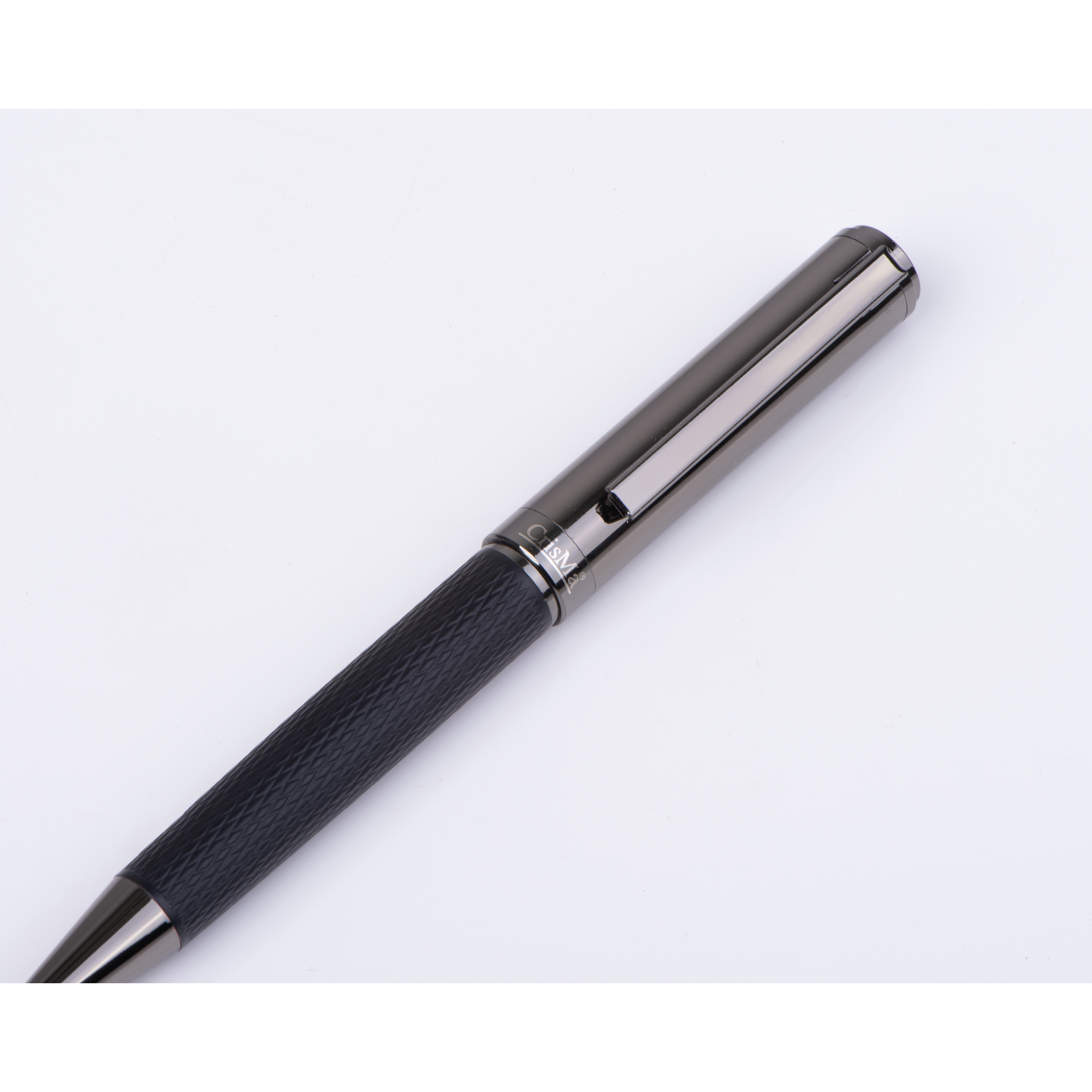 Metalowy długopis z dekoracyjnym wzorem i logo CrisMa, z niebieskim wkładem o długości pisania 1200 m, zapakowany w pudełko z magnetycznym zamknięciem.