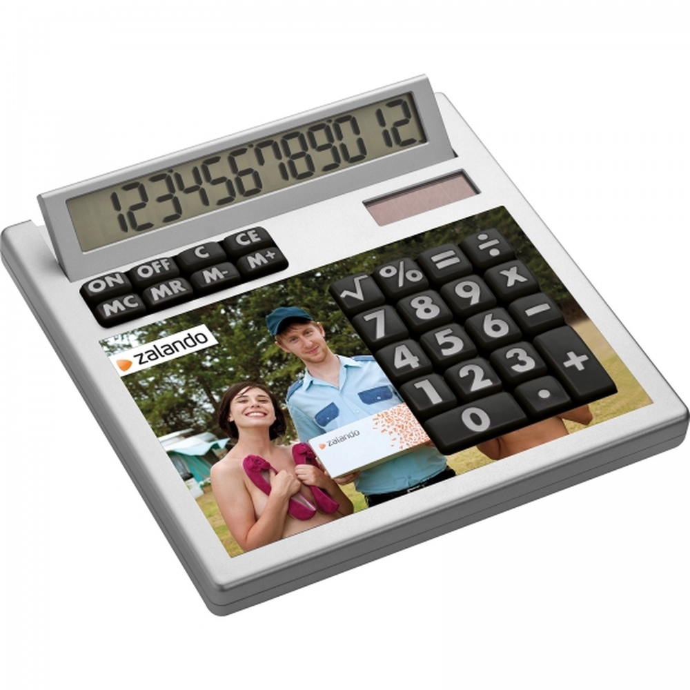 Niepowtarzalny kalkulator z kolekcji CrisMa z 12 cyfrowym wyświetlaczem, wykonany z plastiku w kolorze srebrnym. Posiada nietypową nakładkę w kolorze białym, która może zostać w całości nadrukowana. Zasilanie solarne i na baterię.