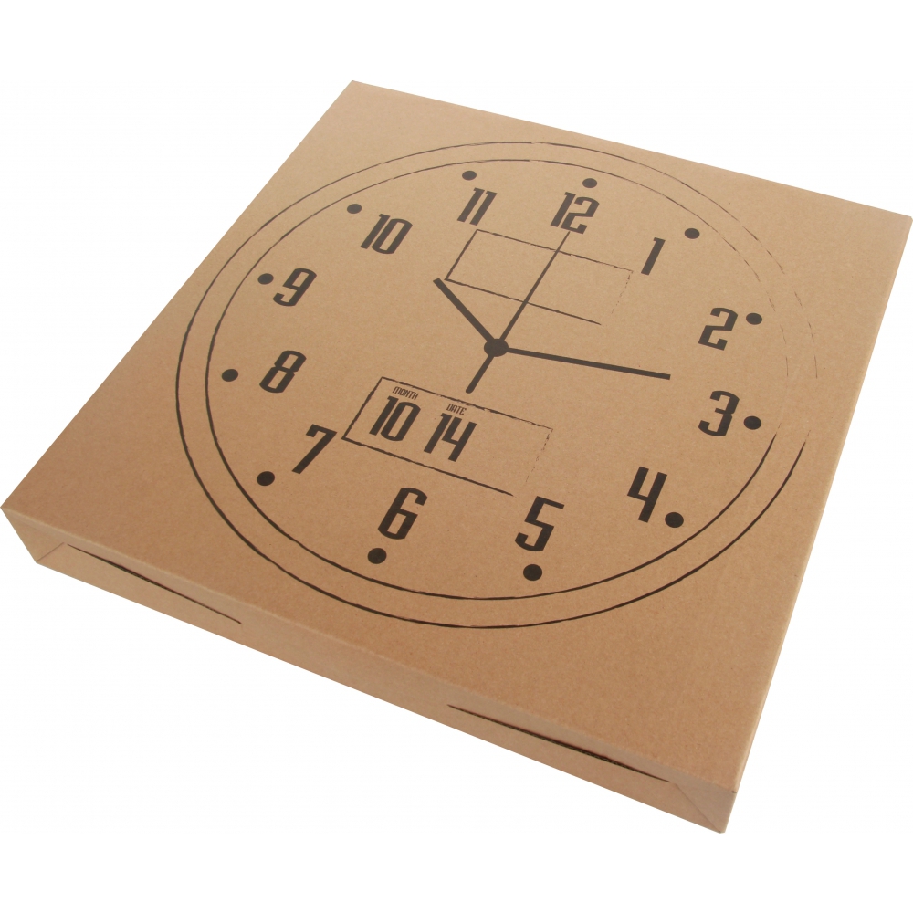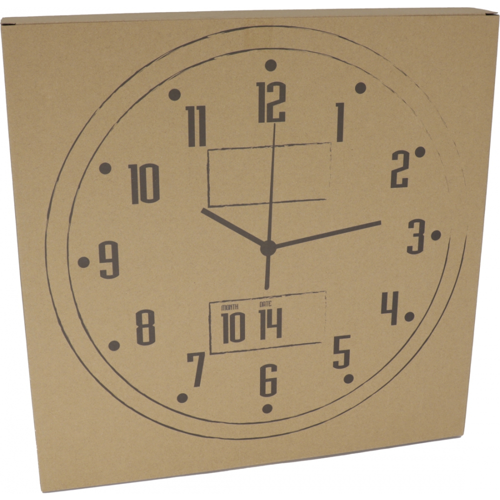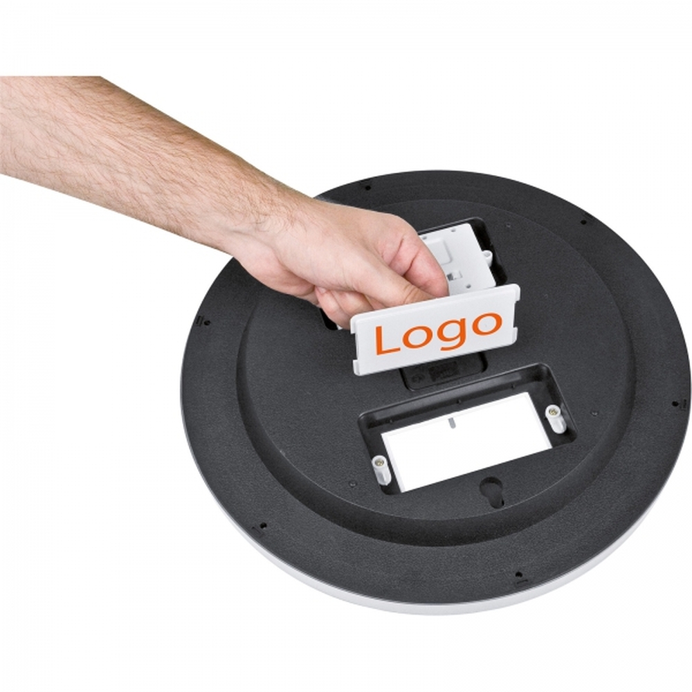 Analogowy zegar ścienny CrisMa z dużym, cyfrowym wyświetlaczem, pokazującym datę, dzień tygodnia oraz temperaturę. Logotyp można umieścić na specjalnym panelu reklamowym, pod ochronną szybką zegara.