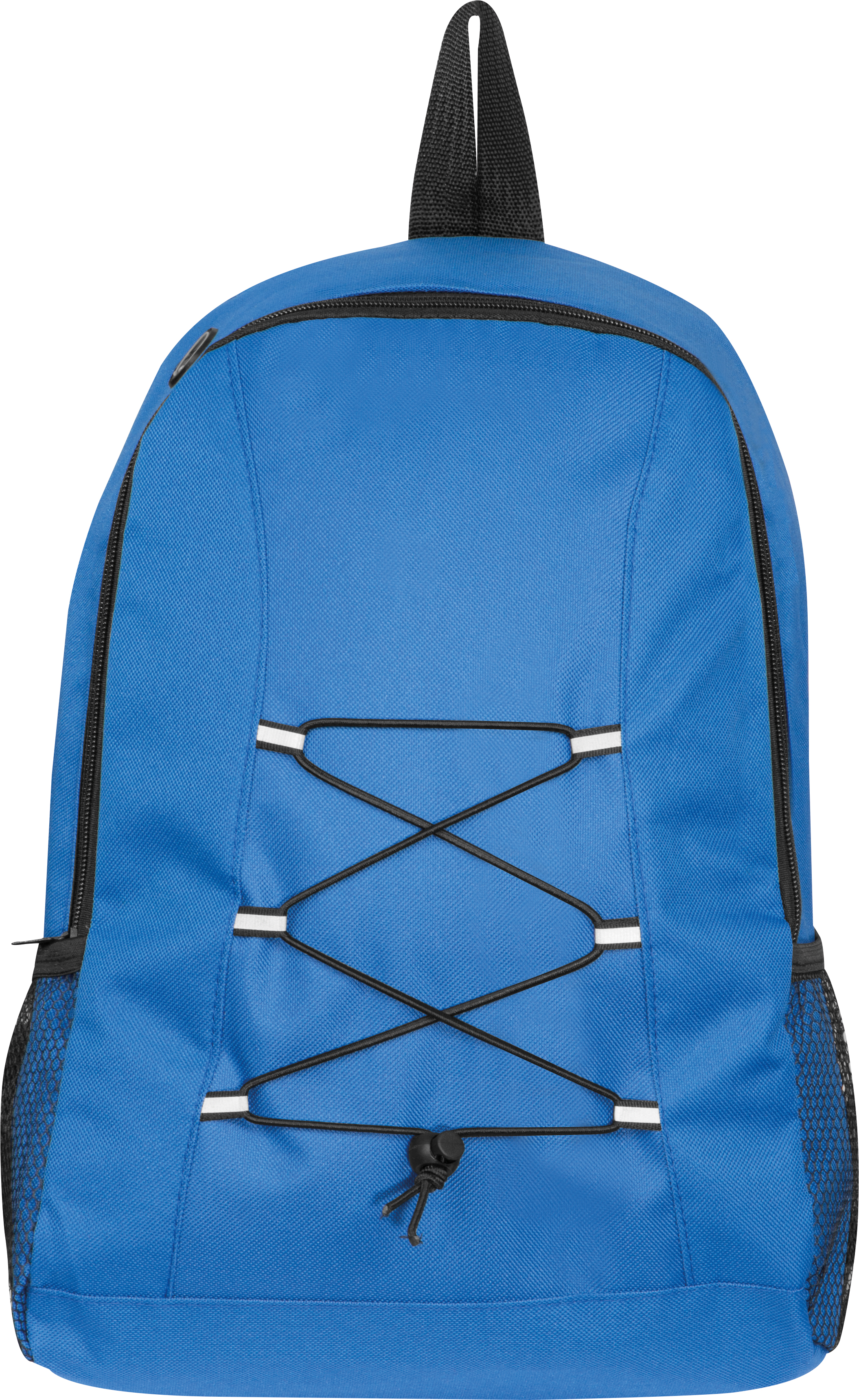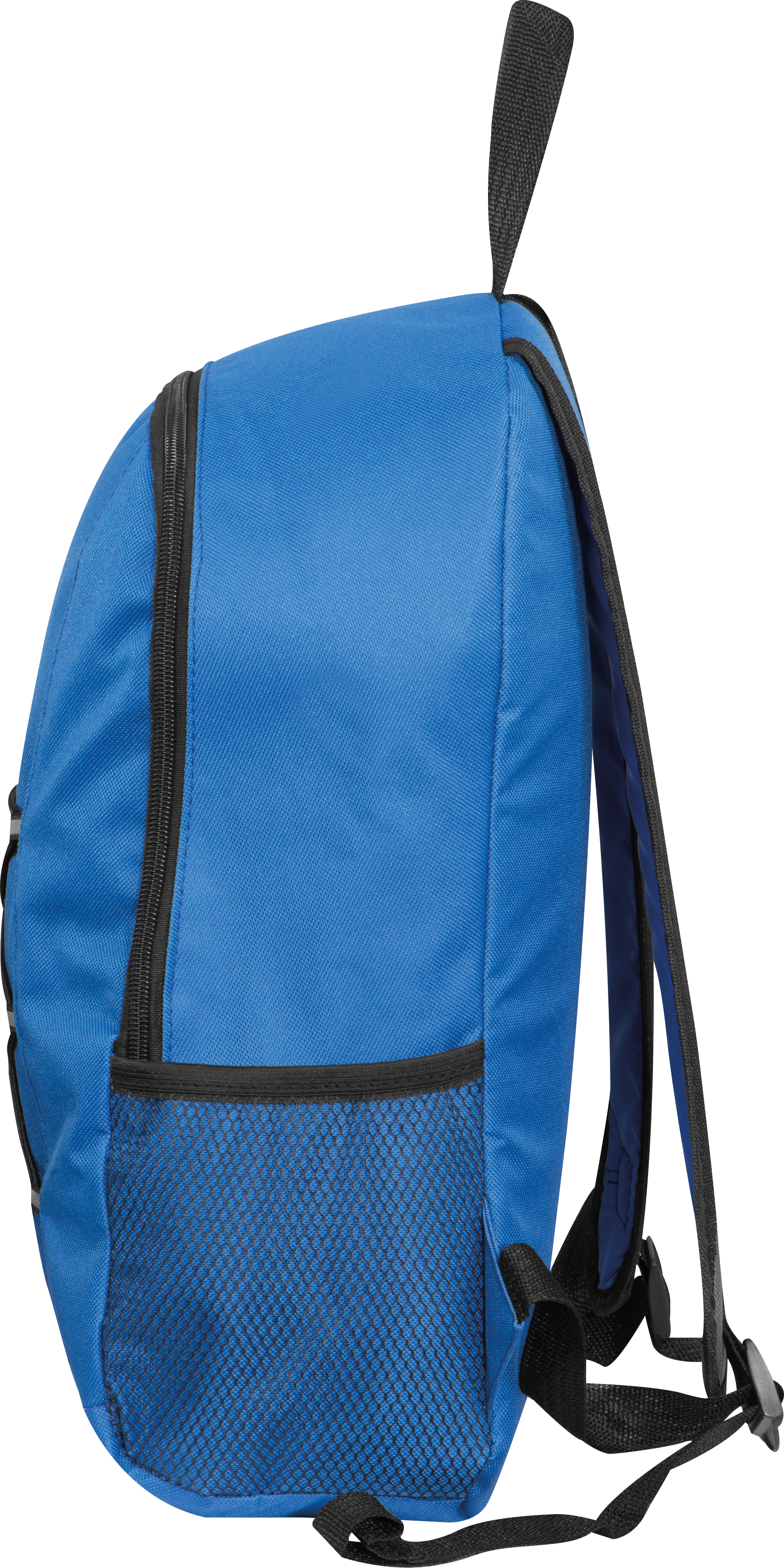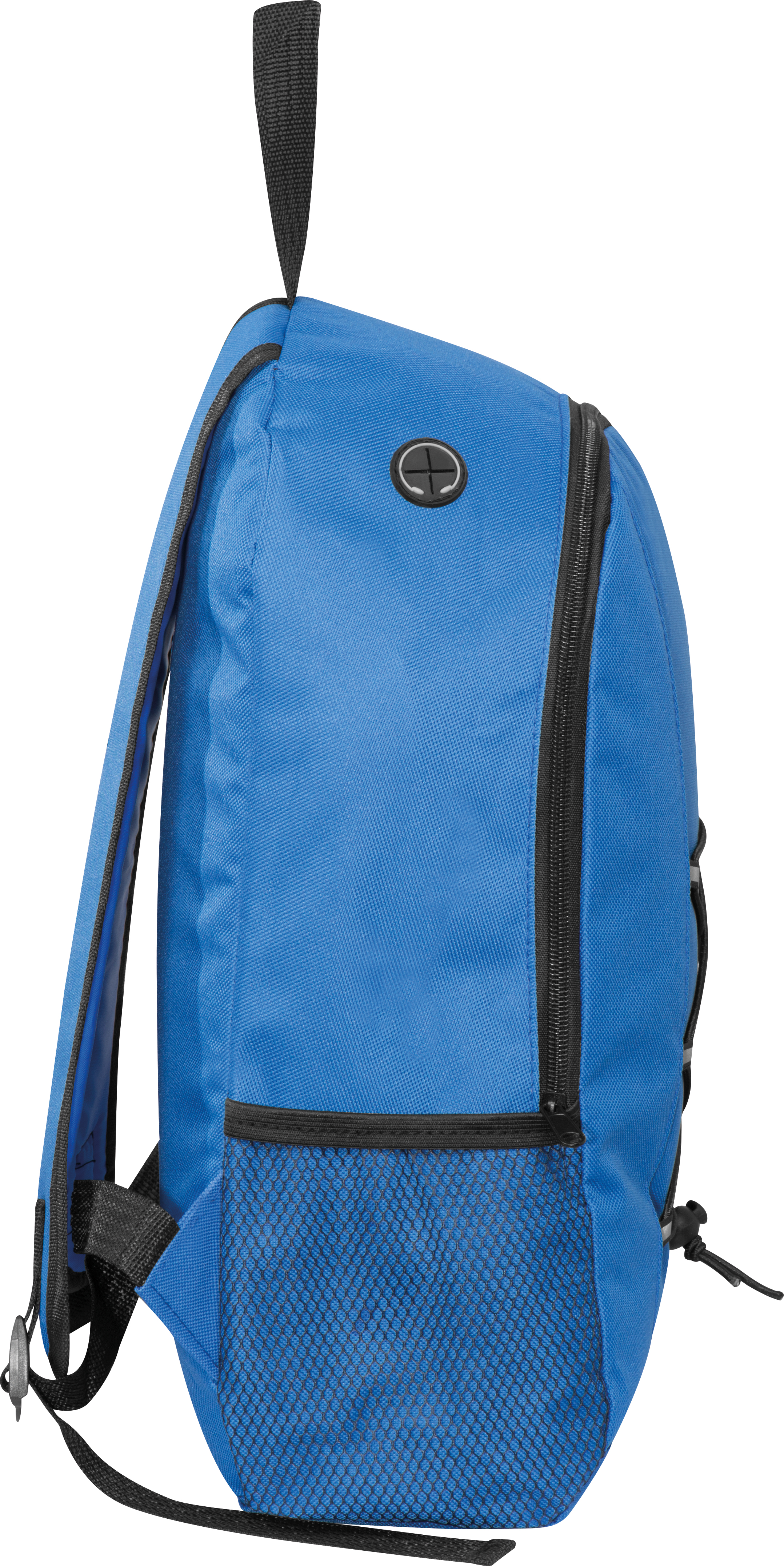 Plecak wykonany z poliestru 600D, pochodzącego z recyklingu. Plecak posiada uchwyt do przenoszenia, dwie siatkowe kieszenie boczne i watowane szelki.