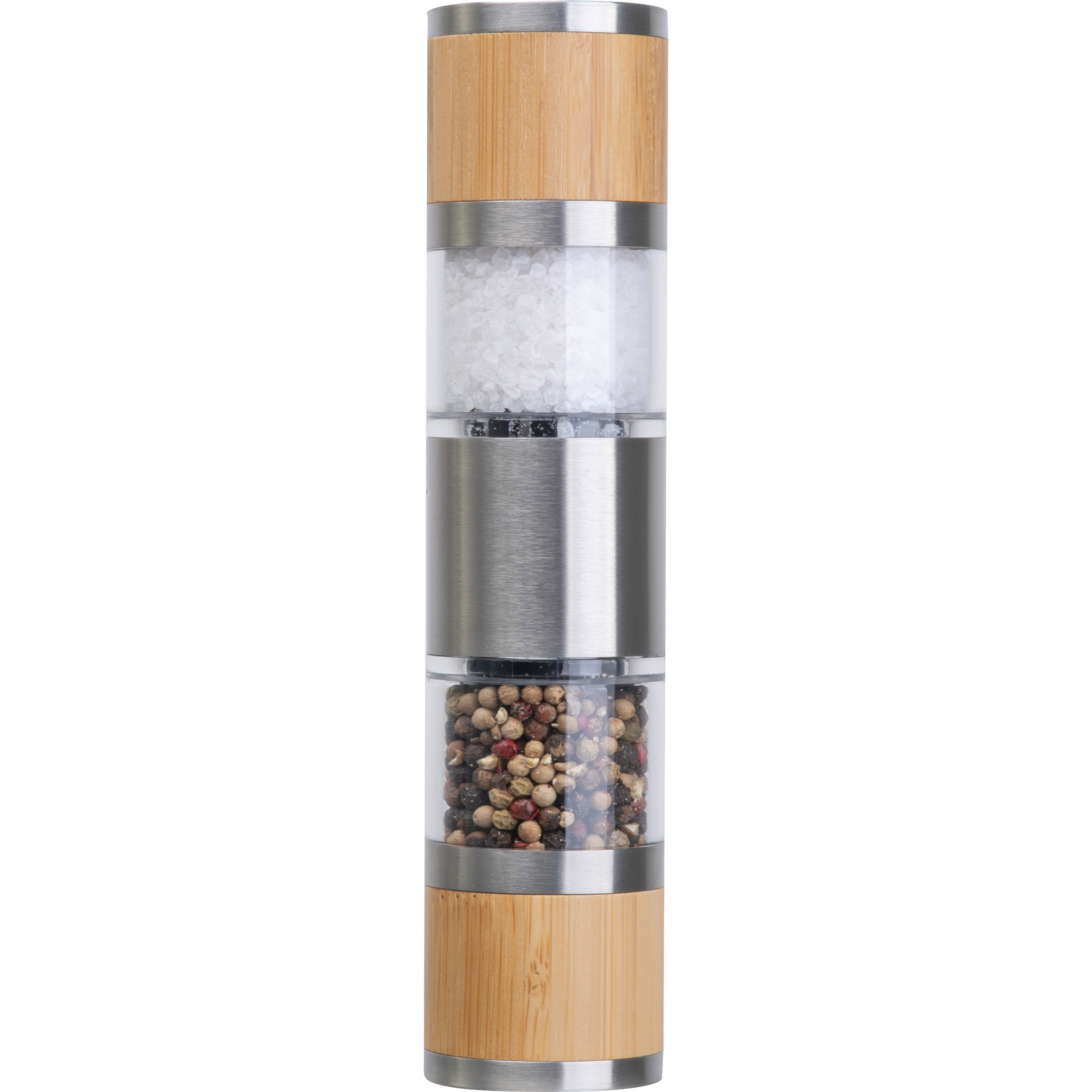 Ręczny młynek do soli i pieprzu wykonany z drewna bambusowego i stali nierdzewnej, z wytrzymałym ceramicznym mechanizmem mielącym.
