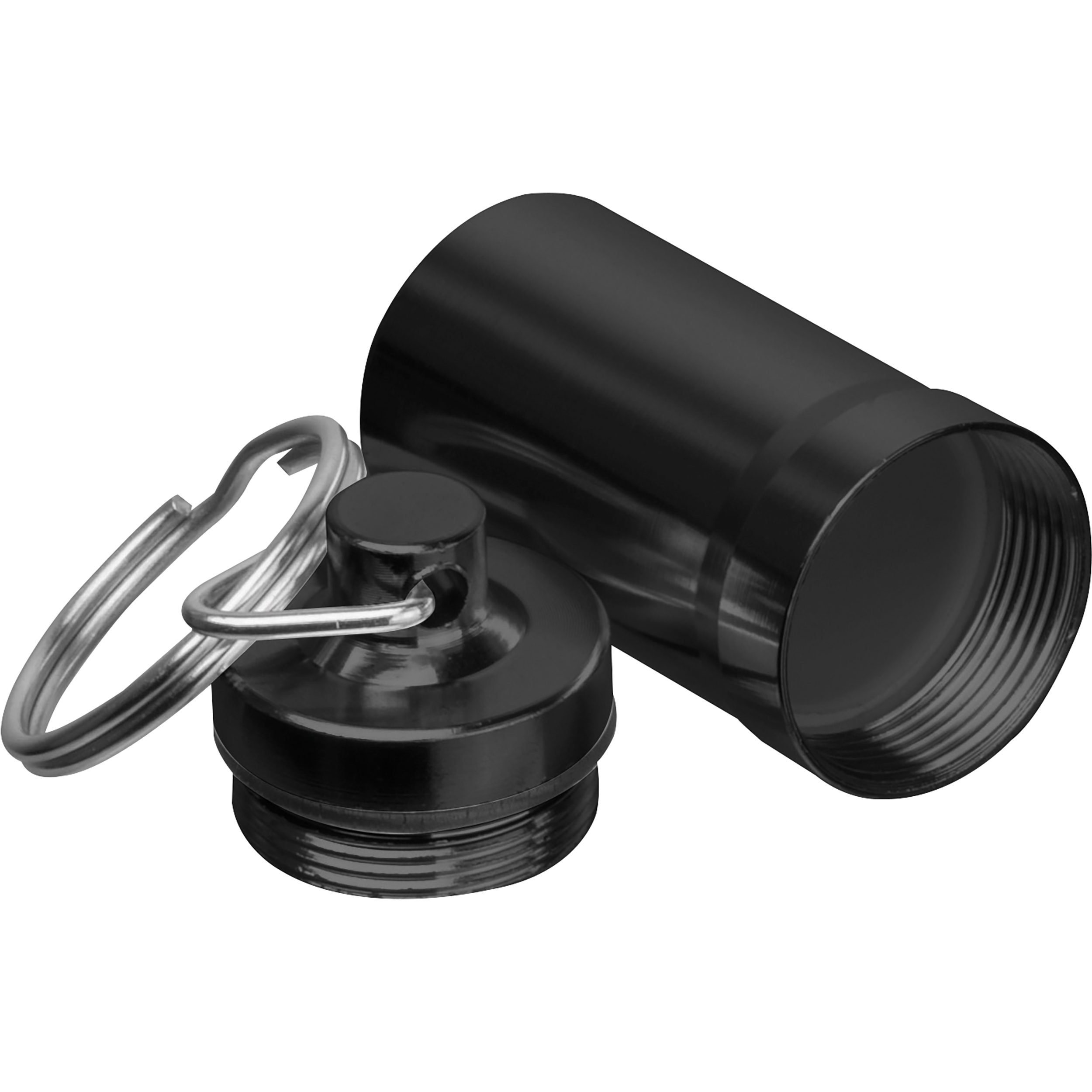 Brelok pojemnik z zewnętrzną powłoką ze stali nierdzewnej oraz wnętrzem z tworzywa sztucznego. Idealny do bezpiecznego przechowywania drobnych przedmiotów w podróży.