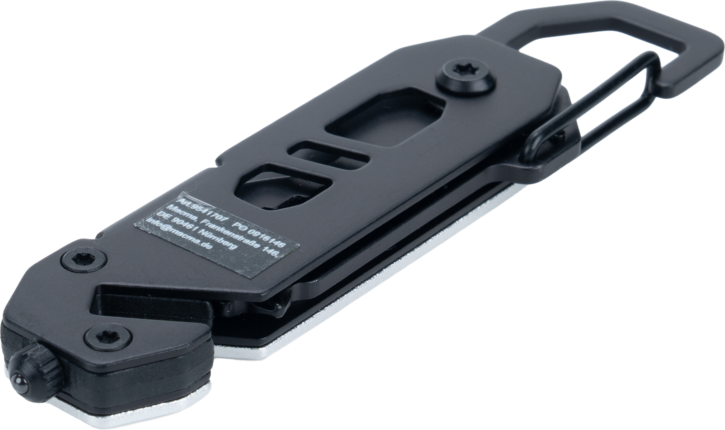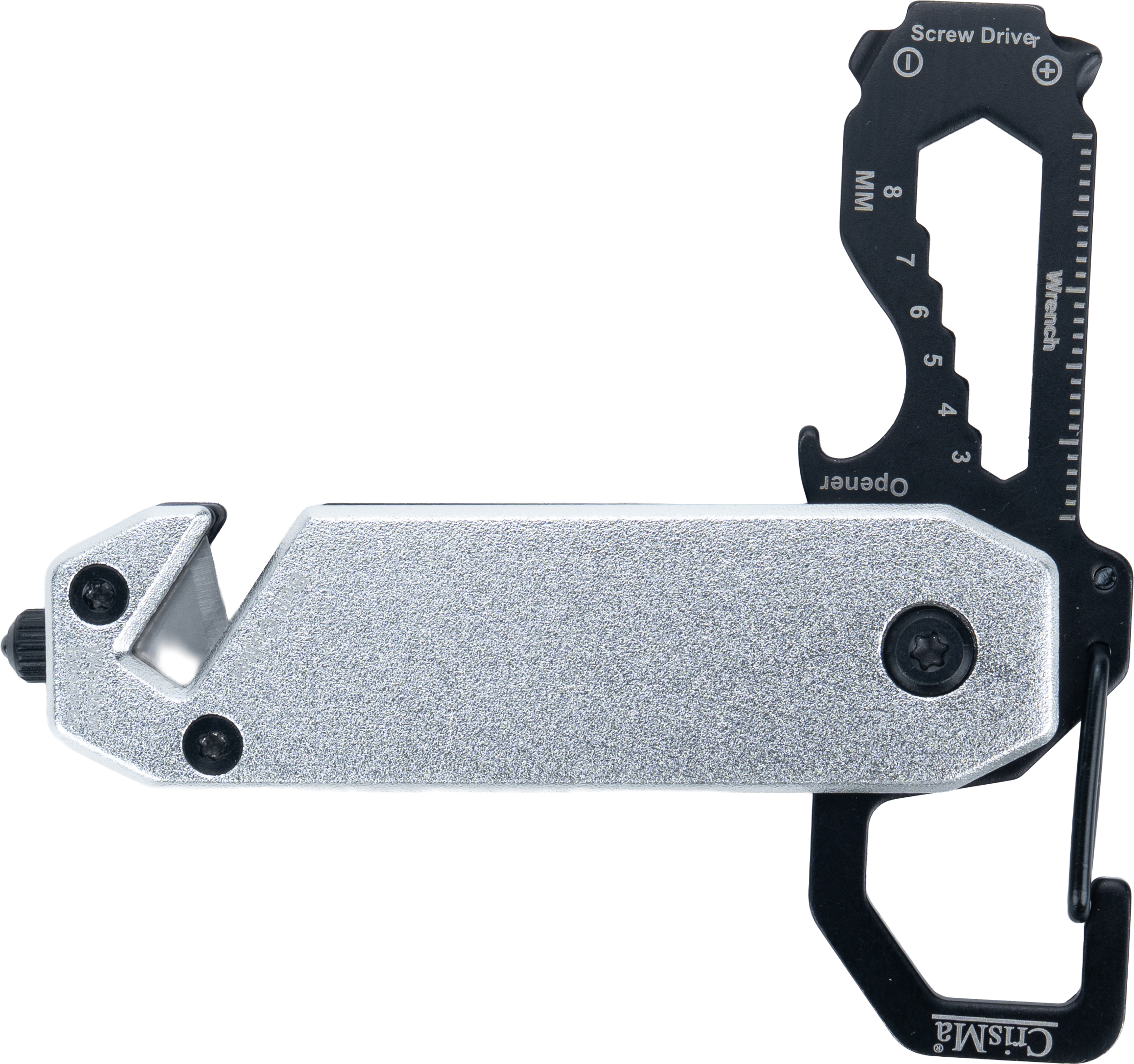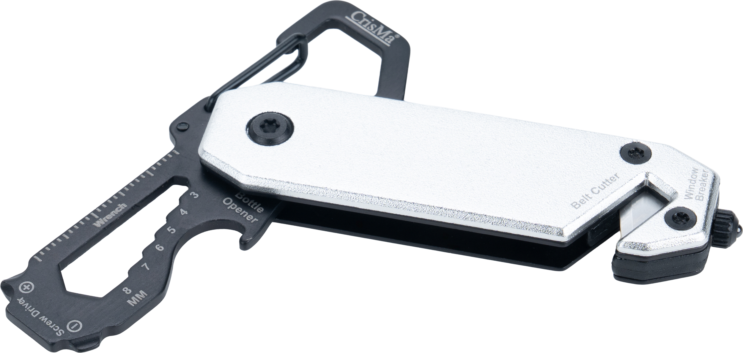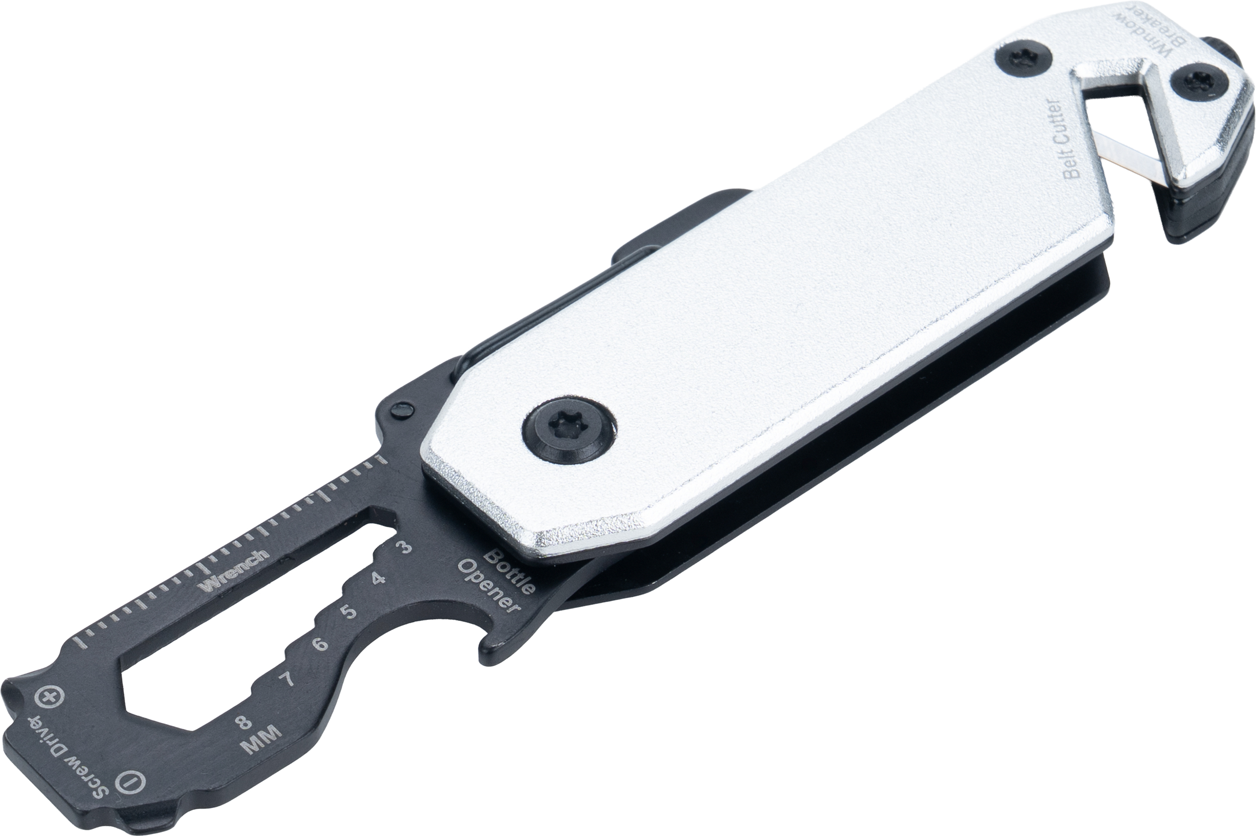 Multitool z aluminiową obudową i narzędziami ze stali nierdzewnej. Wyposażony w klucze płaskie 3–8 mm, śrubokręt krzyżakowy, śrubokręt płaski, karabińczyk, otwieracz do butelek, przecinak do pasów bezpieczeństwa oraz młotek bezpieczeństwa do rozbijania szyb.
