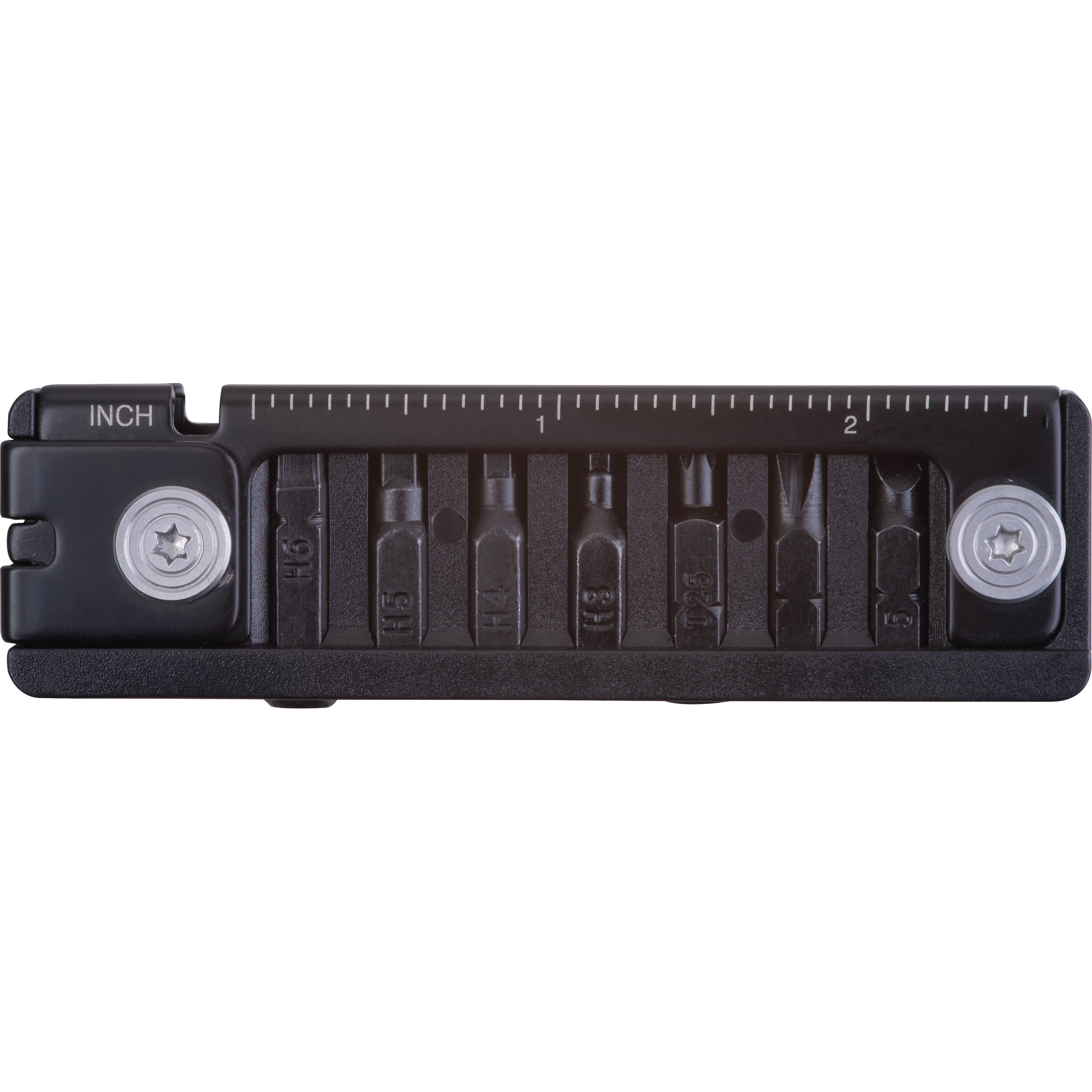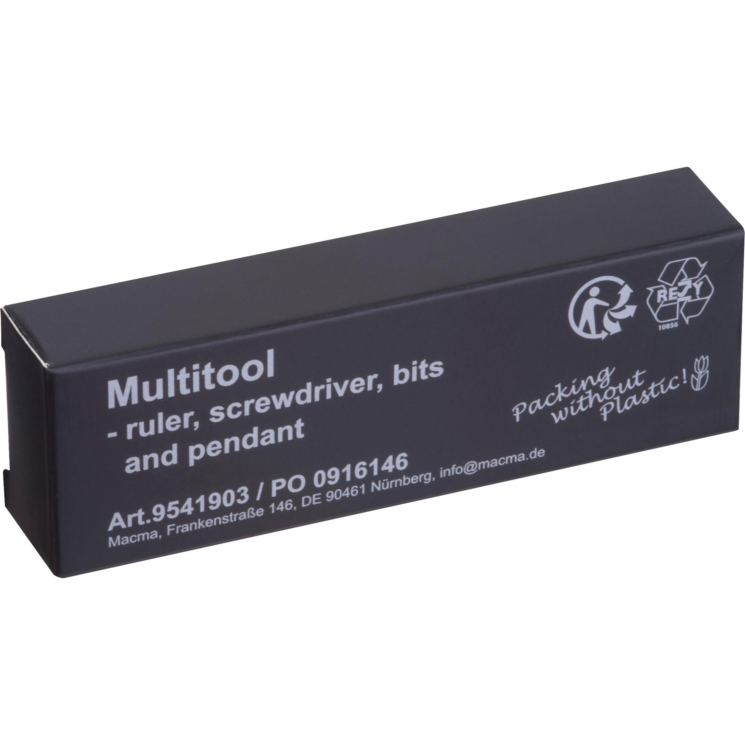 Multitool ze stali nierdzewnej wyposażony w klucze sześciokątne H3/H4/H5/H6, bit T25, wkrętak krzyżakowy PH2, płaski oraz linijkę. Kompaktowy i wielofunkcyjny.