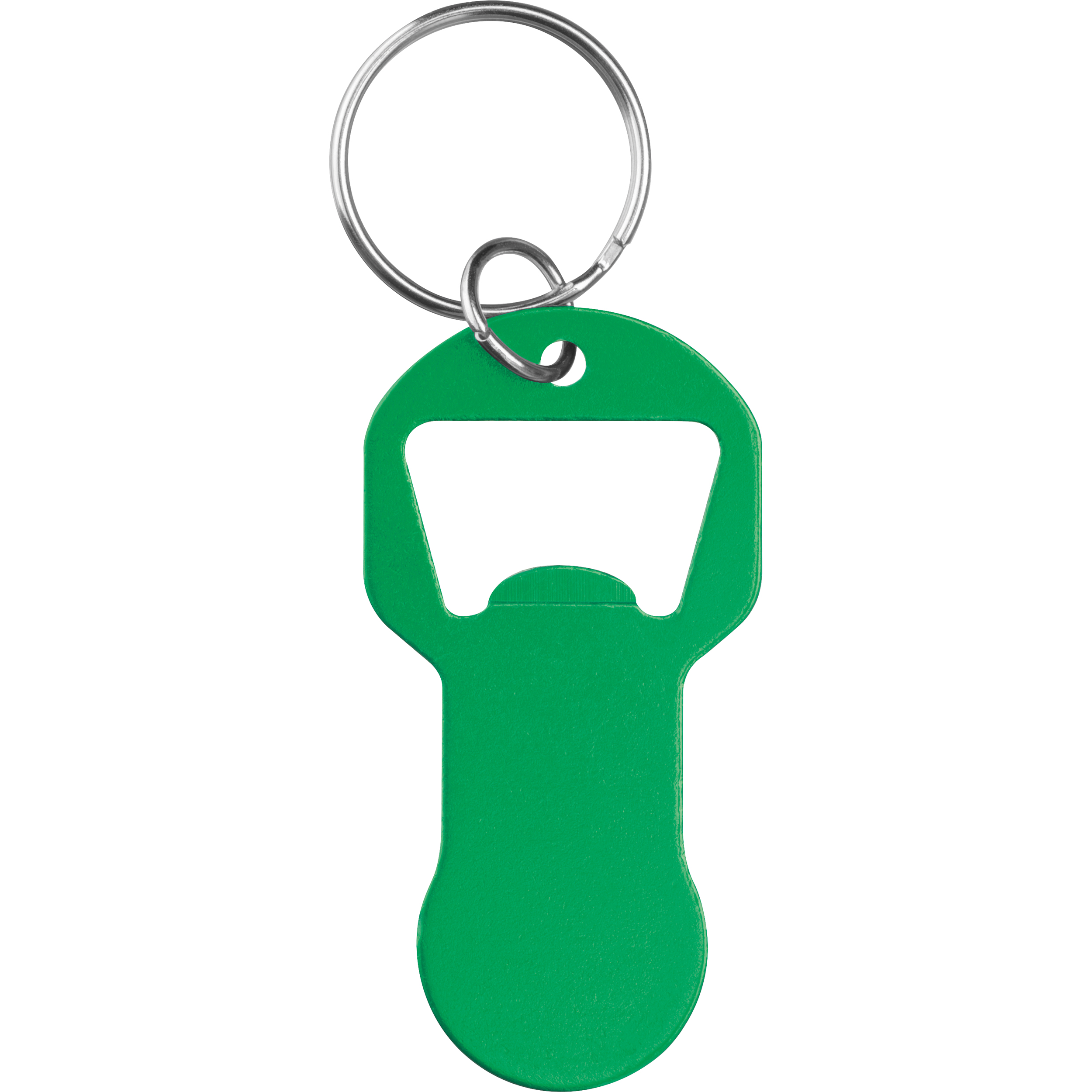 Brelok do kluczy wykonany z aluminium z recyklingu, wyposażony w otwieracz do butelek oraz żeton do wózka sklepowego. Lekki, praktyczny i doskonały do codziennego użytku.