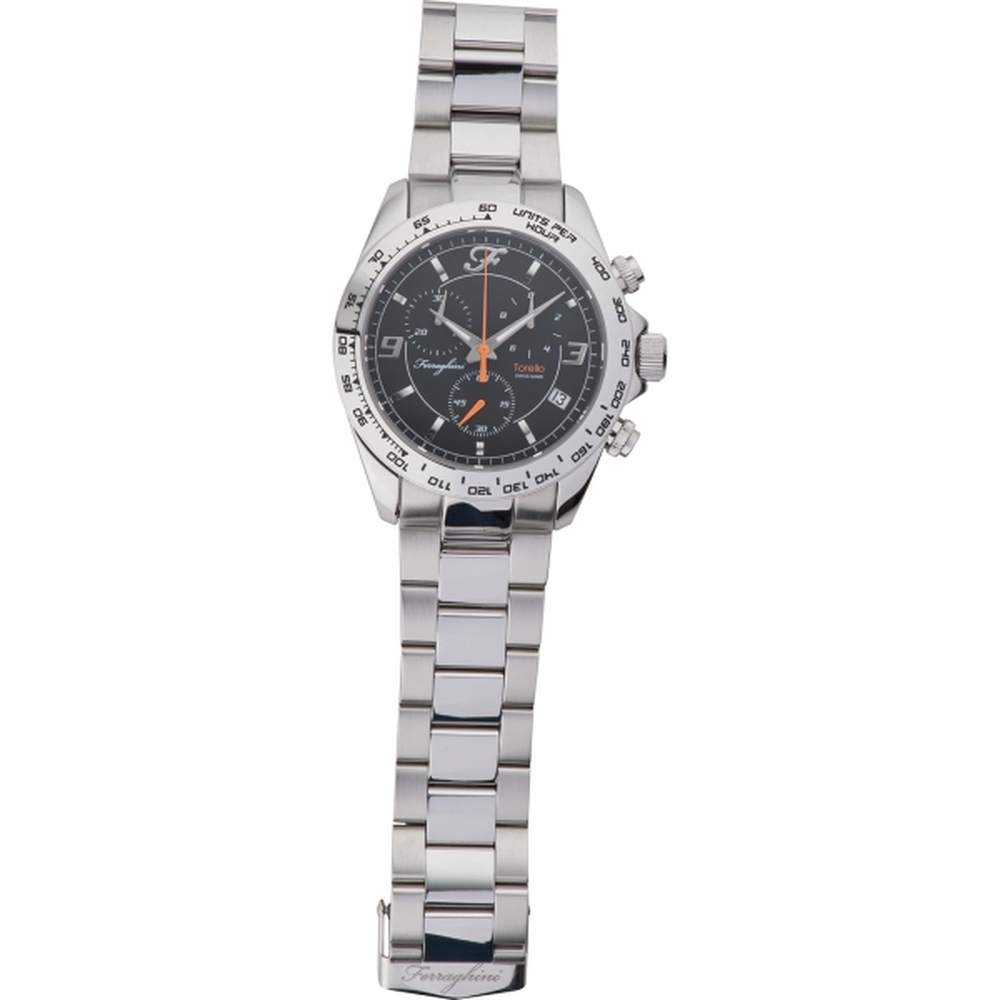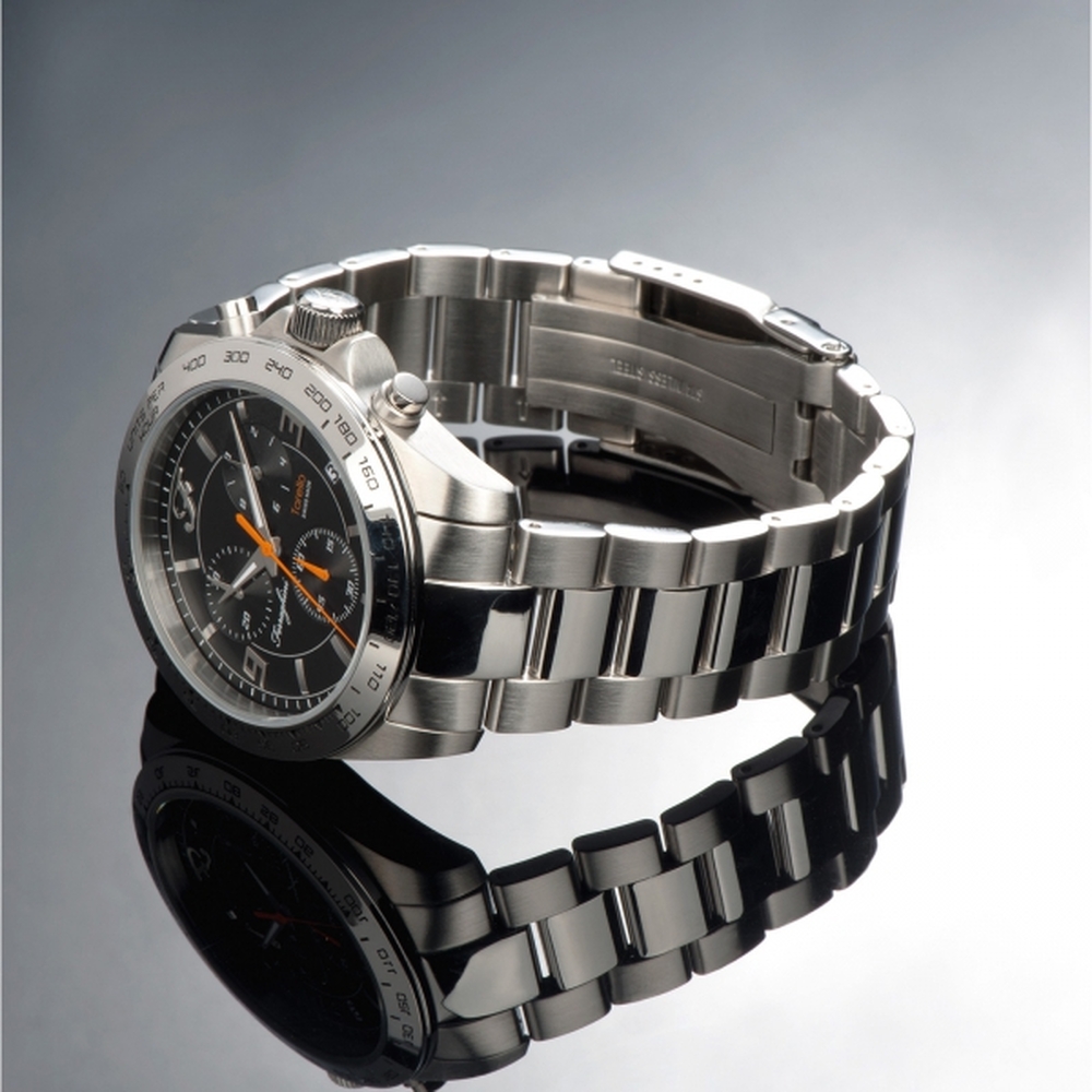 Zegarek TORELLO z mechanizmem kwarcowym. Posiada dużą (42mm.), wykonaną z hipoalergicznej stali nierdzewnej kopertę oraz wiele funkcji: wodoszczelność do 100m. (10ATM), tachometr, stoper oraz wskaźnik daty. Jego tarczę chroni odporne na zarysowania szkiełko szafirowe. Bransoleta, wykonana ze stali nierdzewnej posiada wygodne zamknięcie na zatrzask.
