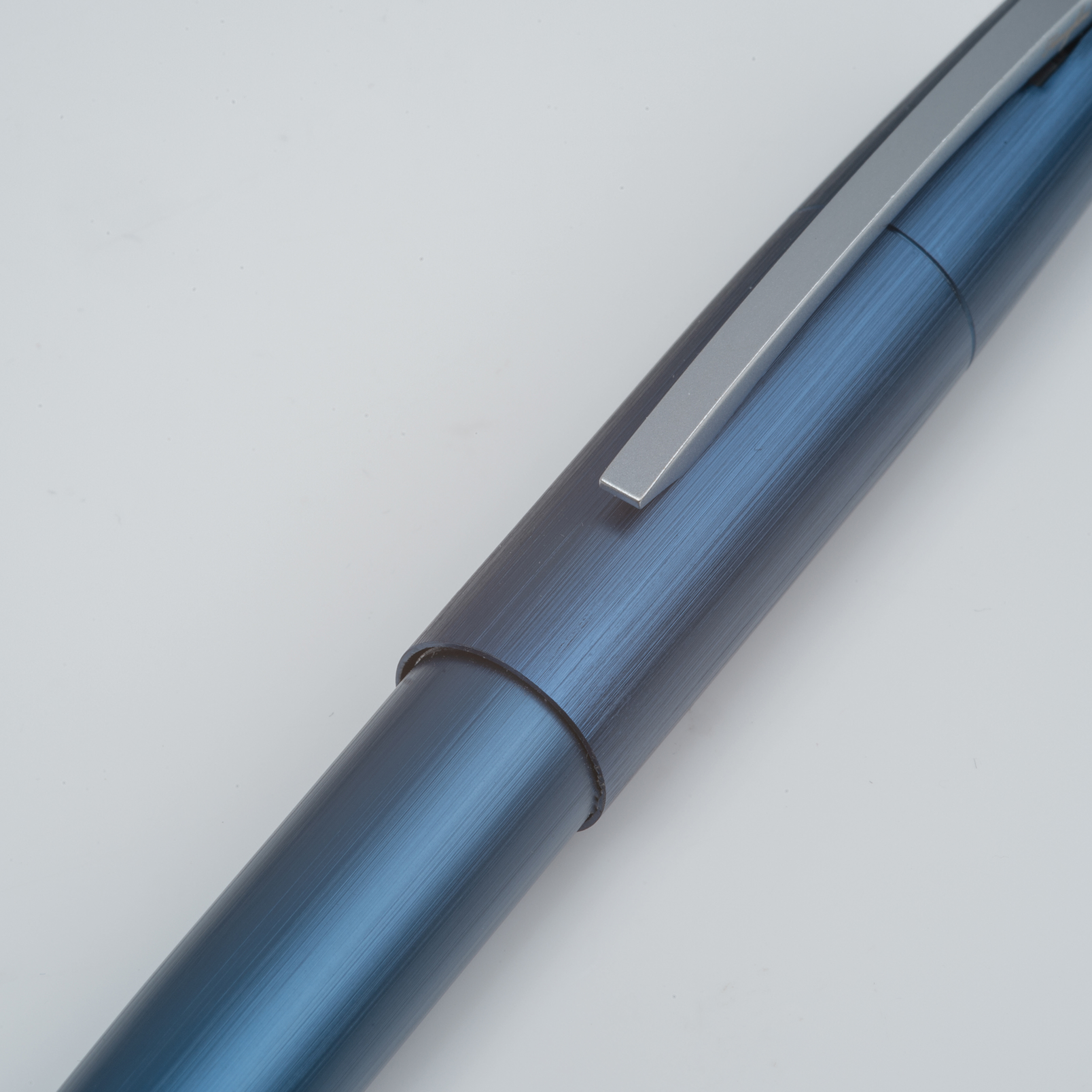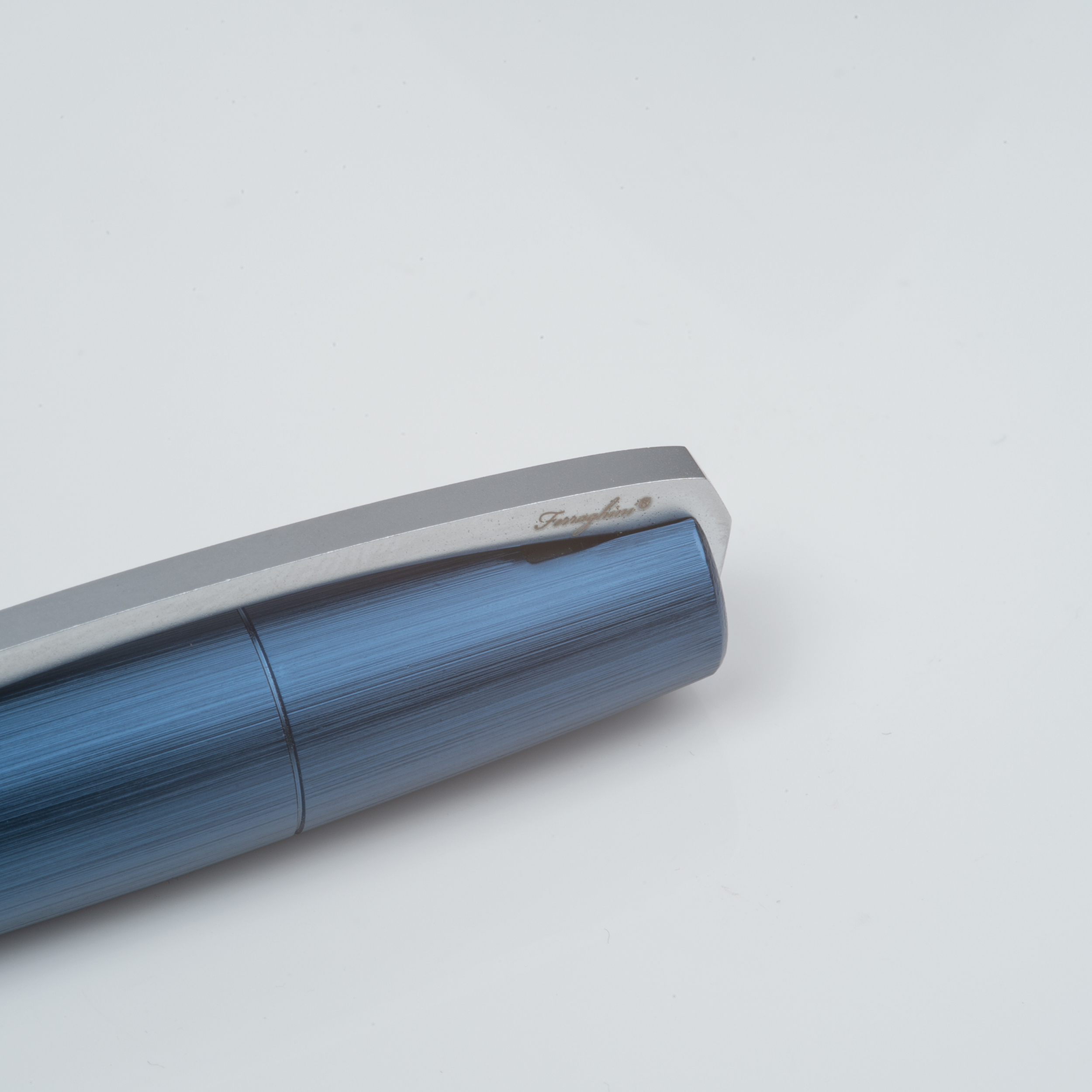 Przekręcany, metalowy długopis marki Ferraghini, ze srebrnymi akcentami i dużym wkładem piszącym na niebiesko.