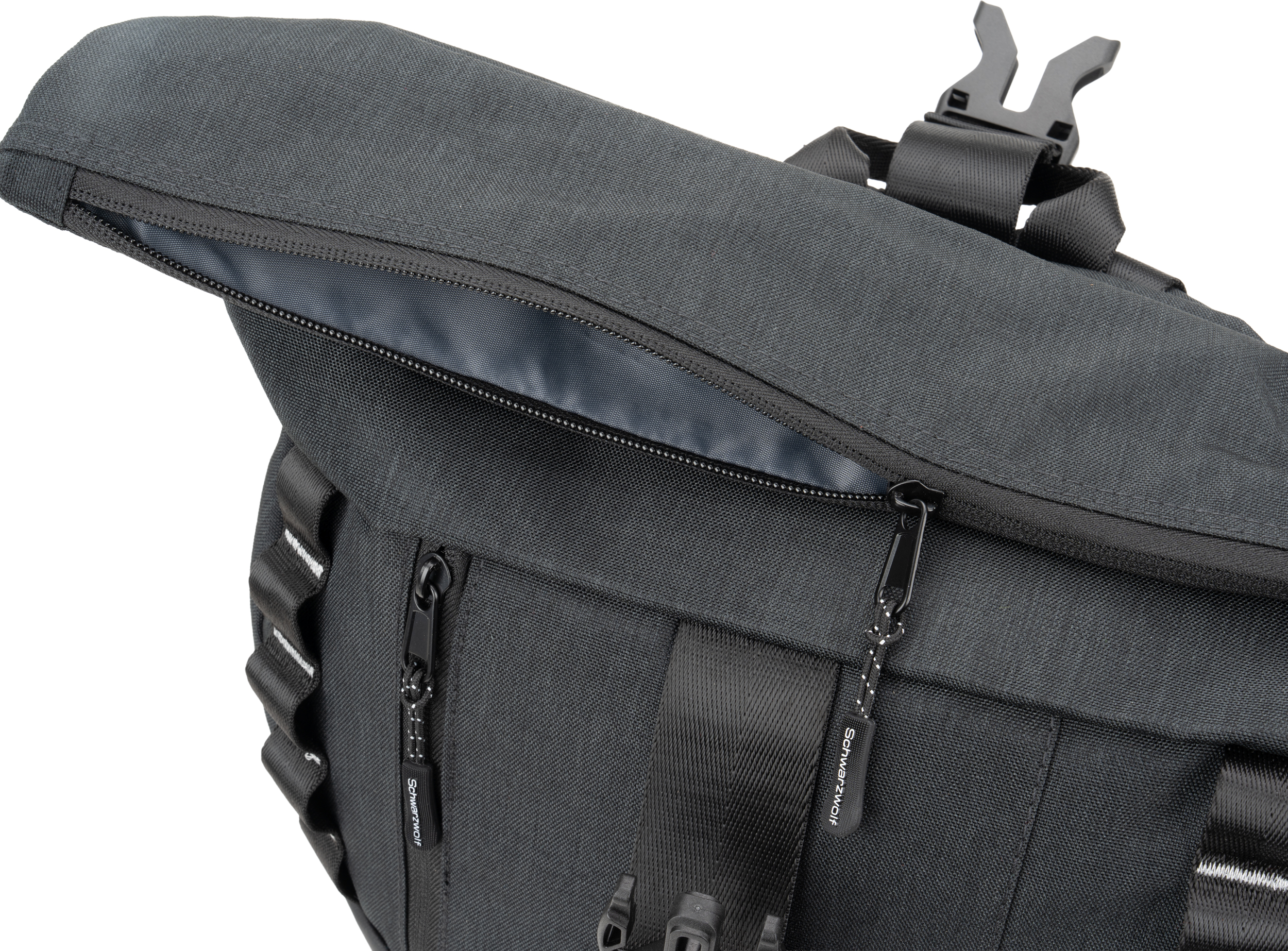 Plecak ze zwijanym zamknięciem, z watowanymi szelkami i plecami, wyposażony w dużą komorę główną z jedną oddzielną kieszenią i mniejszą kieszonką na akcesoria. Z przodu plecaka znajduje się mała kieszonka zamykana na zamek, po bokach dwie siatkowe kieszenie i jedna mała kieszonka z tyłu. Po zrolowaniu górnej części plecaka całość zamykamy dwoma paskami z plastikowymi klamerkami - tak zamknięty plecak będzie miał pojemność 25l. Plecak można również zamknąć bez rolowania, na zamek błyskawiczny - wtedy pomieści 32l.