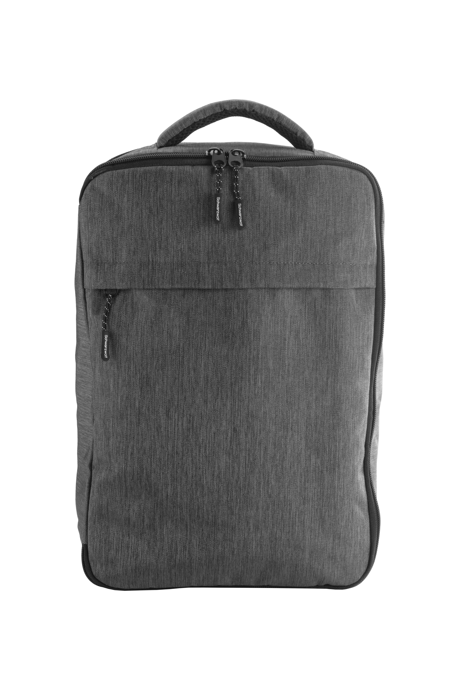 Szary plecak podróżny, wyróżniający się konstrukcją przypominającą walizkę podróżną, nadaje się jako bagaż podręczny do samolotu. Wewnątrz znajduje się komora z dużą kieszenią z siatki zapinaną na zamek oraz dodatkową kieszenią z siatki na zamek. Na zewnątrz plecak posiada przednią kieszeń na zamek, tylną kieszeń na laptopa zapinaną na zamek, rozszerzany zamek zwiększający pojemność plecaka oraz pasek. Plecak ma wyściełany system nośny i szelki na ramiona. Wyposażony jest także w uchwyt do przenoszenia.