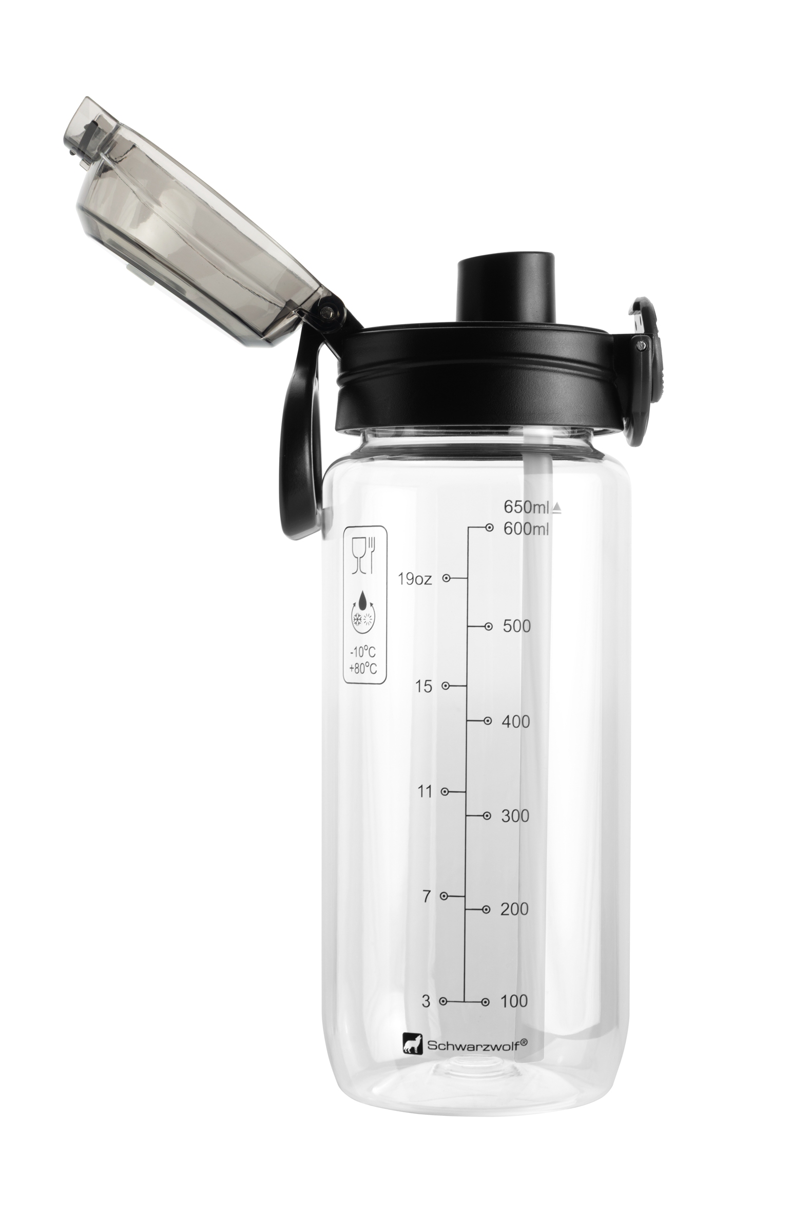 Sportowa butelka Schwarzwolf wykonana z tritanu, w kolorze przezroczystym, z czarną zakrętką i uchwytem do zawieszania. Pojemność butelki wynosi 650 ml, a jej konstrukcja wspiera zdrowy styl życia, ponieważ nie zawiera BPA. Oferuje dwa sposoby picia: przez ustnik lub słomkę. Nadaje się do napojów zimnych i ciepłych w zakresie temperatur od -10°C do 80°C.
