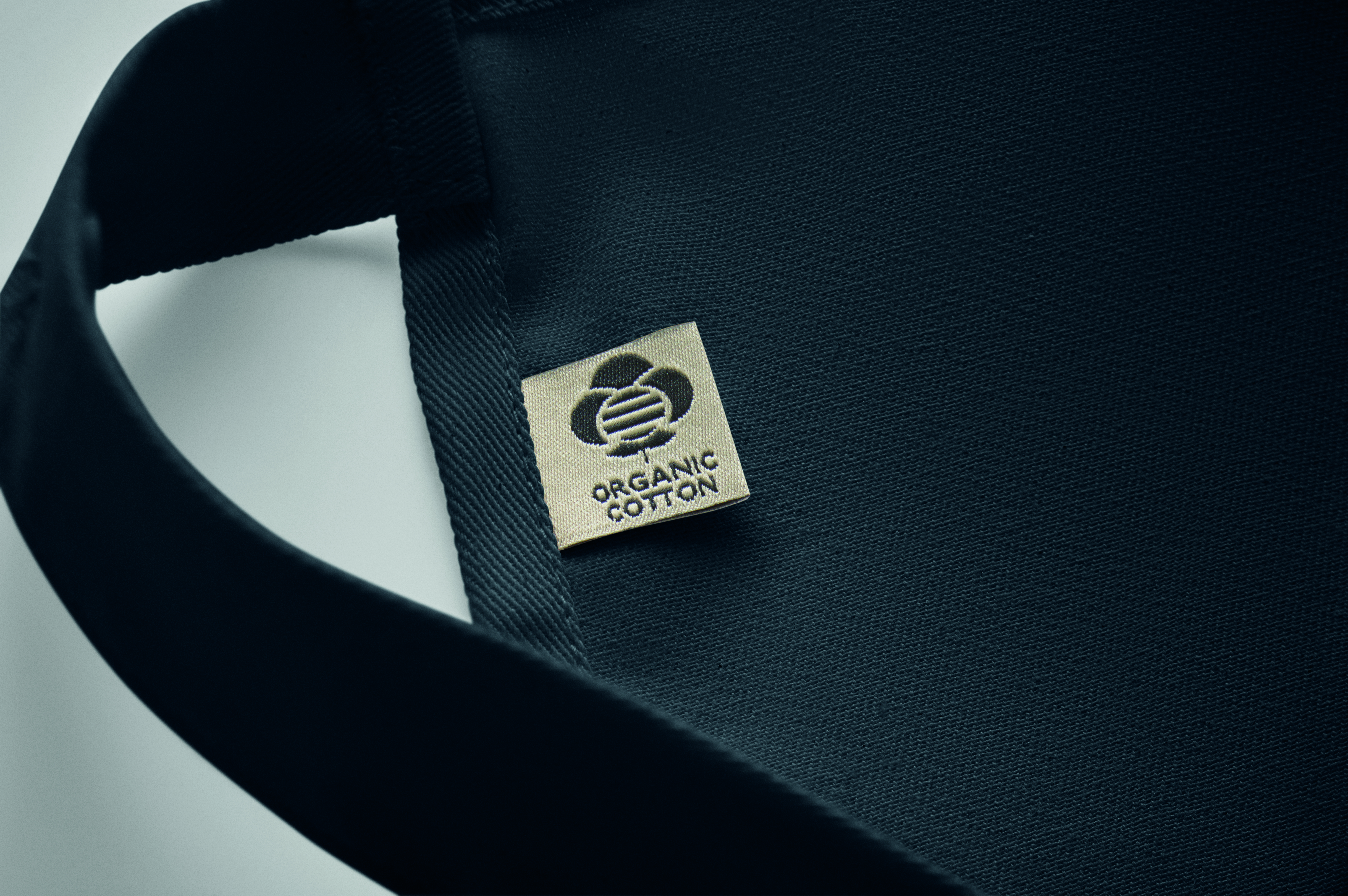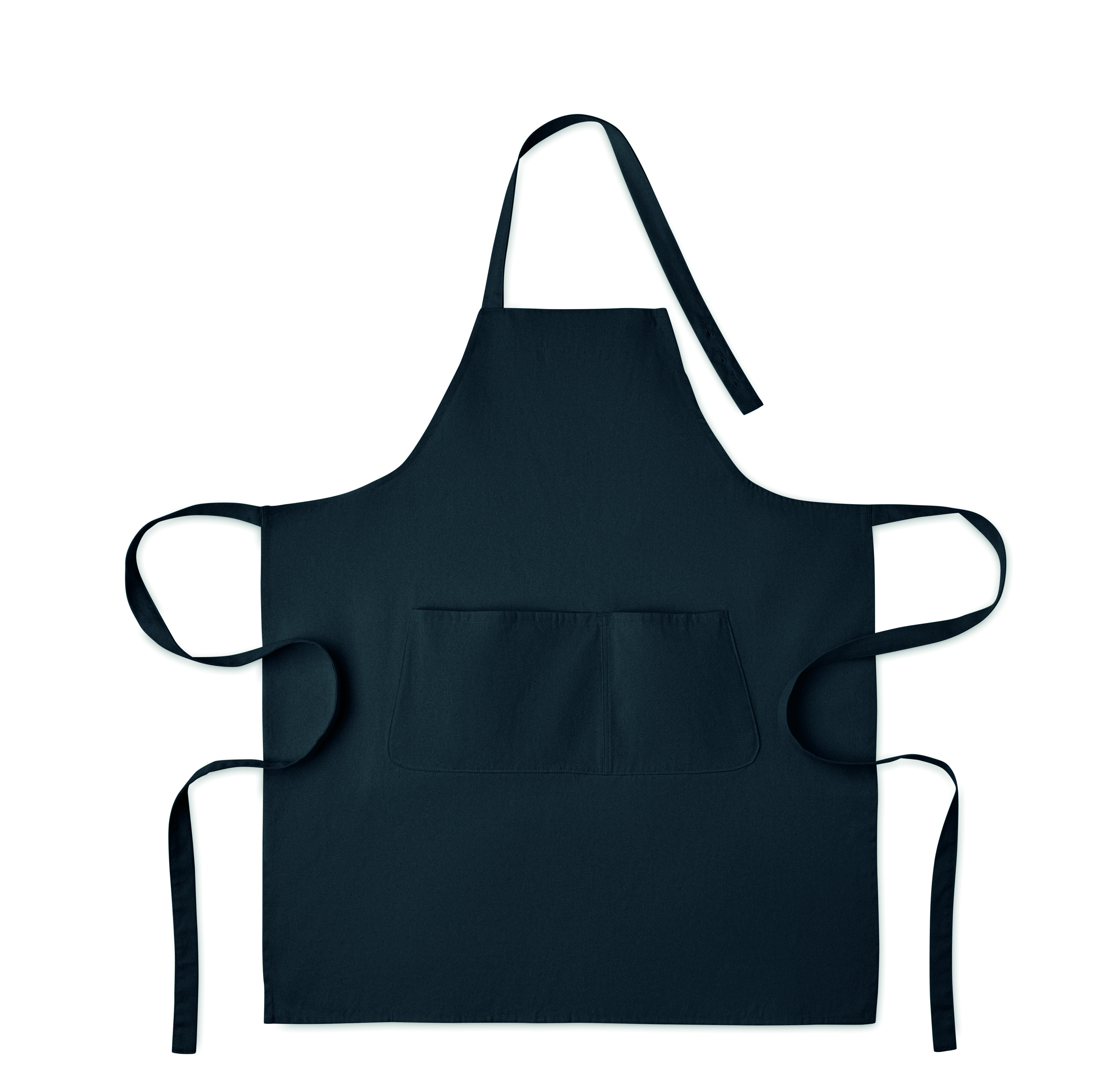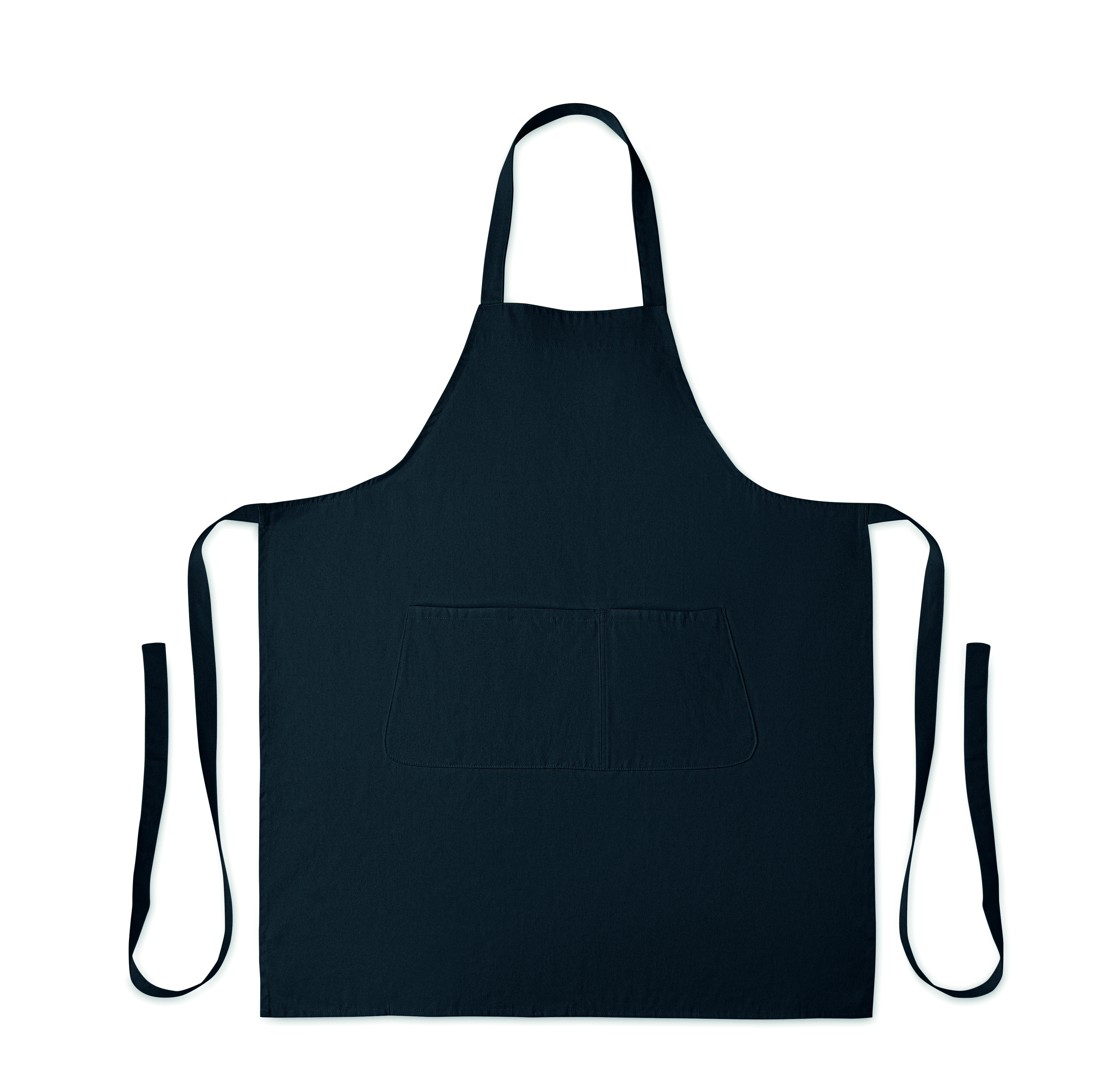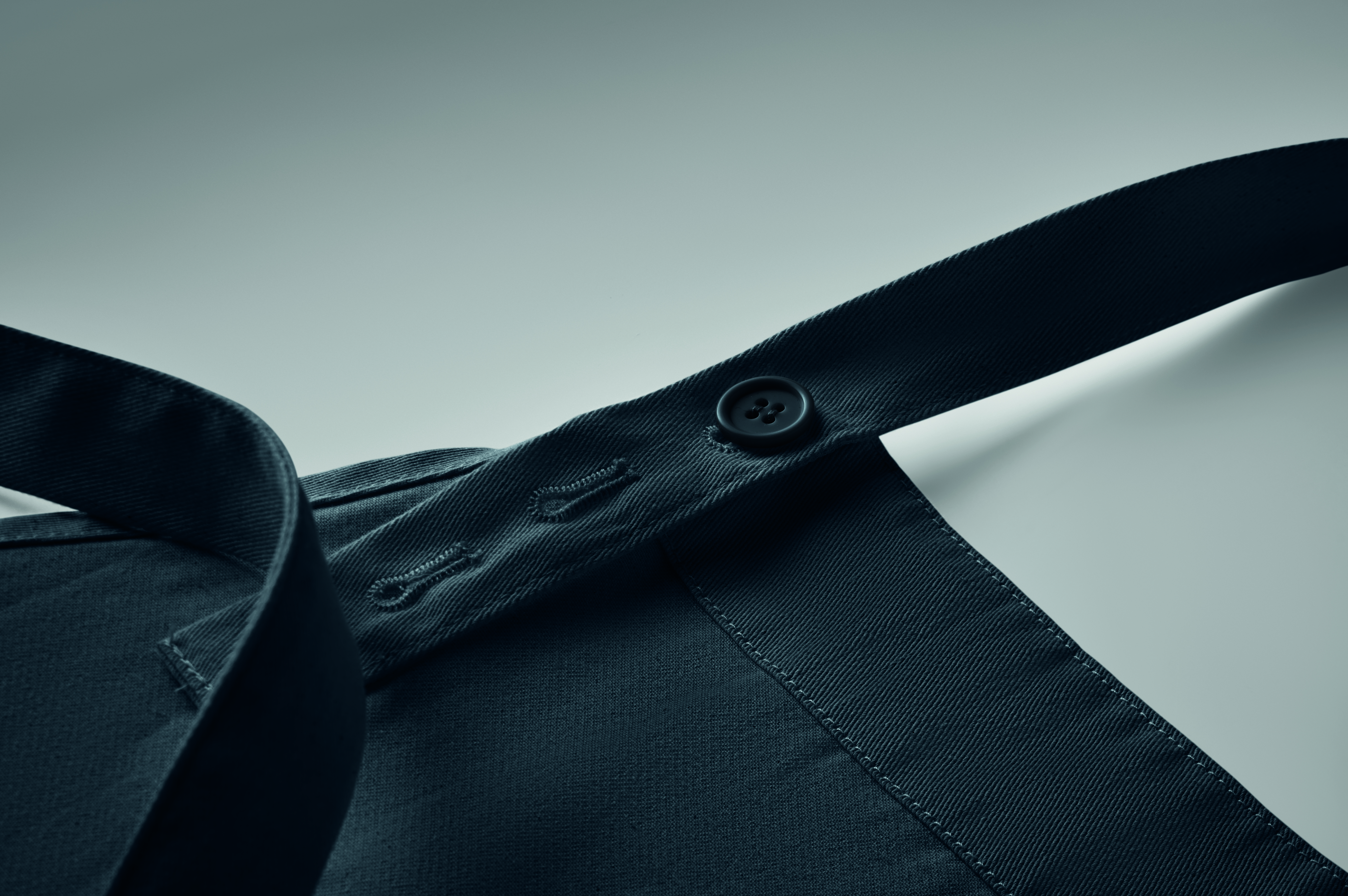 Fartuch z 1 dużą kieszenią z przodu i 2 przegrodami z bawełny organicznej 240 gr/m². Regulowane zapięcie na guzik na pasku na szyję.