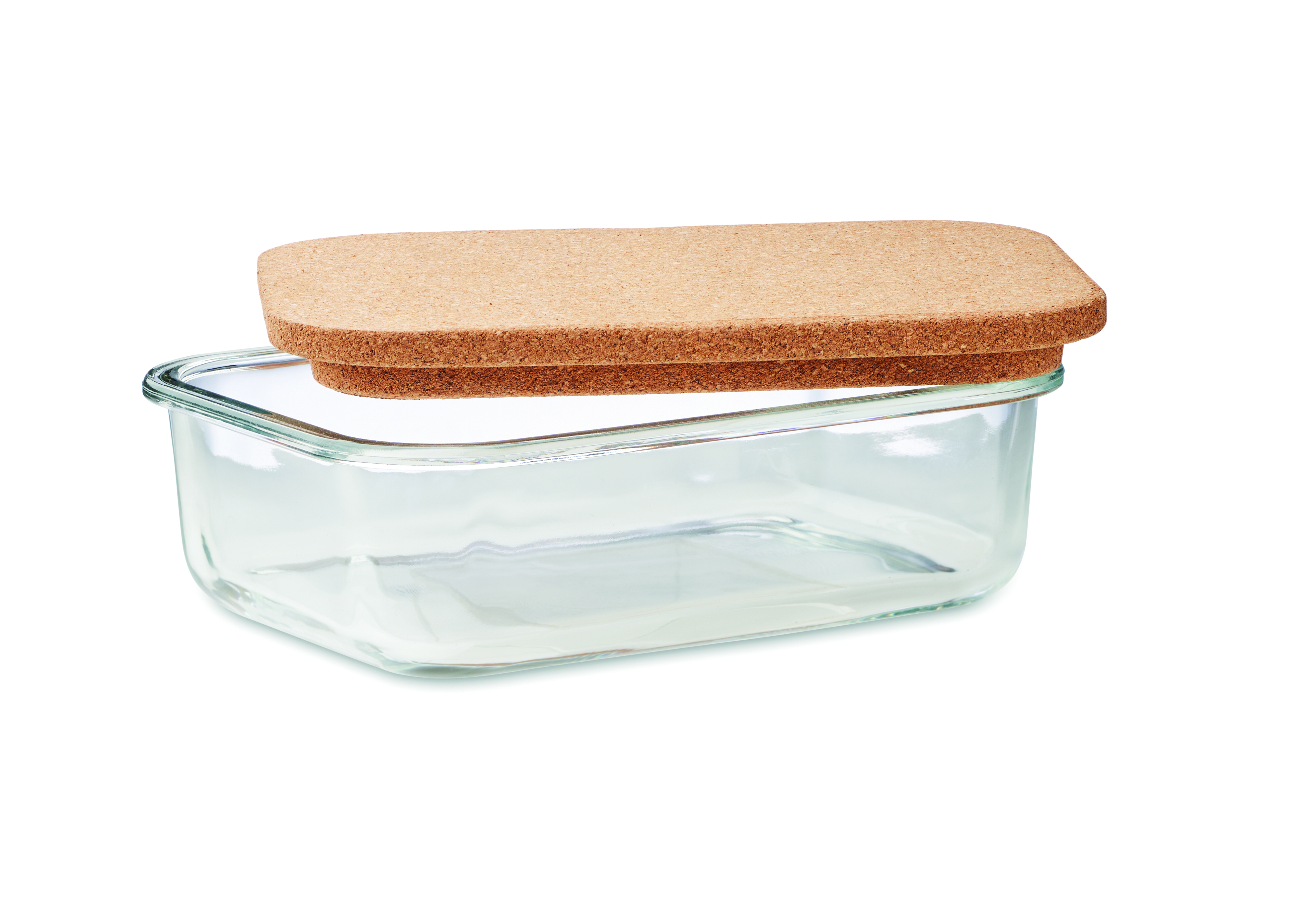 Pojemnik na lunch ze szkła borokrzemowego z korkową pokrywką i silikonową opaską. Pojemność: 830 ml.